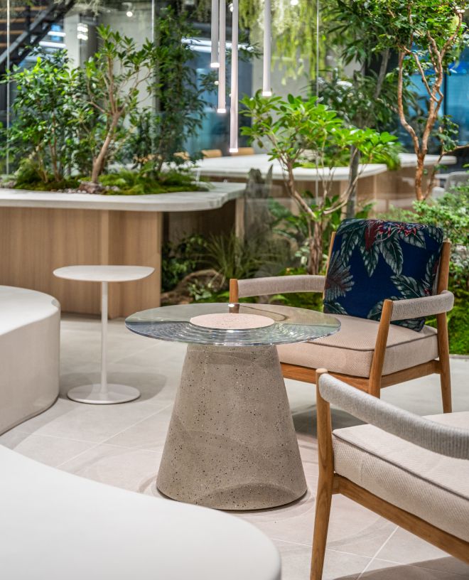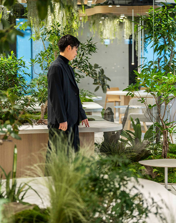 什器計画は、表現と機能が融合するインターフェースとなるよう設計されています。植栽もそれぞれの“流域”に応じて異なり、上流では苔むした深緑、中流は都市的な広葉樹、下流は海辺の植生を模して構成。こうした細やかな設計意図が、空間全体に“自然のストーリー”を編み込んでいます。