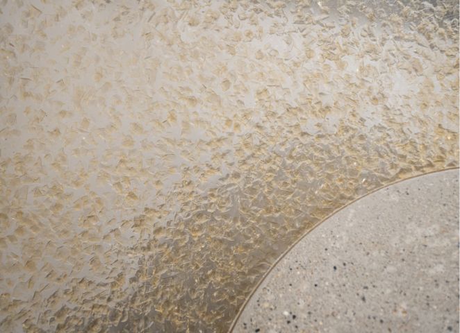 ▲ 左官に信濃川の砂を混ぜ込んだ板材サンプル。上流は粒が大きな砂、下流側には粒が小さい砂、最下流のベンチにはアコヤ貝の貝殻を混ぜ、川から海への繋がりを表現。中流・下流に合わせて粒子の大きさを変え、試作は数十枚に及び、微細な表現までこだわり抜かれている。