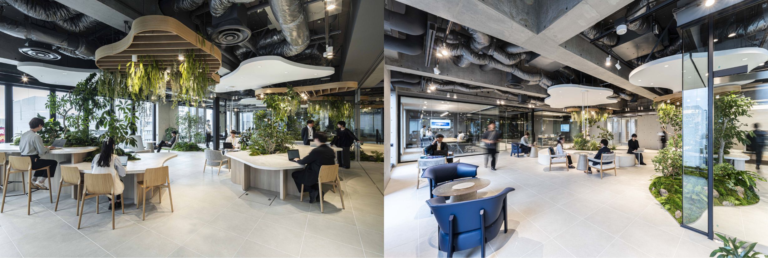 特にこのプロジェクトを象徴するのが、エネルギーの探鉱から供給までの過程を⽇本最⻑の⼤河、「信濃川」の水系になぞらえ、来客を迎える9階のサーキュレーションホール。 それは社内・社外エリアを横断しながら、上流・中流・下流のそれぞれの場所性、応接エリアや社内ワークラウンジ等、オフィスに求められる機能に応じて、グラデーションにその環境を変える。什器の高さ(ハイテーブル、通常テーブル、ベンチ)、左官で什器天板に混ぜ込んだ信濃川の川砂の粒の大きさ、流域ごとの植生を繊細に変えながら、新たなワークプレイスとしての循環が創造されました。