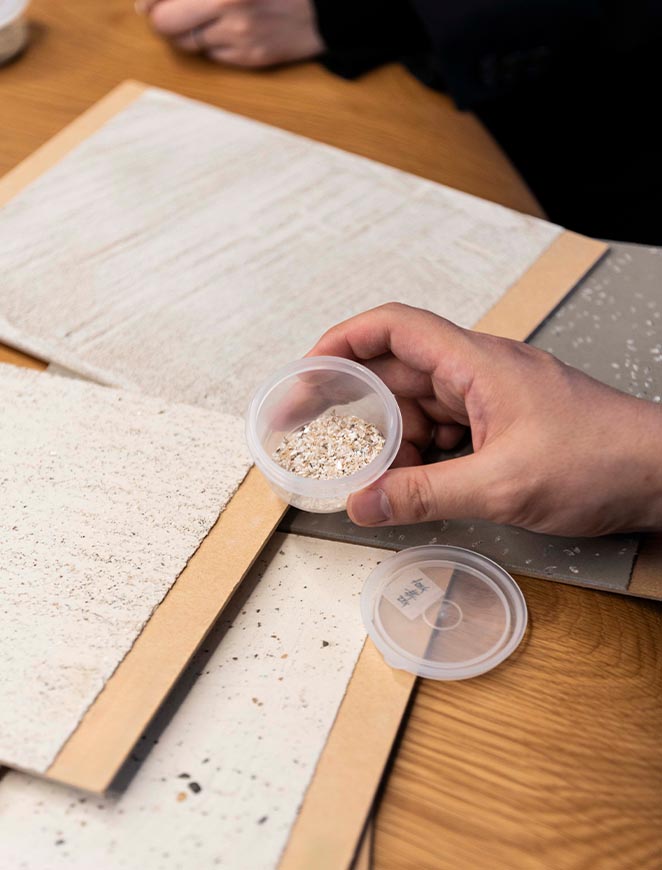 ◀︎ 左官に信濃川の砂を混ぜ込んだ板材サンプル。上流は粒が大きな砂、下流側には粒が小さい砂、最下流のベンチにはアコヤ貝の貝殻を混ぜ、川から海への繋がりを表現。中流・下流に合わせて粒子の大きさを変え、試作は数十枚に及び、微細な表現までこだわり抜かれている。