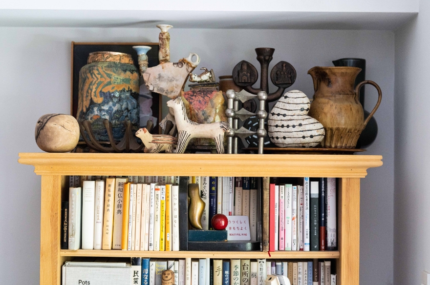 ▲本棚の上にびっしりと並ぶオブジェたち。たくさんあっても、要所要所まとまりで見せることよって不思議と気持ちの良い空間が出来上がっています。