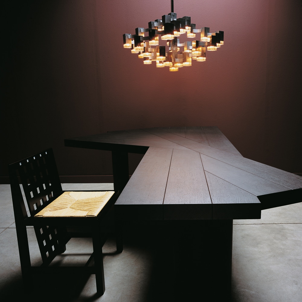 サボアの メリベルにある、シャルロット・ペリアン自身の別荘のために1972年にデザインされたテーブルです。 天板を構成する14枚の板と3本の脚が独特の位置にセットされていることで、ダイナミックでフレキシブルな新しいテーブルの使い方を提案しています。複数の人が自由な感覚でテーブルを囲んでコミュニケーションを図ることができるように意図されたデザインです。この画期的な意匠はペリアン独自のライフスタイルをも見事に表現していると言えるでしょう。