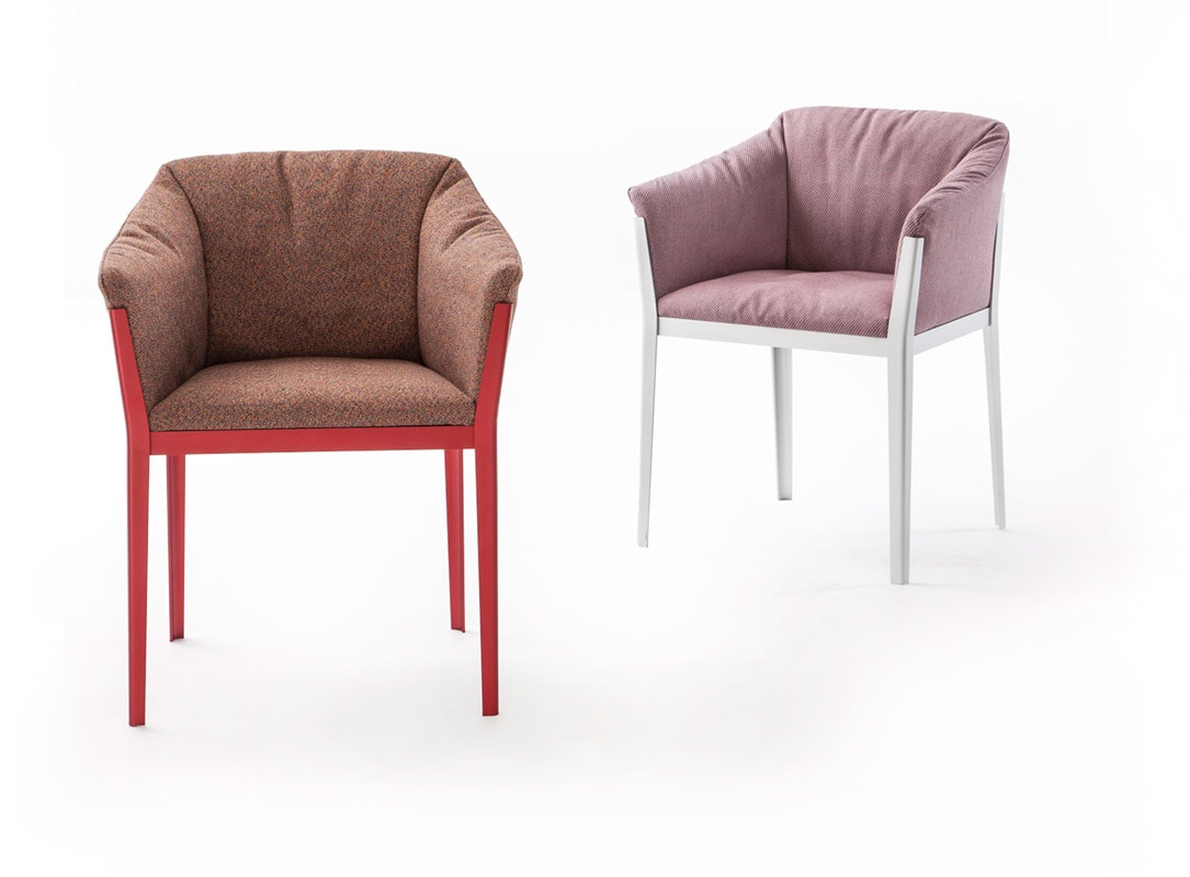 家族の記憶を描いたカッシーナの過去のカタログからインスピレーションを受け、デザインされました。フェザーキルトを用いたシート部分はソファのようにふんわりと包み込むような座り心地で、ダイニングについ長居してしまうような快適さをもたらします。ミニマルなフレームは6色展開で、レザーやファブリックなど様々な張地を合わせることができ、お好みに合わせた楽しいダイニング空間を演出します。