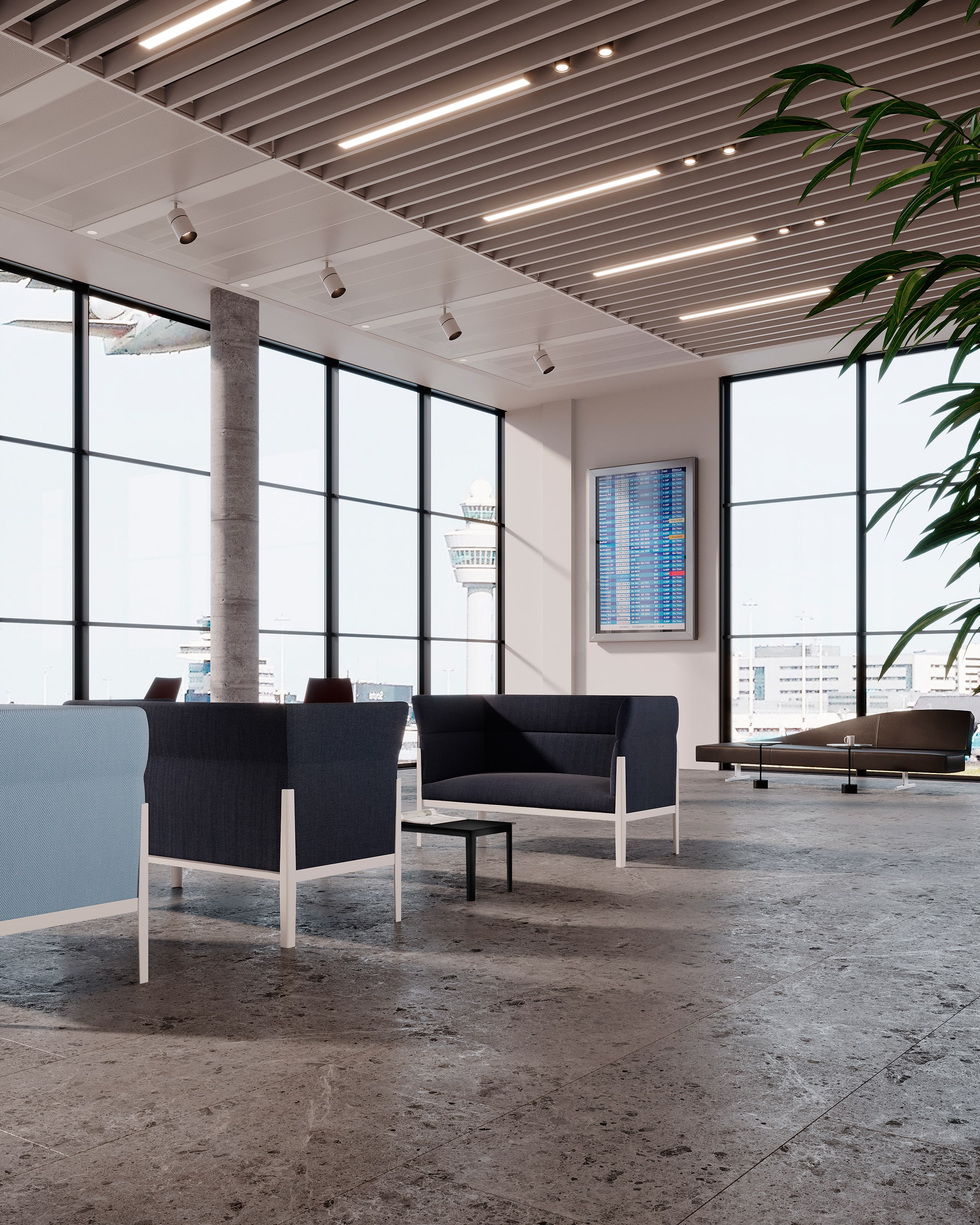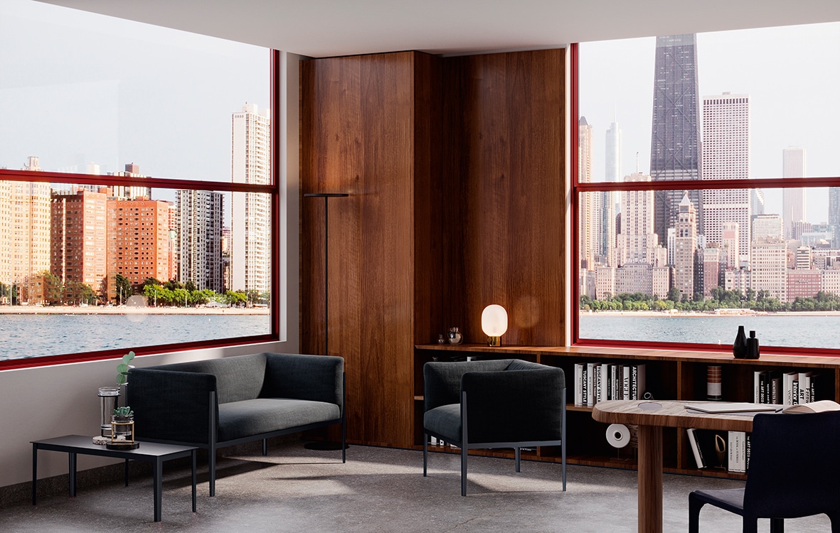 複雑な内部構造を持ちながら、見た目はミニマルなデザインソファ。それとは対照的に、柔らかなシートクッションは、ロビーやラウンジエリアに適したリラックス感を放つ心地よいネストを作り出します。アルミフレームのカラーと豊富な張地コレクションから自由に組み合わせることができ、オフィスやラウンジなど、すっきりとした直線的なモダンインテリアが求められるプロジェクトに最適なソファです。