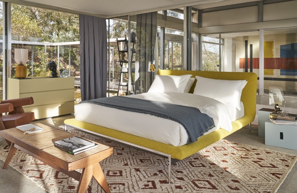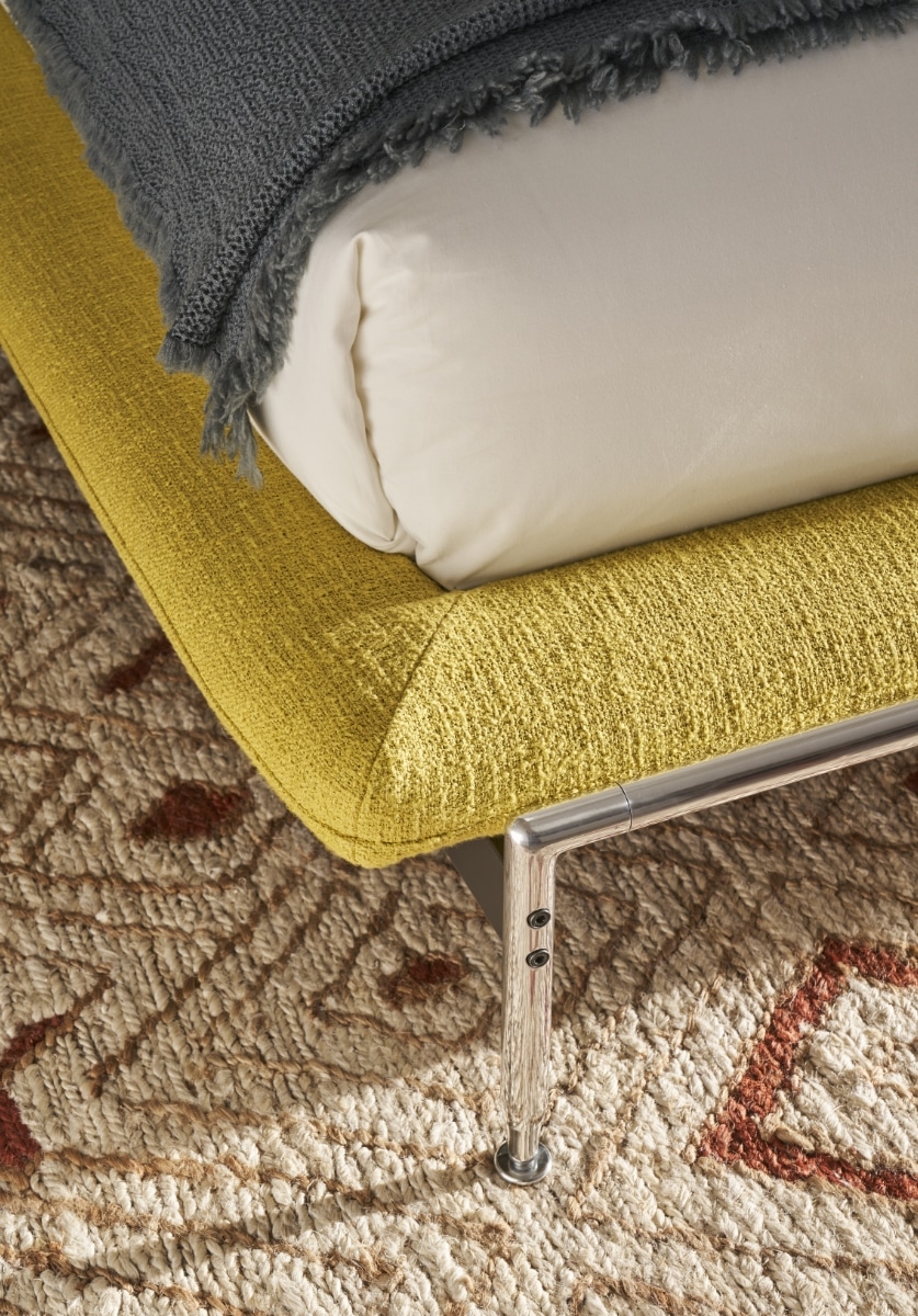 ESOSOFT(エゾソフト)ベッドのヘッドボードはテーパーがかかってわずかに傾斜しており、ベッドフレームと一体化して一本の連続したラインを形成しています。ヘッドボードとベッドフレームが一体となったファブリックの張地は、まるで手袋のようにフィットし、その流れるようなラインを際立たせています。 このコレクションに共通するのは、ベースのアルミニウム製フレームです。むき出しのネジが特徴的で、ベッドのユニークな美しさを引き立てる一方、サーキュラリティの観点からベースを分解できる構造で、製品のライフサイクル終了時にパーツのリサイクルを容易に行うことができます。 Cassina LABの研究により、このベッドはウェルビーイングをサポートする機能性を備え、ヘッドボードのパッディングには衛生的で無害なリサイクル素材であるSoundfilR吸音パネルを採用し、近くの振動音を制限して減少させることが可能です。