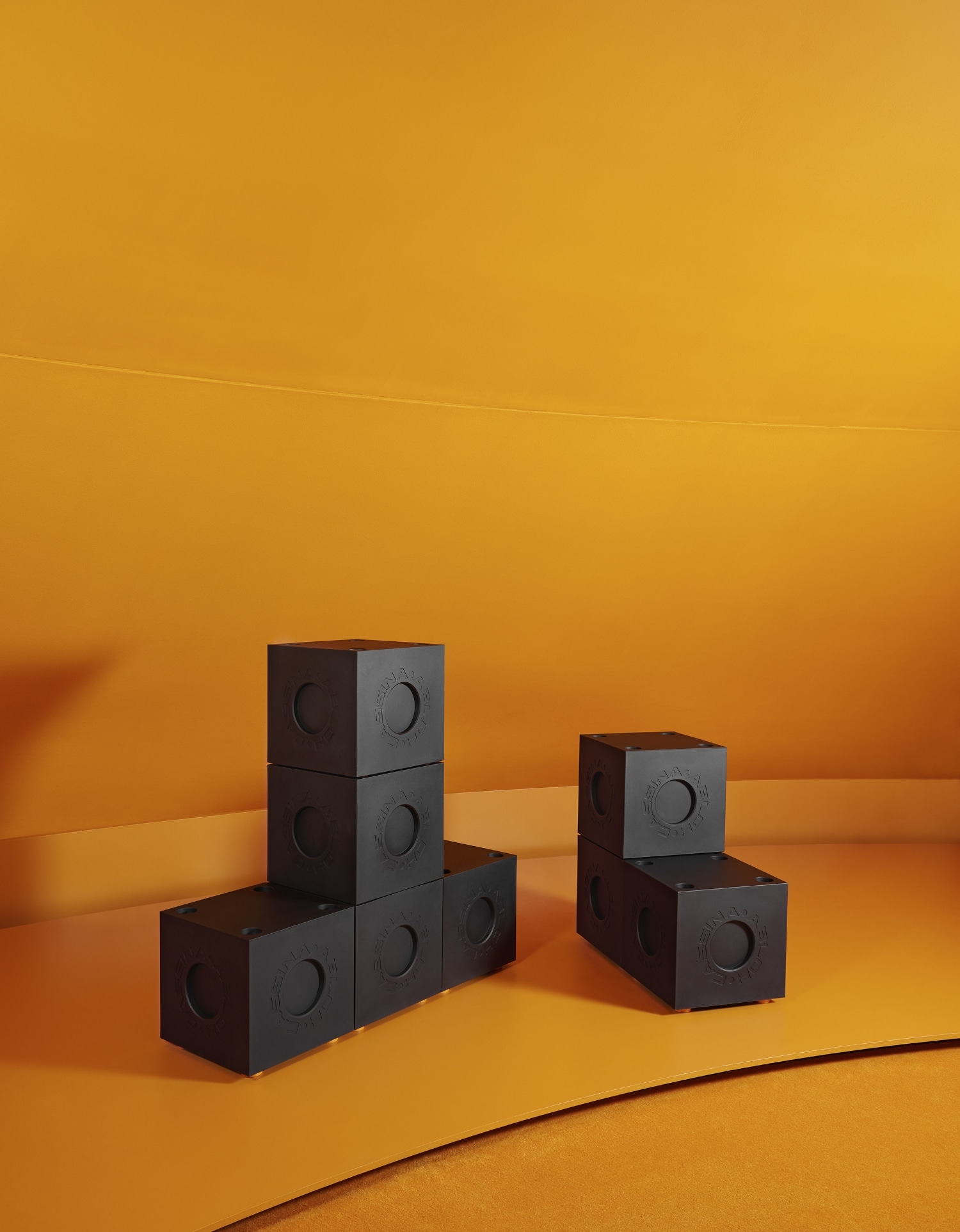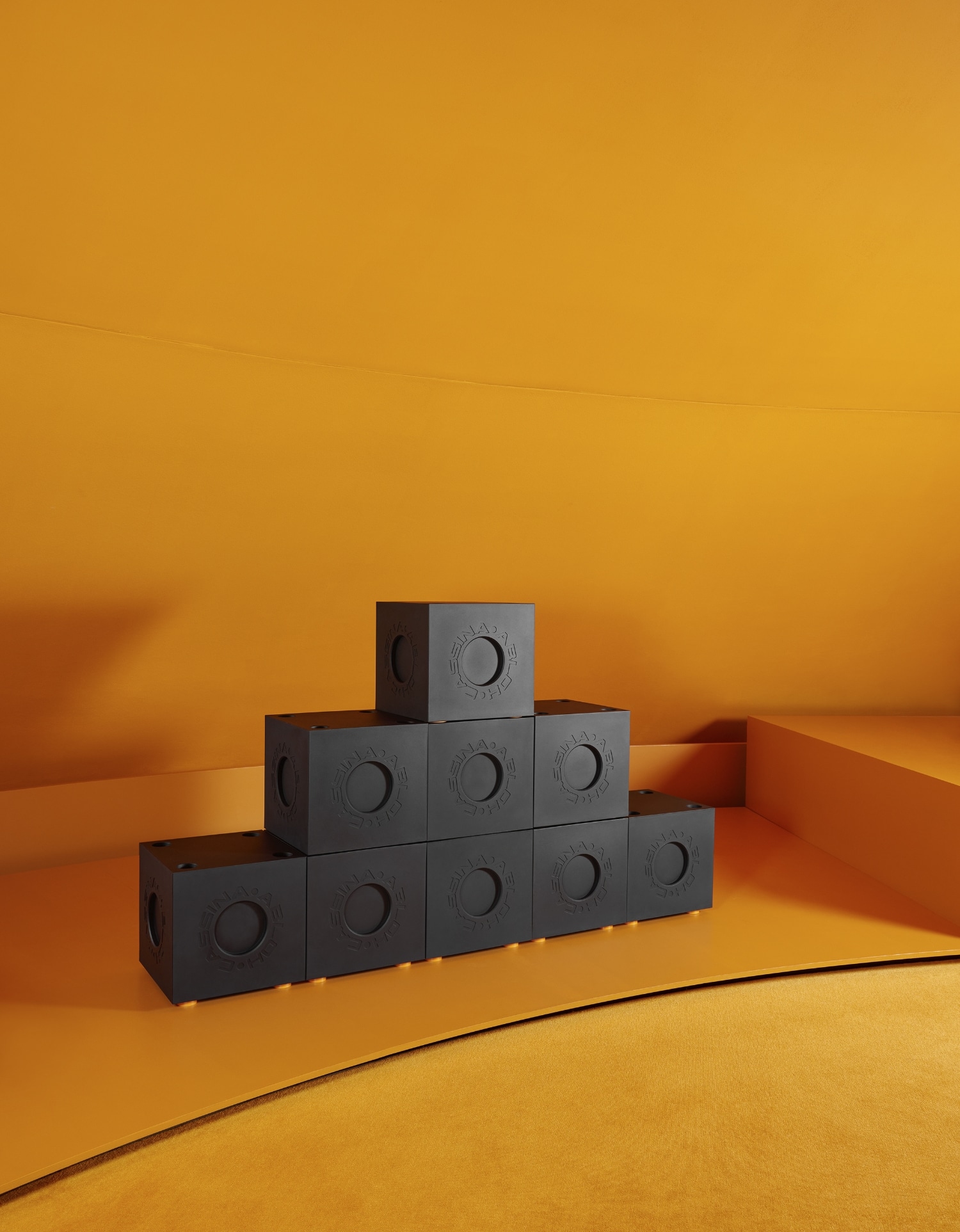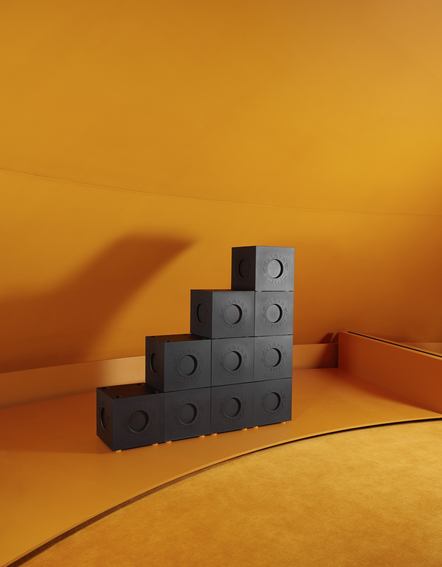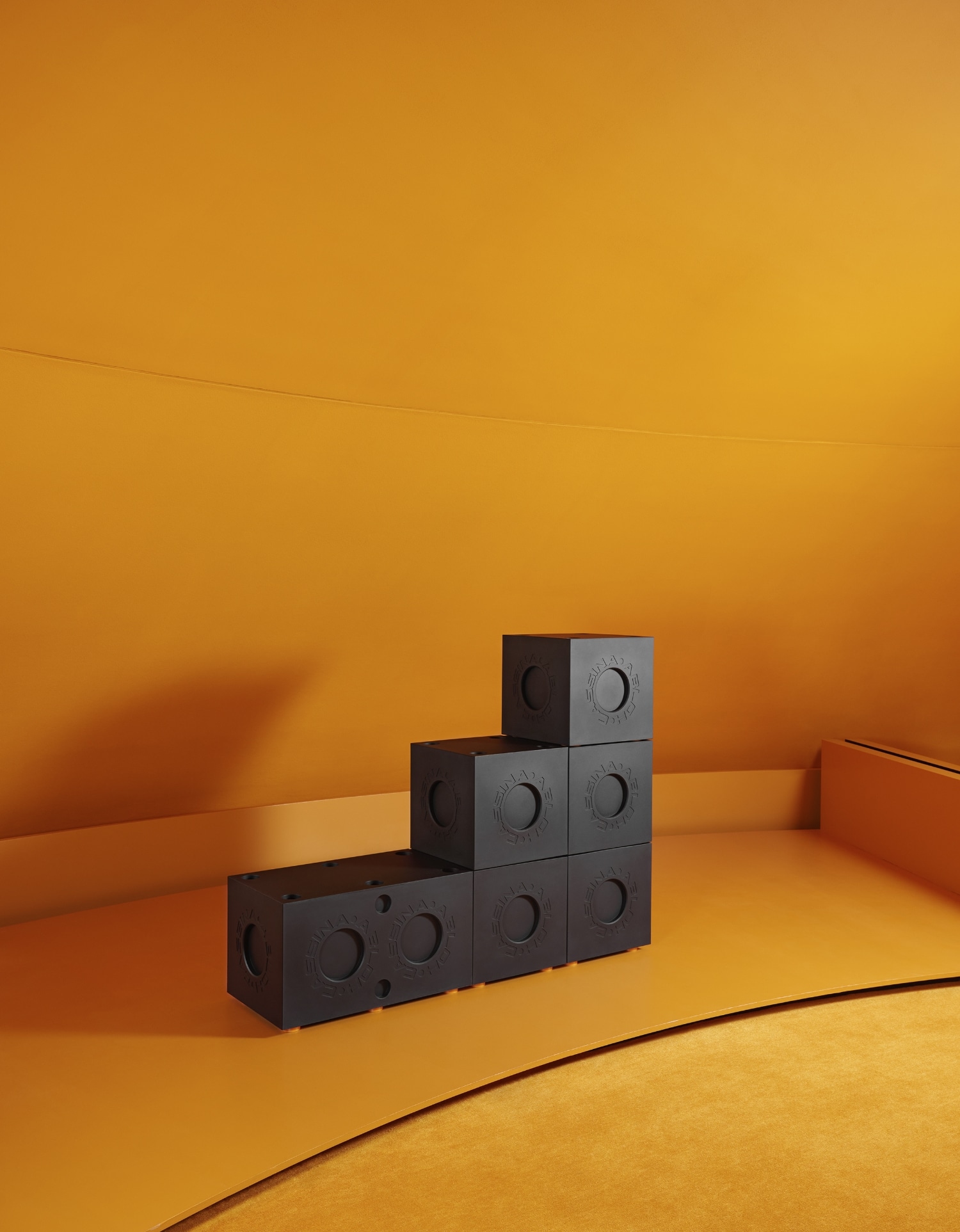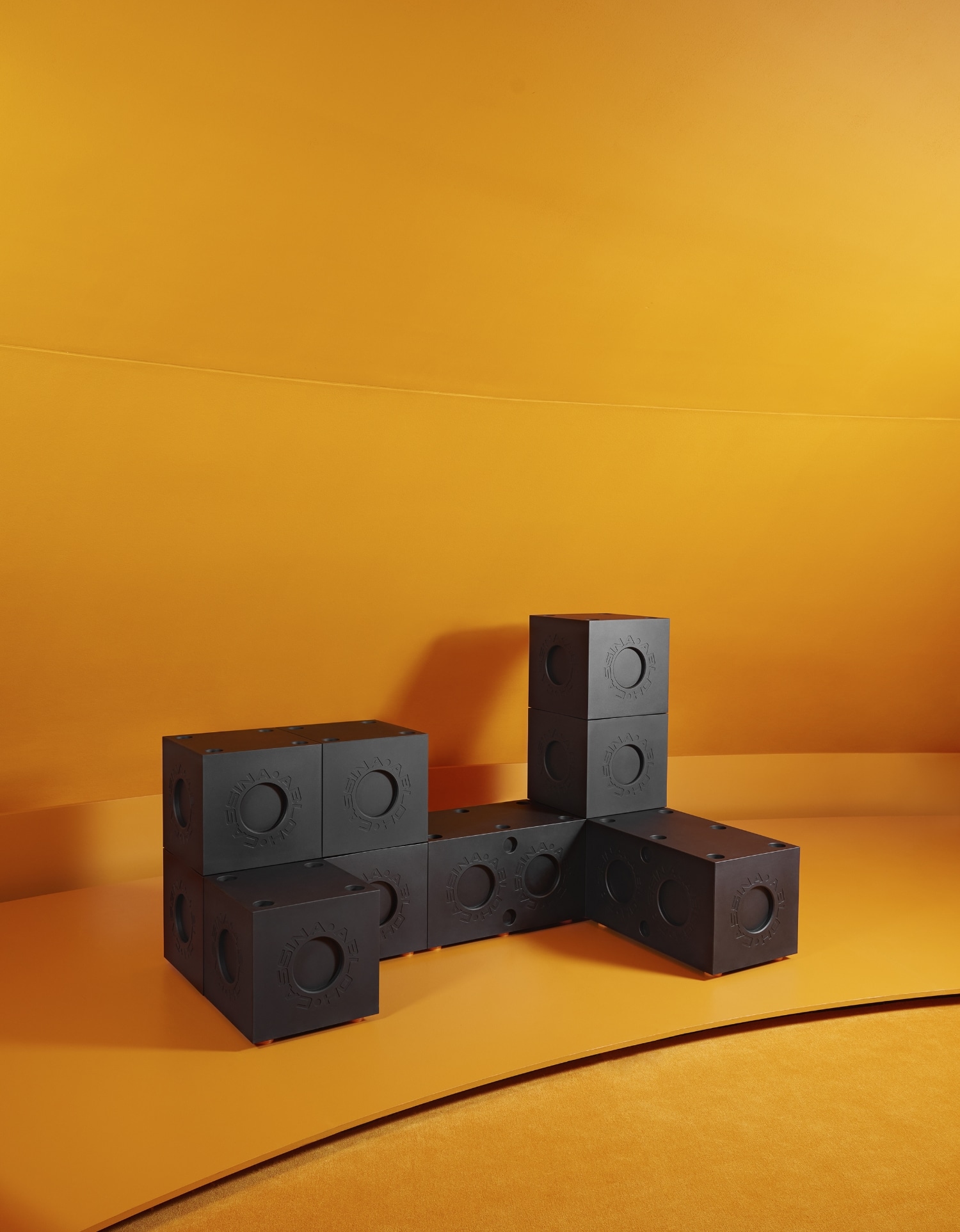 幾何学的で自立した2つのサイズの基本ユニットから成り、常に新しい世界を構築しながら、プライベートとパブリックの両方の環境に適応します。マットブラックの硬そうな外観の中に意外な柔らかさを秘めたモジュラー・イマジネーションは、テーブルとしてだけでなくシートとしても使用することができます。オレンジ色の専用コネクターにより複数のピースを連結して固定し、オットマン、ベンチ、テーブルなど、さまざまな用途を生み出します。ル・コルビュジエのLC14タブレ スツールなど、デザインのアイコンを生み出した基本的な価値観−機能性の尊重、表現力とシンプルな形状、卓越したクラフトマンシップ―を共有しながら、モジュラー・イマジネーションは、さまざまなスタイルやサイズの住宅に適した汎用性など、純粋に現代的な原則に基づいているのです。