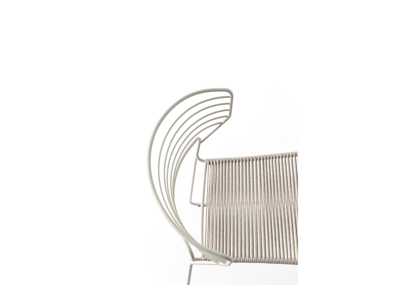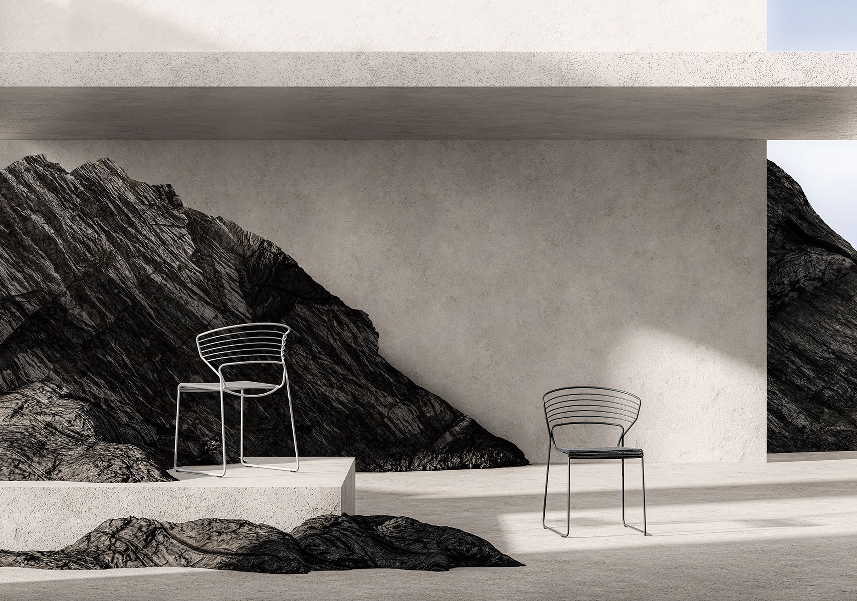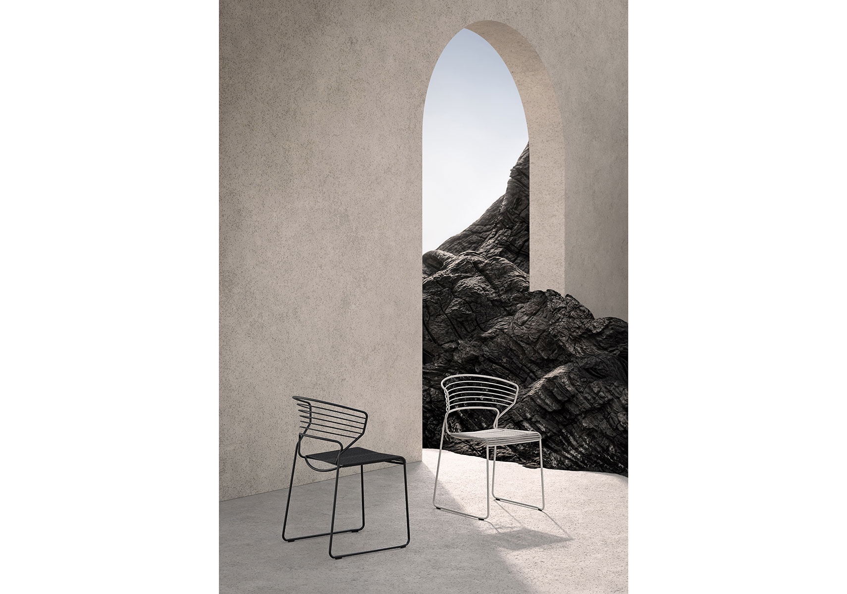 「コキ ワイヤー コルダ」は、繊細な金属フレームに耐久性の高いポリエステルコードが手作業で編みこまれたアウトドアチェアです。 その繊細なフォルムは、アウトドアだけではなく室内でも空間に洗練された美しさを添えます。