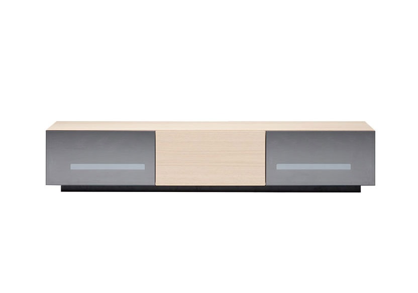 木が持つ素材感を大切にデザインされた「BREATH」のシアターボードです。木の素材をしっかりと活かしつつ、テレビと合わせた時に違和感のないシャープでフラットなデザインを実現しました。脚に丸く細いマットブラックパイプを採用し、全体が宙に浮いているような演出です。前面はハーフミラーガラスのドロップダウン扉で、中の収納物を隠しつつ扉を閉じたままで機器類の操作が可能。背面には配線ラックを設け、配線類をすっきりまとめられるよう配慮されています。