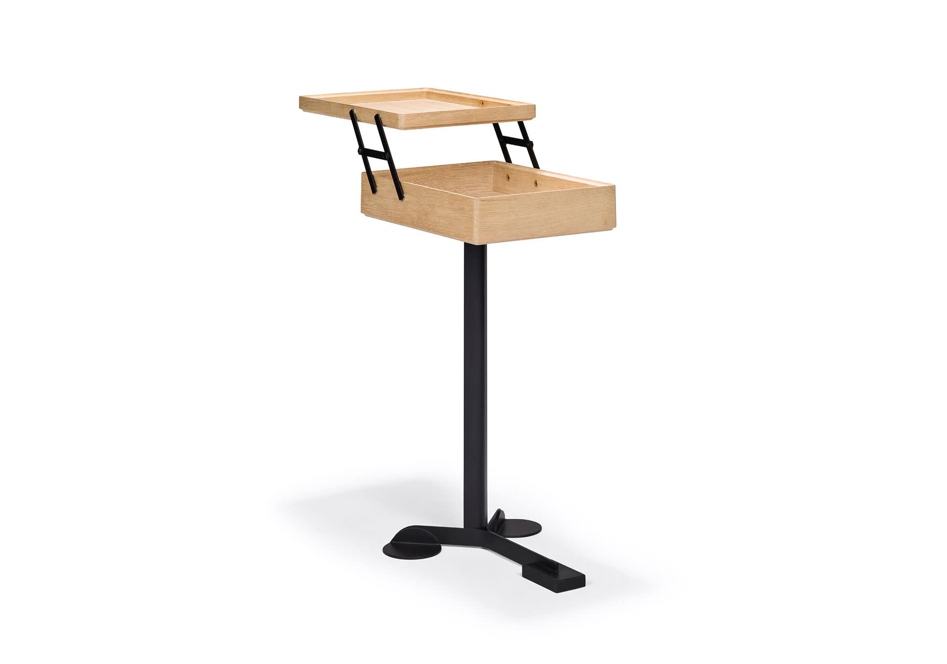 Castiglioni(カスティリオーニ) は、彼のキャリアを通して、デザインを工業製品の最高レベルへと高めることに努めてきました。核となる部分だけを残してデザインの無駄を削ぎ落とし、余計なものは一切排除するこのアプローチは、数多くの事例により裏付けられています。その一つが、1988 年に制作したComodo。ComodoはAchille CastiglioniとGiancarlo Pozziがデザインした多目的ファニチャーで、ウッドキャビネット、それを支えるメタル製の長いステム、三本脚の土台で構成されています。また、キャビネットにはヒンジで開け閉めできるトレイ状の蓋が付いています。このエレガントなユニットは、ベッドサイドテーブル、トレイ、コーヒーテーブル、あるいはお気に入りのものを入れておく小箱など、さまざまな用途にお使いいただけます。スイーツ好きで知られるCastiglioni はお菓子を入れていたに違いありません。