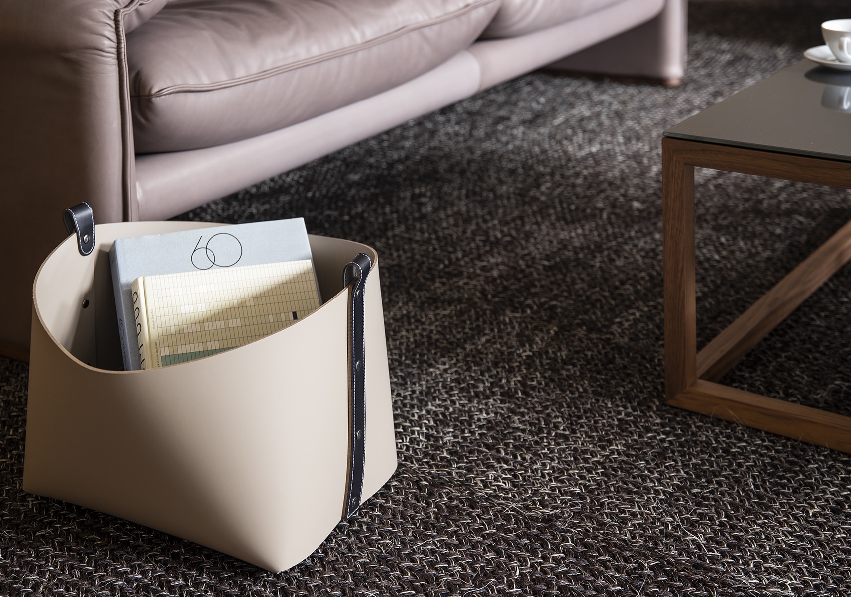 バイカラーのハンドルとステッチがアクセントになったバスケット。美しい仕上がりで、見せる収納として活躍しそうなアイテムです。上質なレザー使いが落ち着きのある洗練された空間を演出します。