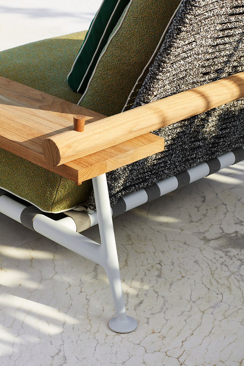 アジアの建築にインスパイアされ自然そのものを追究し作り上げられたシンプルなメカニズムと洗練された動作。対話と寛ぎのシーンに合わせてバックレストの角度は2段階に調節が可能です。無垢のチーク材の支柱を天然の枝のように巧みに作りあげ、彫刻された2本の木製の止めくぎで所定の位置に固定します。