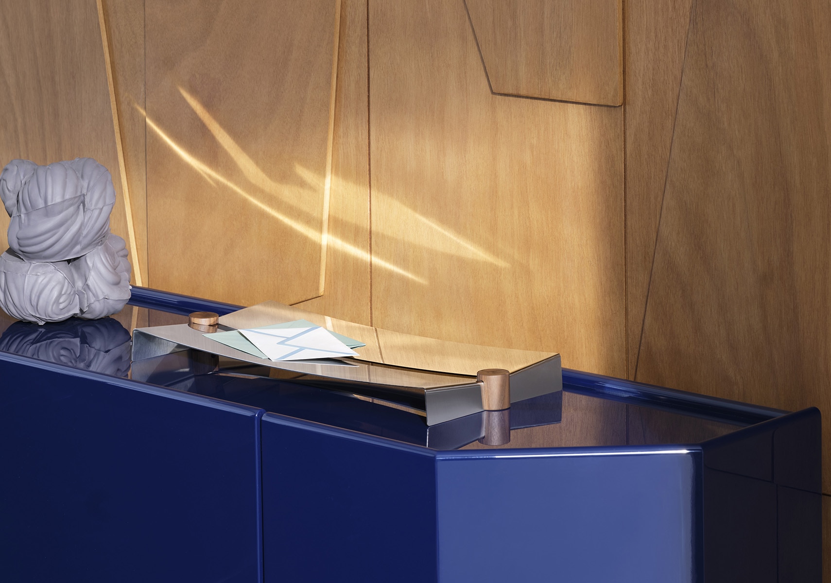 GLYNTEA(グリンティ)は、コレクションの本質を表す二つの言葉を組み合わせたものです。「Glyn」は英語の glint(きらめき、反射、輝き)に通じ、「tea」は社交性や儀式性、洗練の象徴です。 2種の長方形と1種の正方形、3サイズのトレイで構成されたコレクション。わずかなラインで描かれるミニマルなフォルムは、しなやかで視線を惹きつける美しさを放ちます。ステンレススチールの薄板を高度な成形技術で仕上げた本体は、手作業による組み立てと研磨で光をとらえ、躍動感ある反射を生み出します。中央に施された切れ込みが、軽やかな印象と視覚的なアクセントを添えています。仕上げには、5軸加工技術で精緻に彫刻された木製の脚を採用。素材選びからディテールまで、完璧なバランスを追求したこのセンターピースは、機能性と美しさを兼ね備え、どんなテーブルにも際立つ存在感をもたらします。