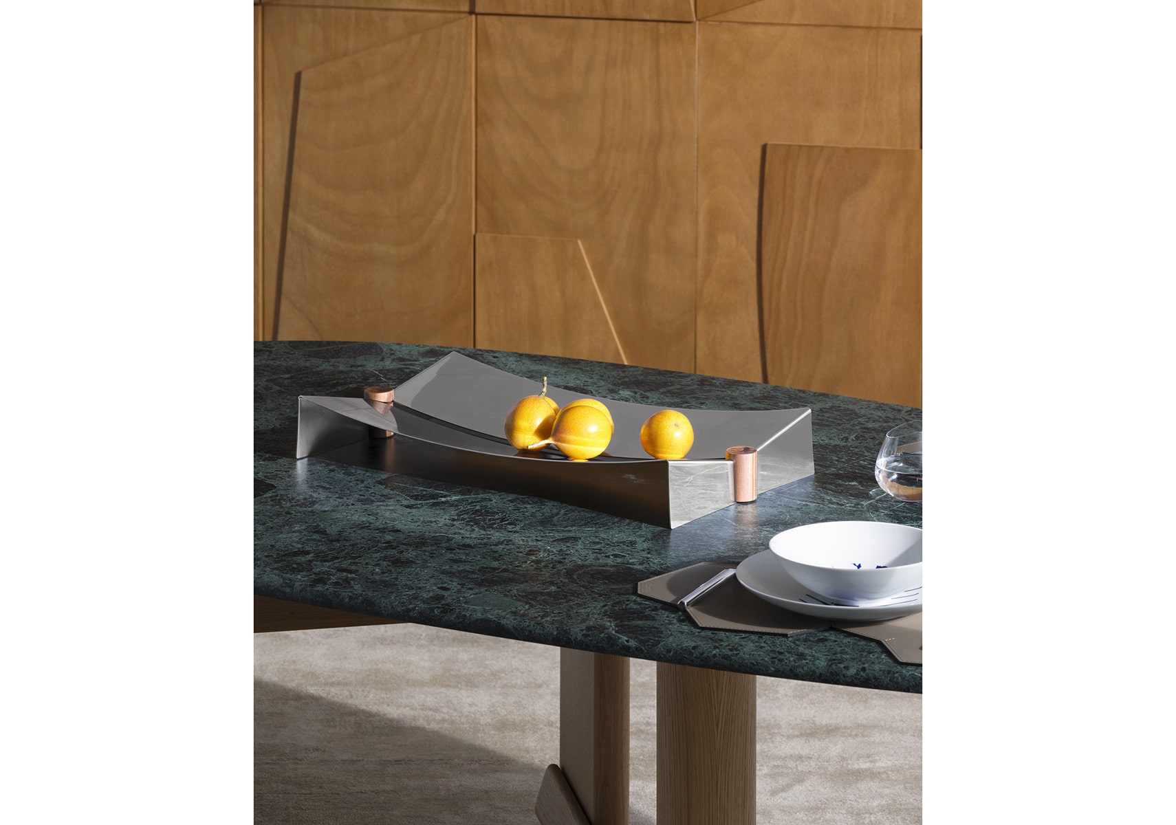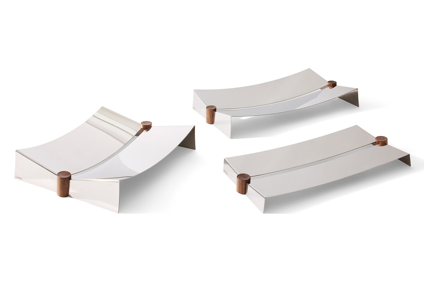 GLYNTEA(グリンティ)は、コレクションの本質を表す二つの言葉を組み合わせたものです。「Glyn」は英語の glint(きらめき、反射、輝き)に通じ、「tea」は社交性や儀式性、洗練の象徴です。 2種の長方形と1種の正方形、3サイズのトレイで構成されたコレクション。わずかなラインで描かれるミニマルなフォルムは、しなやかで視線を惹きつける美しさを放ちます。ステンレススチールの薄板を高度な成形技術で仕上げた本体は、手作業による組み立てと研磨で光をとらえ、躍動感ある反射を生み出します。中央に施された切れ込みが、軽やかな印象と視覚的なアクセントを添えています。仕上げには、5軸加工技術で精緻に彫刻された木製の脚を採用。素材選びからディテールまで、完璧なバランスを追求したこのセンターピースは、機能性と美しさを兼ね備え、どんなテーブルにも際立つ存在感をもたらします。