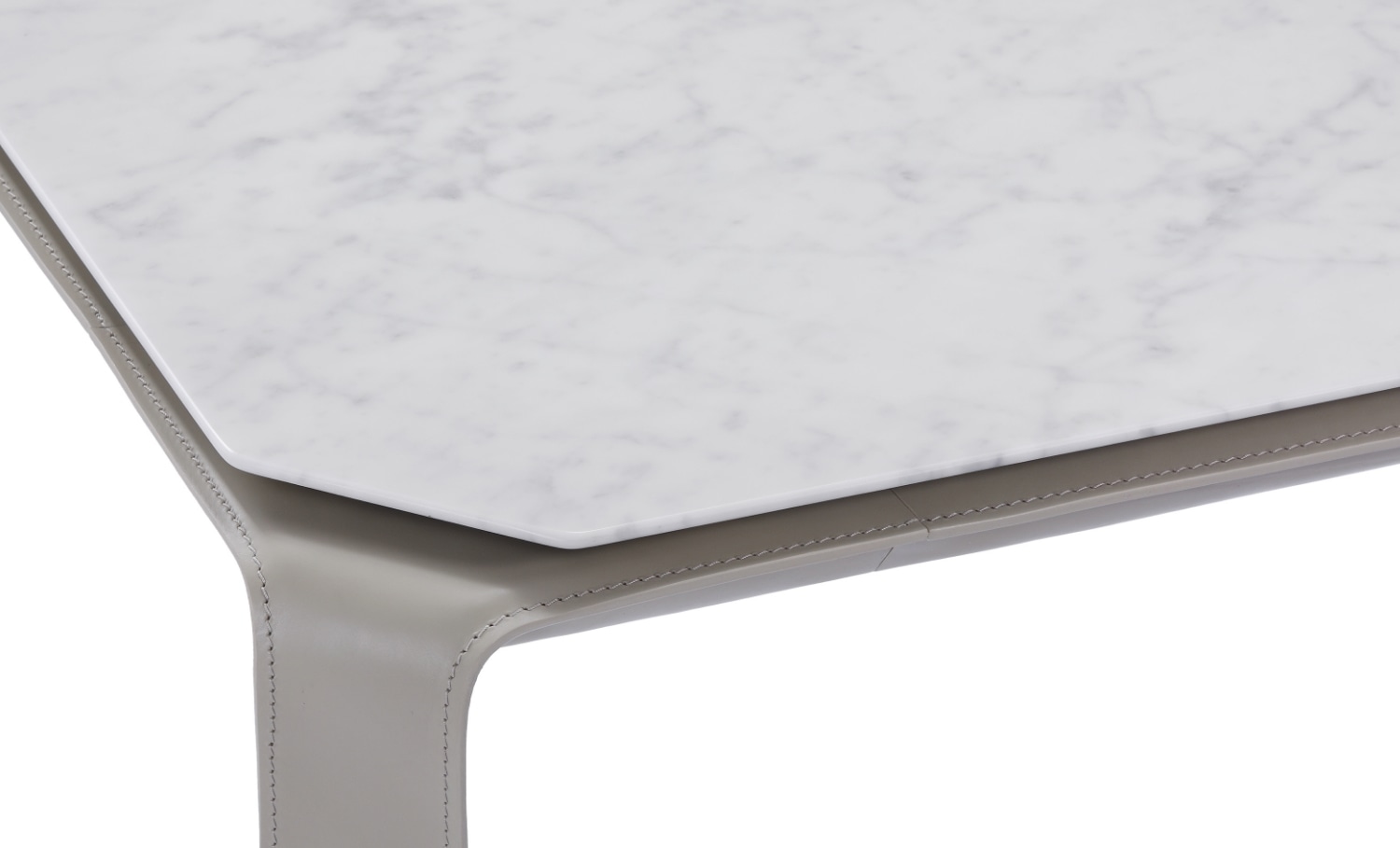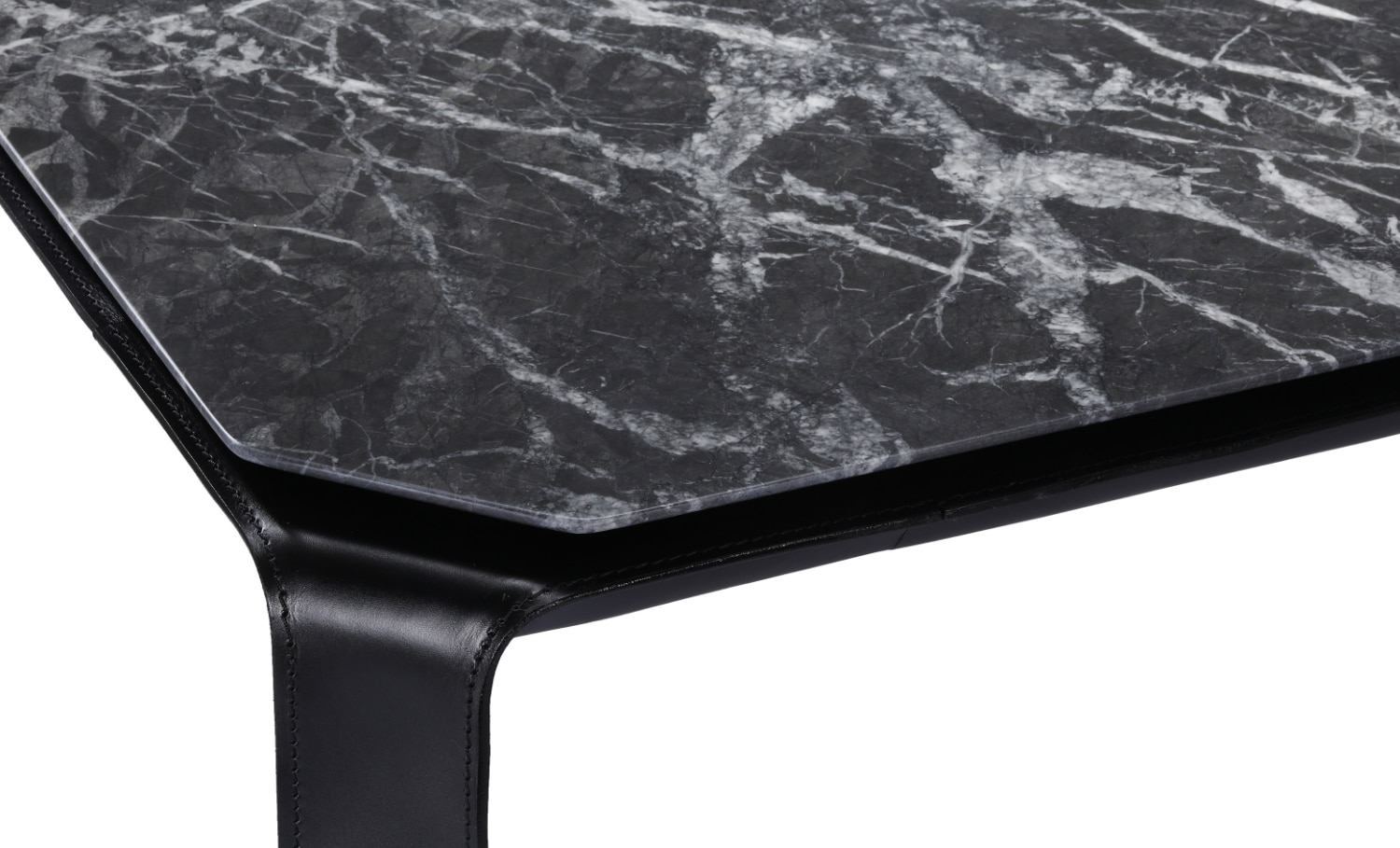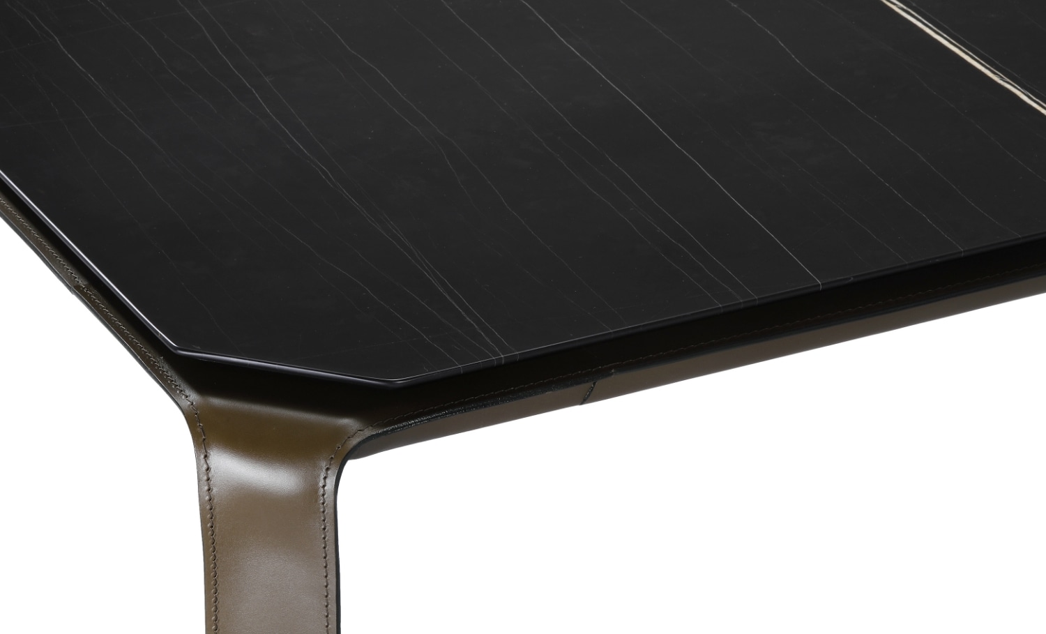 建築家マリオ・ベリーニによってデザインされたCABシリーズに、ダイニングテーブルが加わりました。1977年以来のベストセラーCABチェアと同様に、CAB TABテーブルはカッシーナが長年培ってきたサドルレザーの高度な職人技を用いて作られています。カットされたいくつものレザーパーツを職人の手作業で丁寧に縫い合わせ、テーブルのメタルフレームを覆っています。特に細部にこだわり、テーブルの脚部には美しいステッチを見ることができ、テーラーメイドドレスを想起させるような仕上がりです。