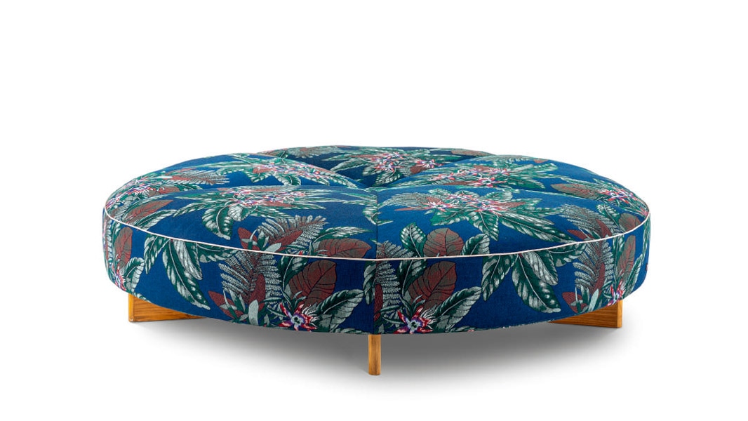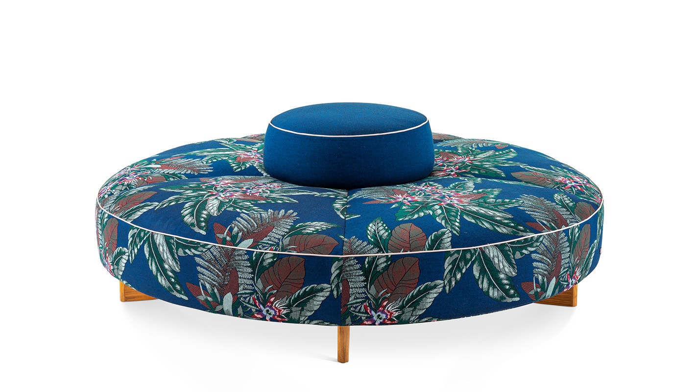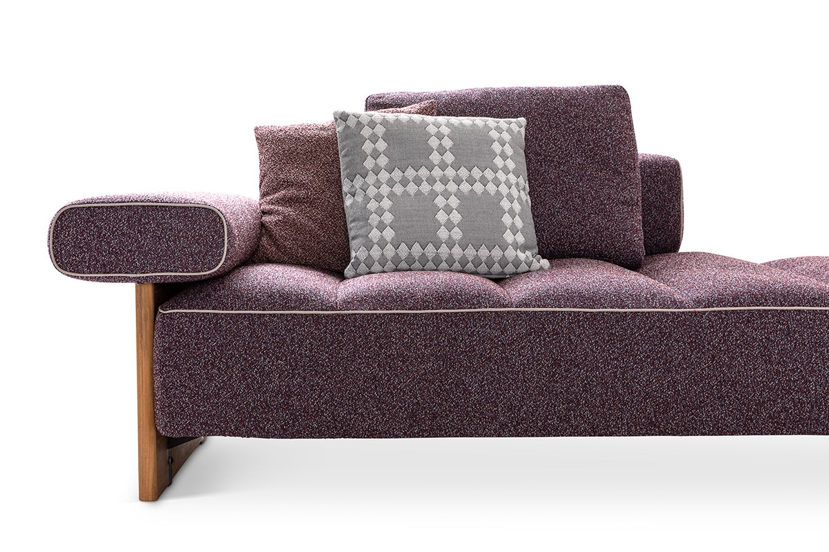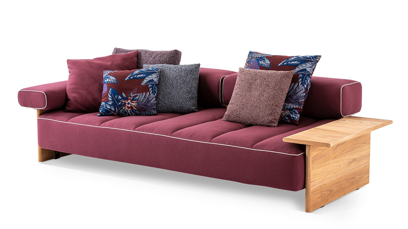 ロドルフォ・ドルドーニは、1950年代のリゾート地からSAIL OUTソファのインスピレーションを得ました。非常に快適なこのモジュラーソファの座面はステッチにあわせてパッディングが施され、空気で膨らませるエアマットレスのような柔らかな形状を連想させます。3種類の幅のシートモジュールと、チーク材のサイドテーブル、2種のアームレスト・バックレストで構成され、多様な組み合わせを可能にしています。円形のオットマンは、中央に向かって水が流れ溜まらないような構造になっています。オットマンの上に設置するアンカークッションはアームレストとして使用したり、トレイを置いたりすることができます。