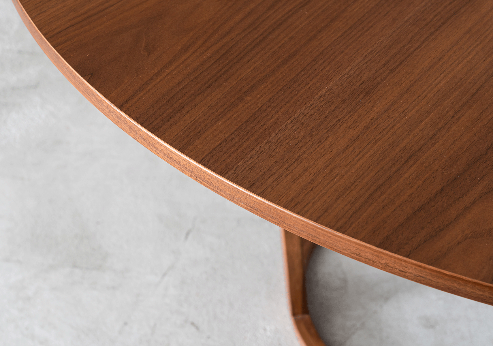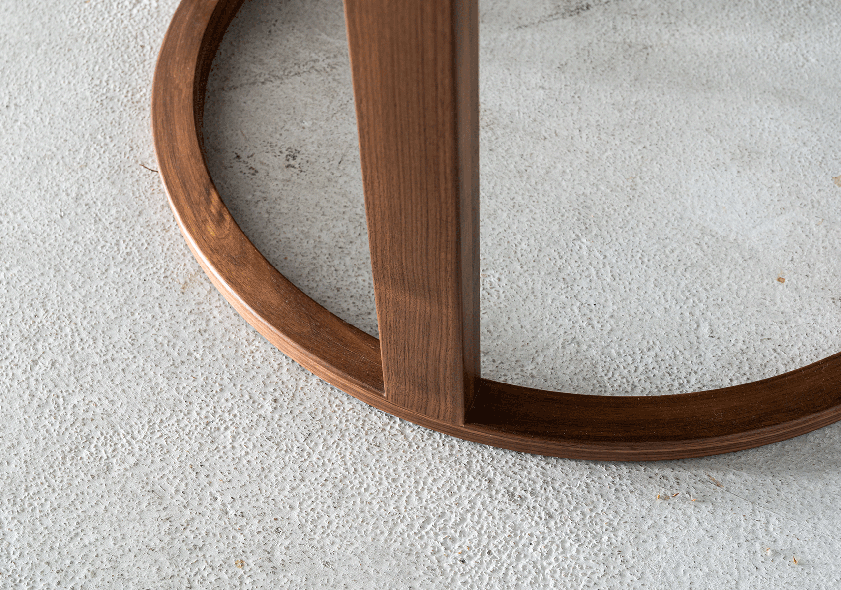 脚の形状にこだわった丸型ダイニングテーブルです。木製に見える脚のフレームは、丈夫なスチール製フラットバーに、薄くスライスした無垢材を張って仕上げています。内側に金属が入っているからこそ、この形状と重さのバランスが実現しました。脚部の輪は座った際に、足を置きやすいように手前に傾斜しています。オークスモーク材は、熱加工処理で化学変化させて着色しています。繊維の奥深くまで着色されるため、チップしても素地の色が見えにくく退色しにくい利点があり、安定性に優れています。