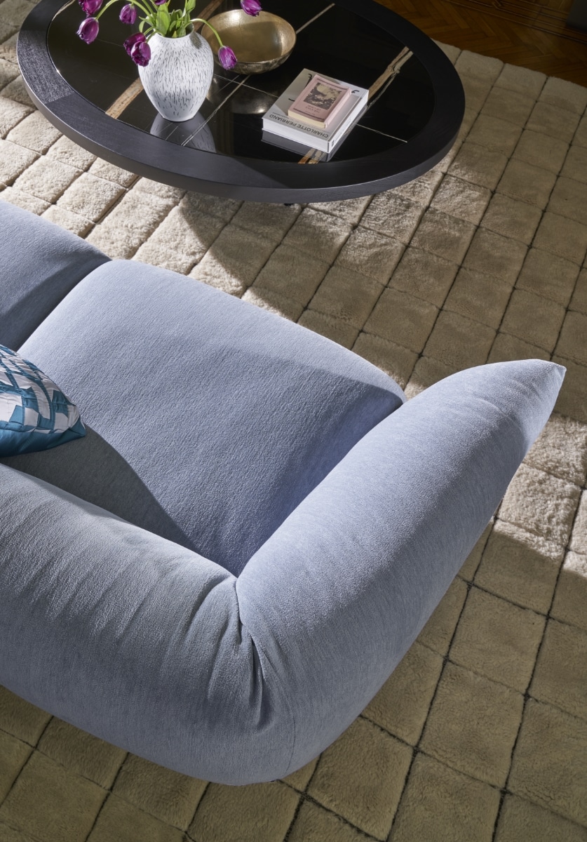 パトリシア・ウルキオラによってデザインされたMONCLOUD(モンクラウド)は、エレガントで多目的に使用可能なソファです。木製の構造体がシート部分を床から浮かせ、心地よい軽さと雲のような柔らかな感覚を与えます。ソファの輪郭を包み込む張地には、シルエットの美しさを引き立てる独特の折り目。背もたれのクッションはステッチが特徴で、各モジュールにユニークで洗練された美しさをもたらします。 ポリウレタンの使用を最小限に抑えるため、金属製のフレームに再生PET繊維の大きなキルティングパッドを被せて背もたれとアームレストを羽毛布団のように包み、シートクッションも再生PET繊維を使用しています。尚且つわずかに使用しているポリウレタンは、リサイクルされたポリオールの割合が高いCIRCULARREFOAMRを採用。また、接着部分がないため、ライフサイクルの終了時には完全に分解することができます。