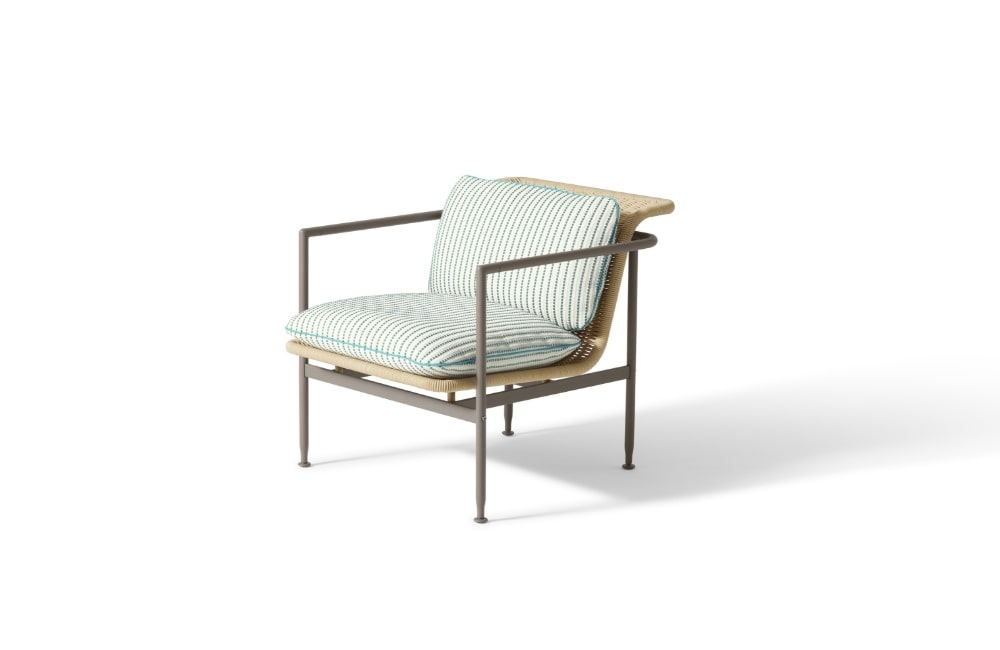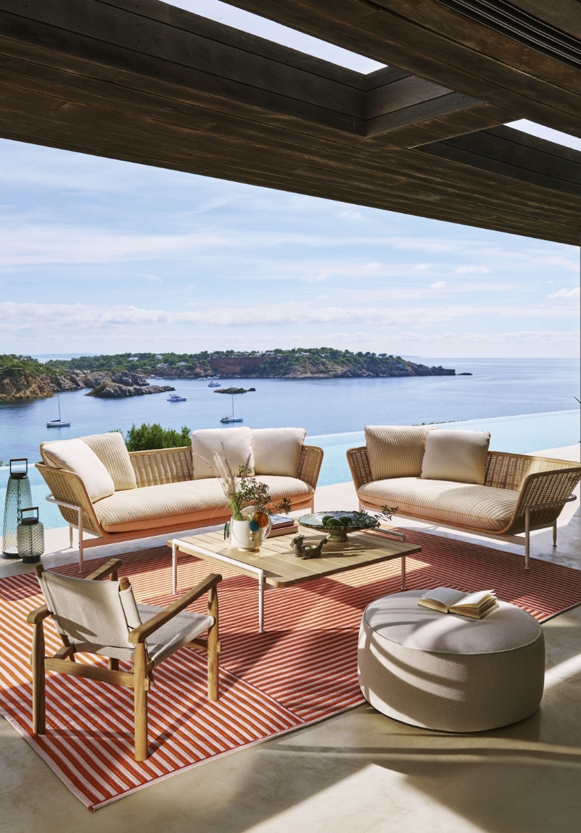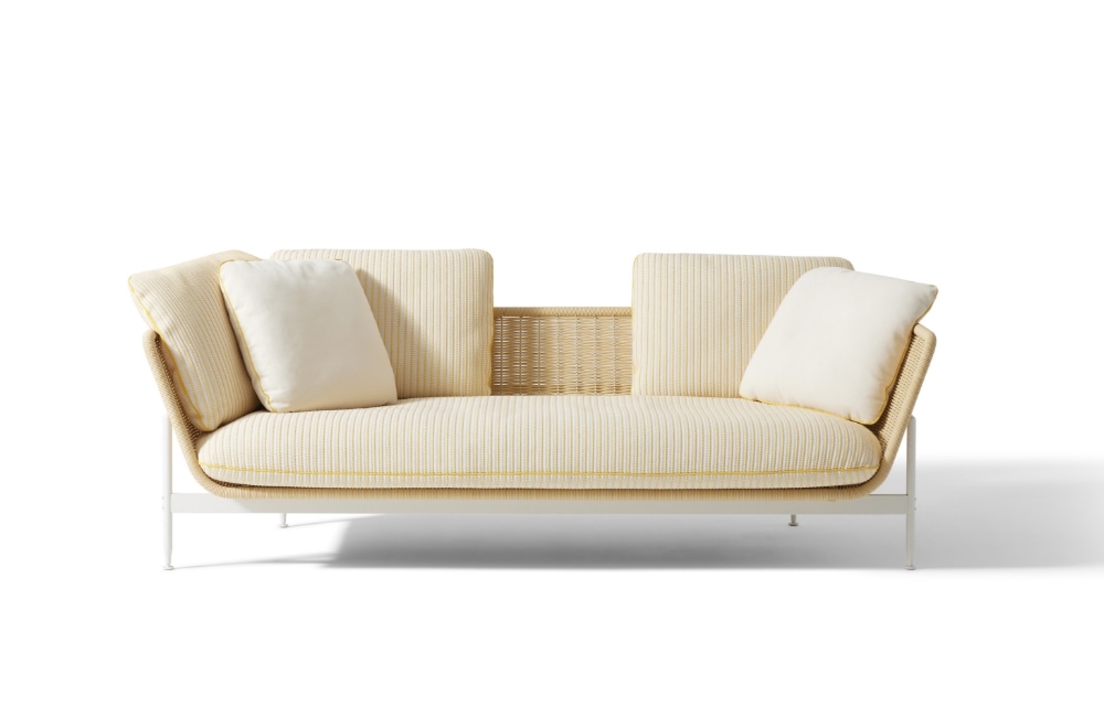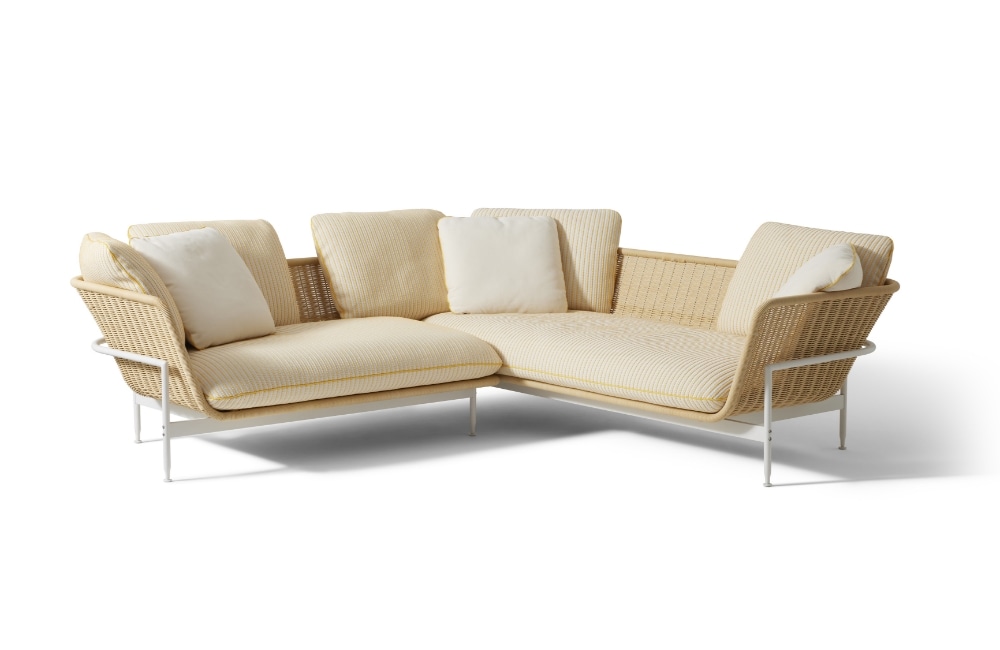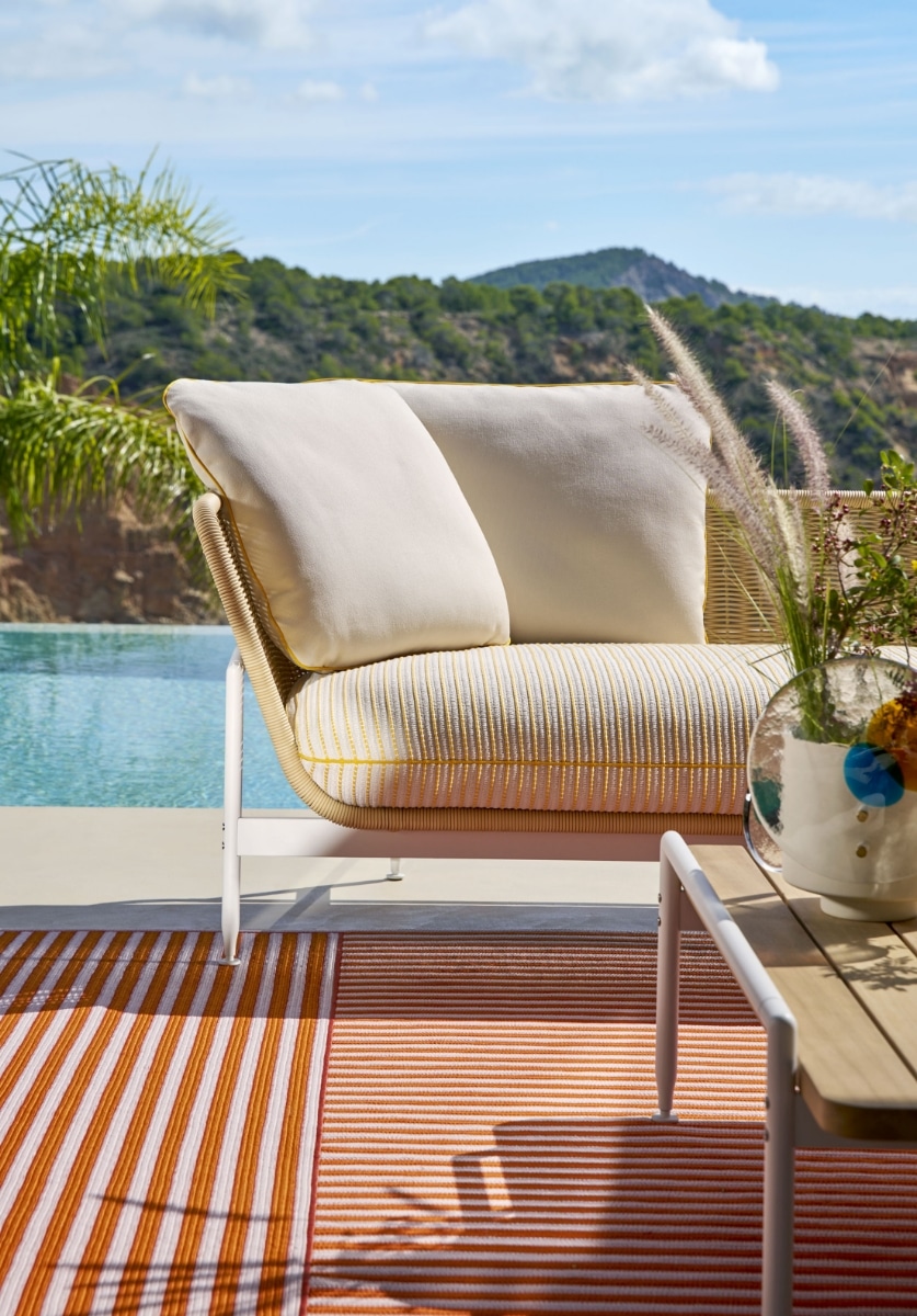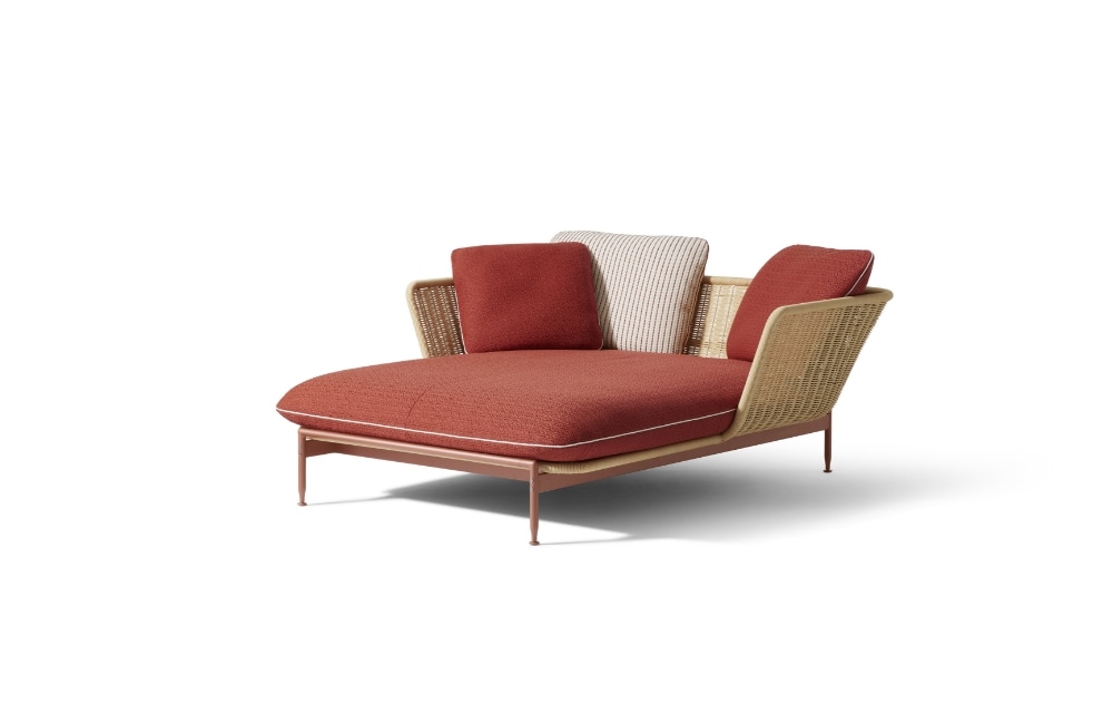 アントニオ・チッテリオがデザインした屋外用のコレクションESOSOFT OUTDOOR(エゾソフト・アウトドア)は、魅力的なビジュアルと質感のコントラストにより、屋外に美しさと快適さをもたらします。 象徴的なベースフレームは、アイボリー、トープ、グリーン、テラコッタといった暖かみのある4色を採用しています。耐久性や耐摩耗性、耐熱性、耐紫外線性に優れ、メンテナンスも容易です。天然素材に似た手織りのファイバーで作られたシートシェルのバスケットは、職人技を感じさせる精巧な編み方で作られています。座面や背もたれに自由に配置できるクッションもあり、よりダイナミックで機能的な座り心地を提供します。 テラコッタの暖かく喚情的な気配や、グリーンのリラックスしたニュアンスからターコイズやイエローのヴィヴィッドな色合いまで、幅広い色調の選択肢によって地中海のムードを表現。2人掛・3人掛とエンドエレメント、ラブベッド、アームチェアのほか、イロコ無垢材のスラット天板を備えたローテーブルも展開しています。 カッシーナ・ラボの研究により、座り心地の良いクッションの柔らかなパッディングには、生物由来のポリオールを含むポリウレタンやリサイクルPET綿など循環型の素材が使用されており、内部に浸水しないよう撥水加工を施した布で覆っています。さらに、サーキュラリティの観点からベースは分解可能な構造で、製品のライフサイクルが終了した際には、構成パーツのマテリアルリサイクルが容易になっています。