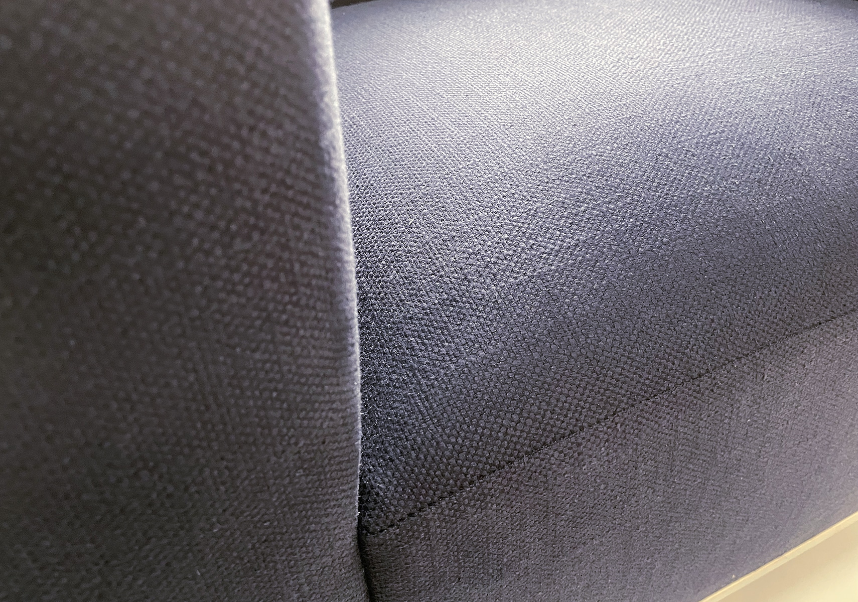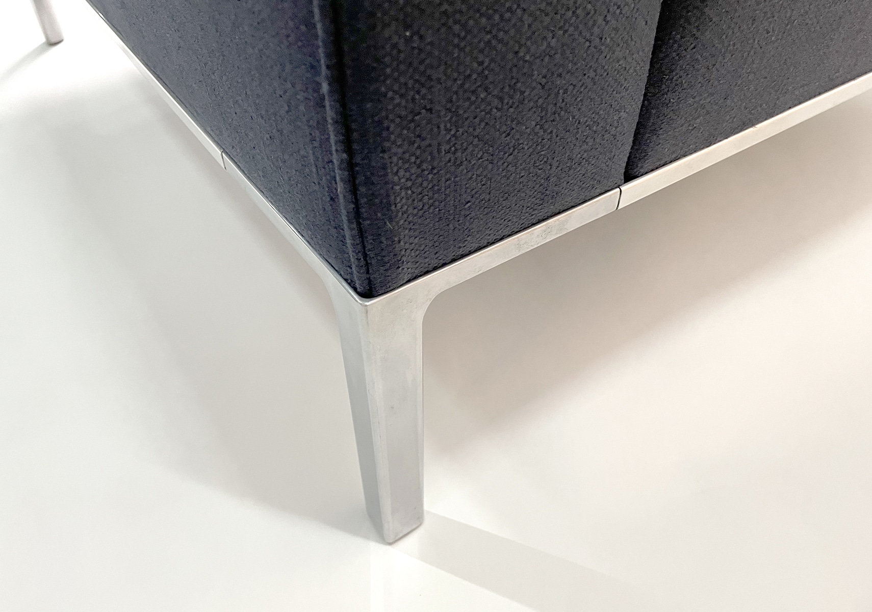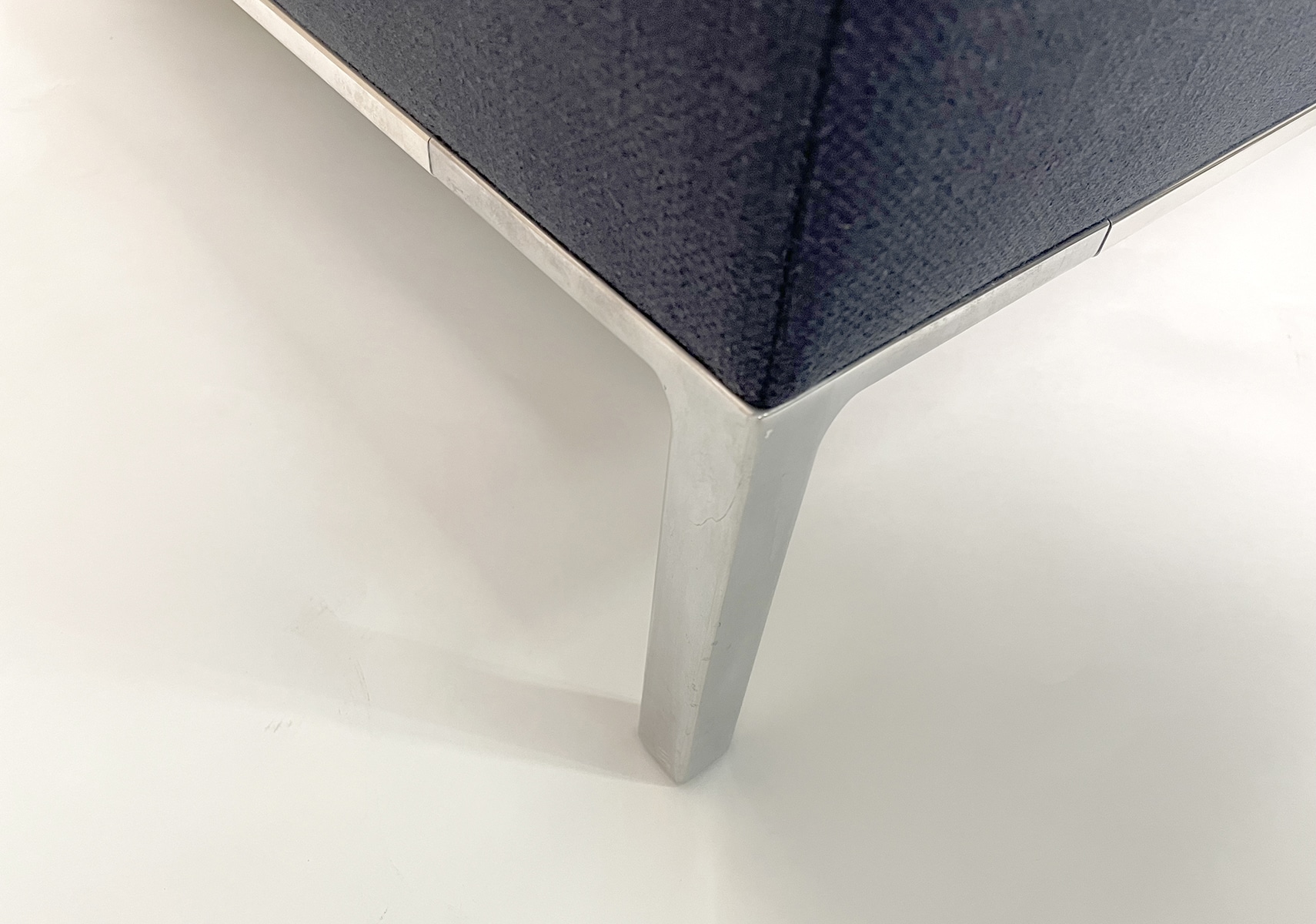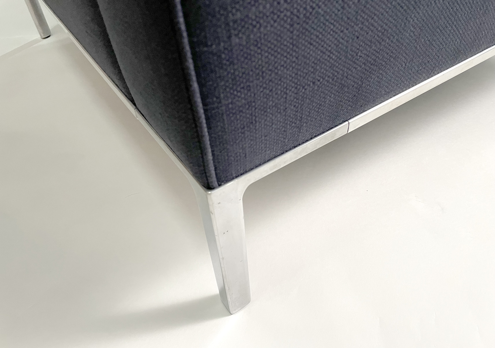 - 本体=木製内部構造・ポリウレタンフォーム・ポリエステルパッディング 脚部=アルミニウム(ポリッシュ仕上) 脚端=アジャスター付 張地=F008H #FLAIR 22 ネイビー(Fランク)※フレームに汚れ・細かい傷あり