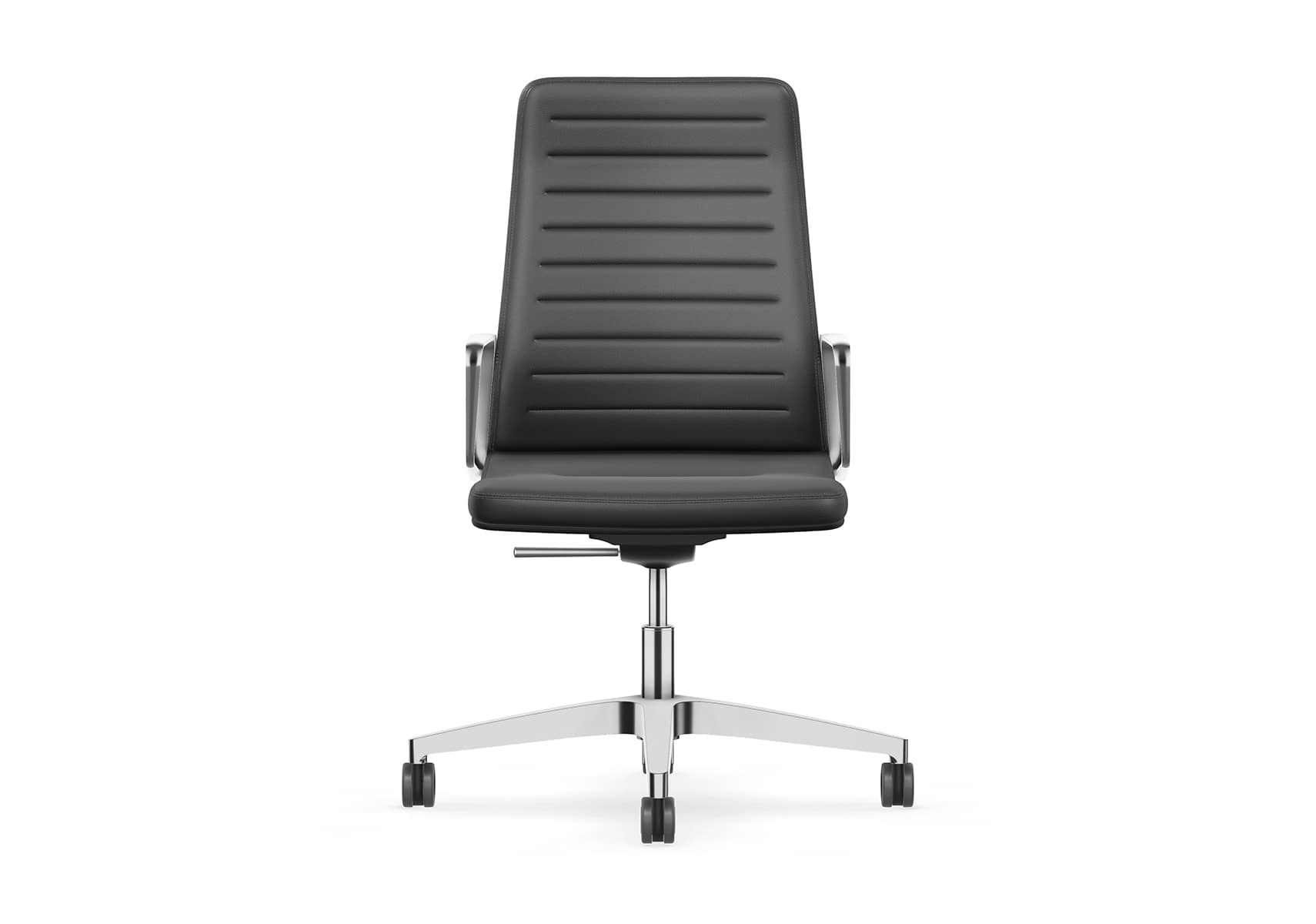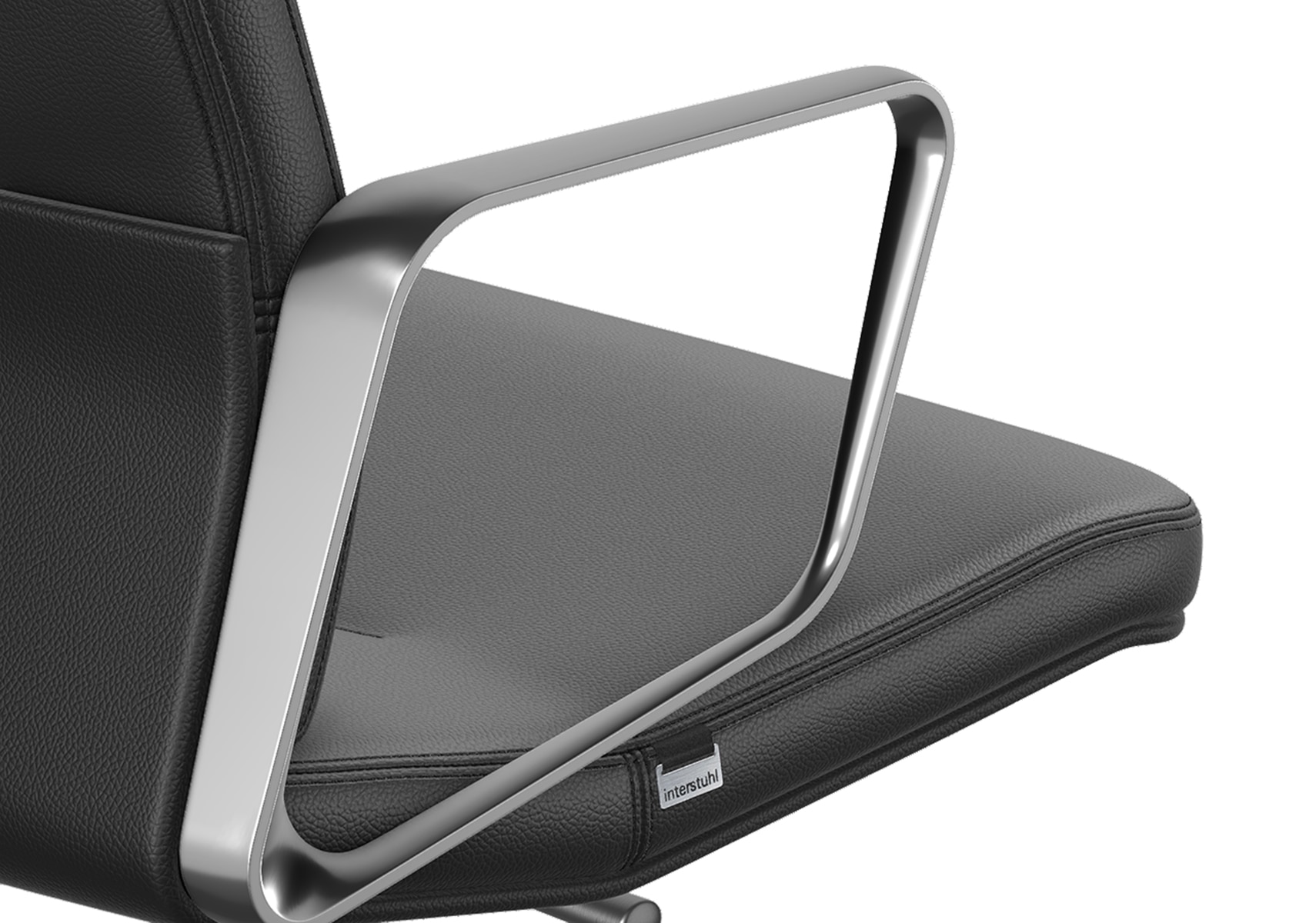 - 背座=成形合板・ポリウレタンフォーム・黒革(Interstuhl社オリジナルレザー・NA01 NAPPAレザー)、アーム・ベース=アルミニウム・クロムめっき仕上、脚端:キャスター(ソフト)。ガススプリングによる シート高さ調整機能。シートロッキングメカニズム=ロッキングチェアのようにシートシェルが人の動きに追従します。