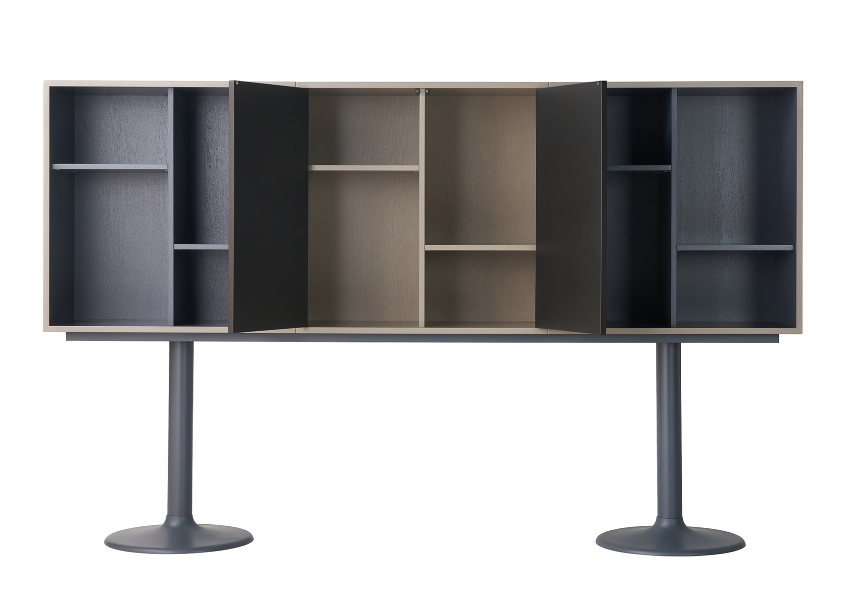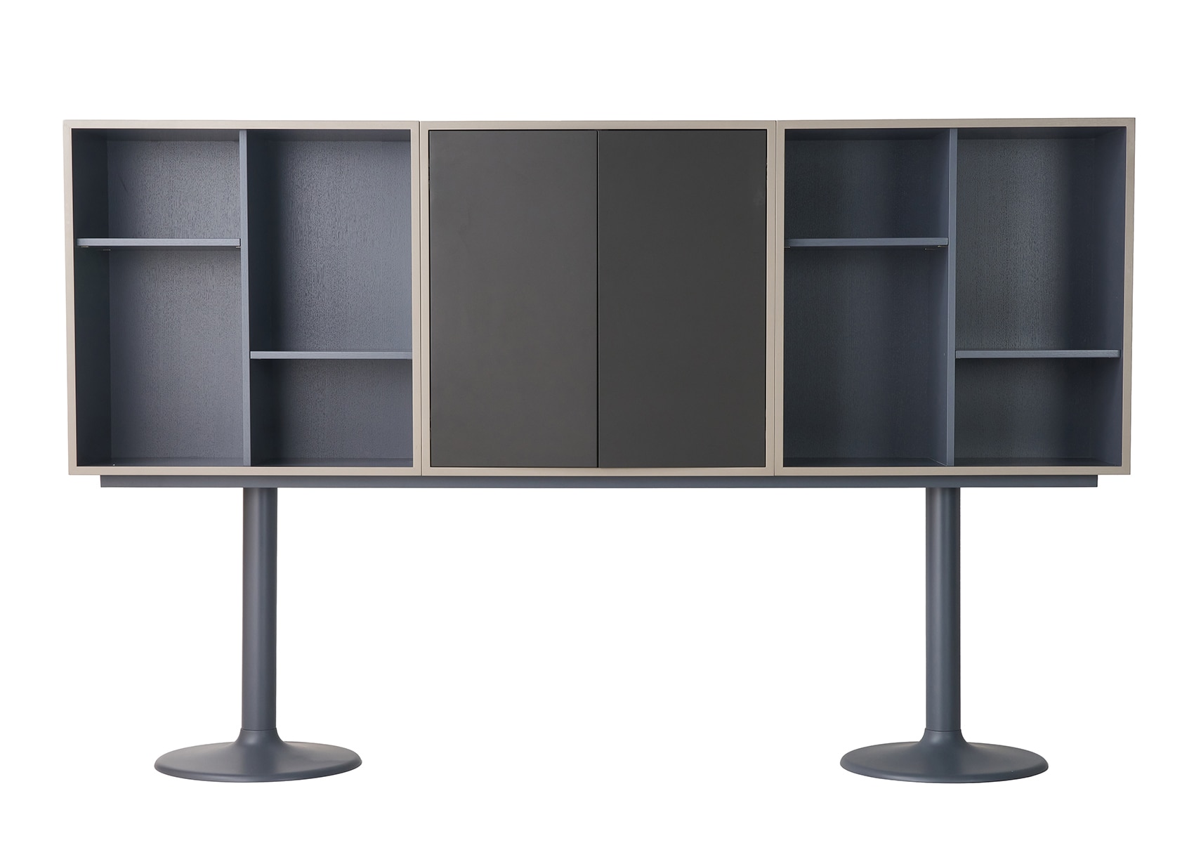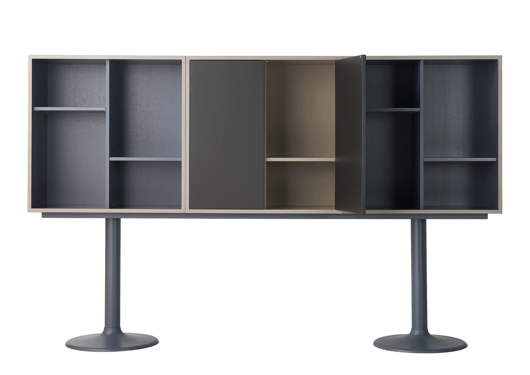 コンテナ本体=オーク材・カラー塗装仕上(トープ) 2ドア/フラップドア=木製・スレート色塗装仕上 ベース・脚=スティール・グレー塗装仕上