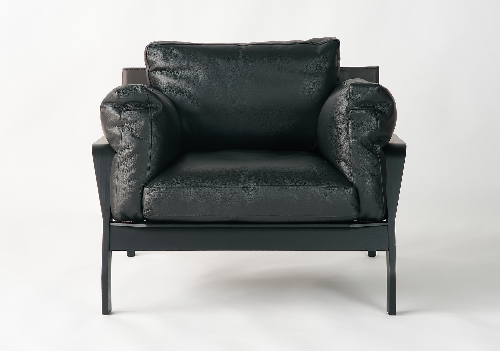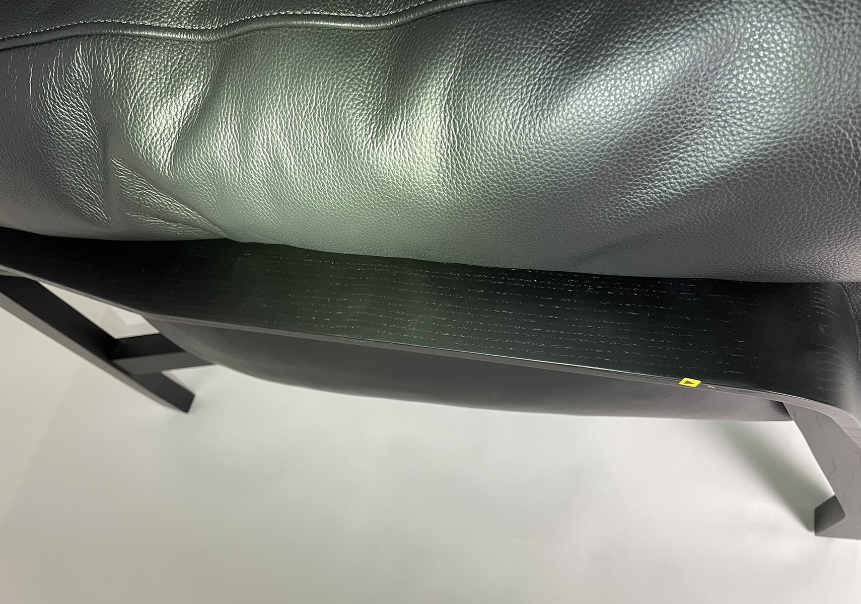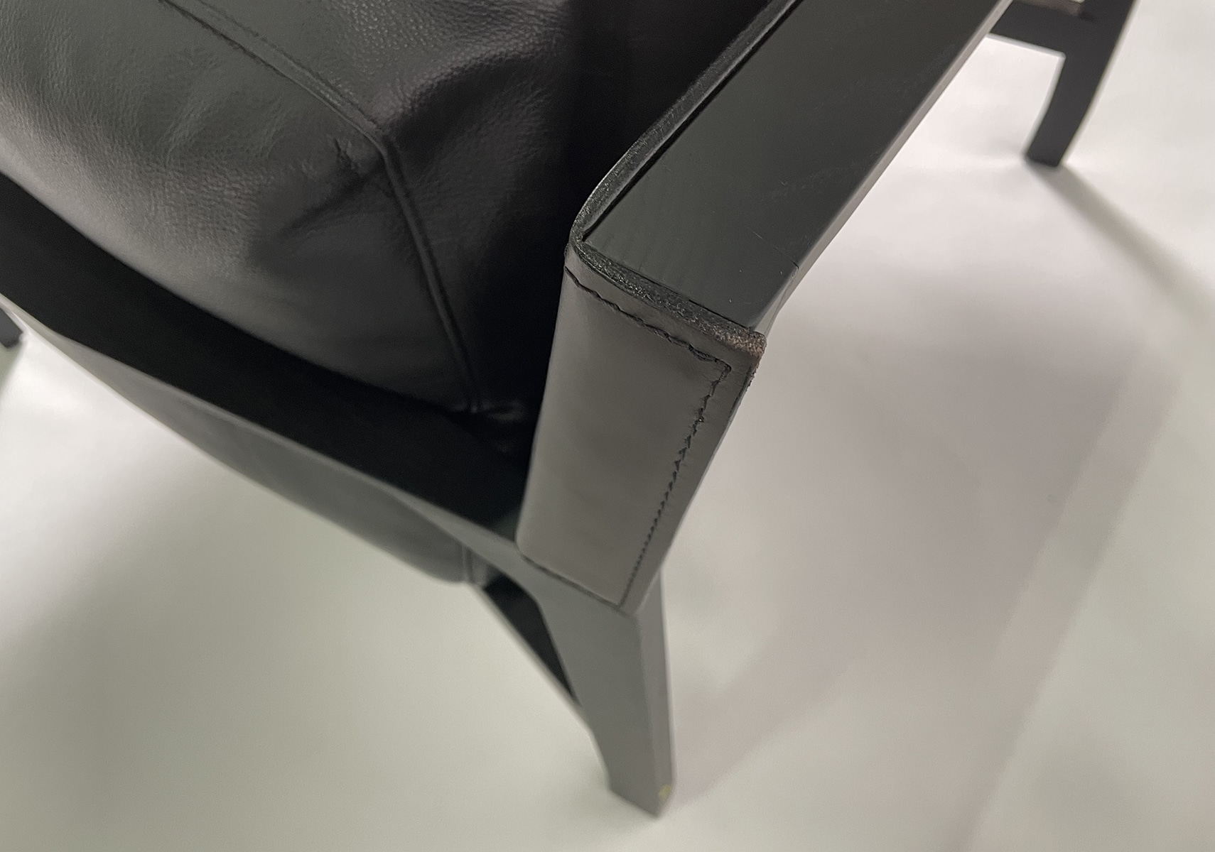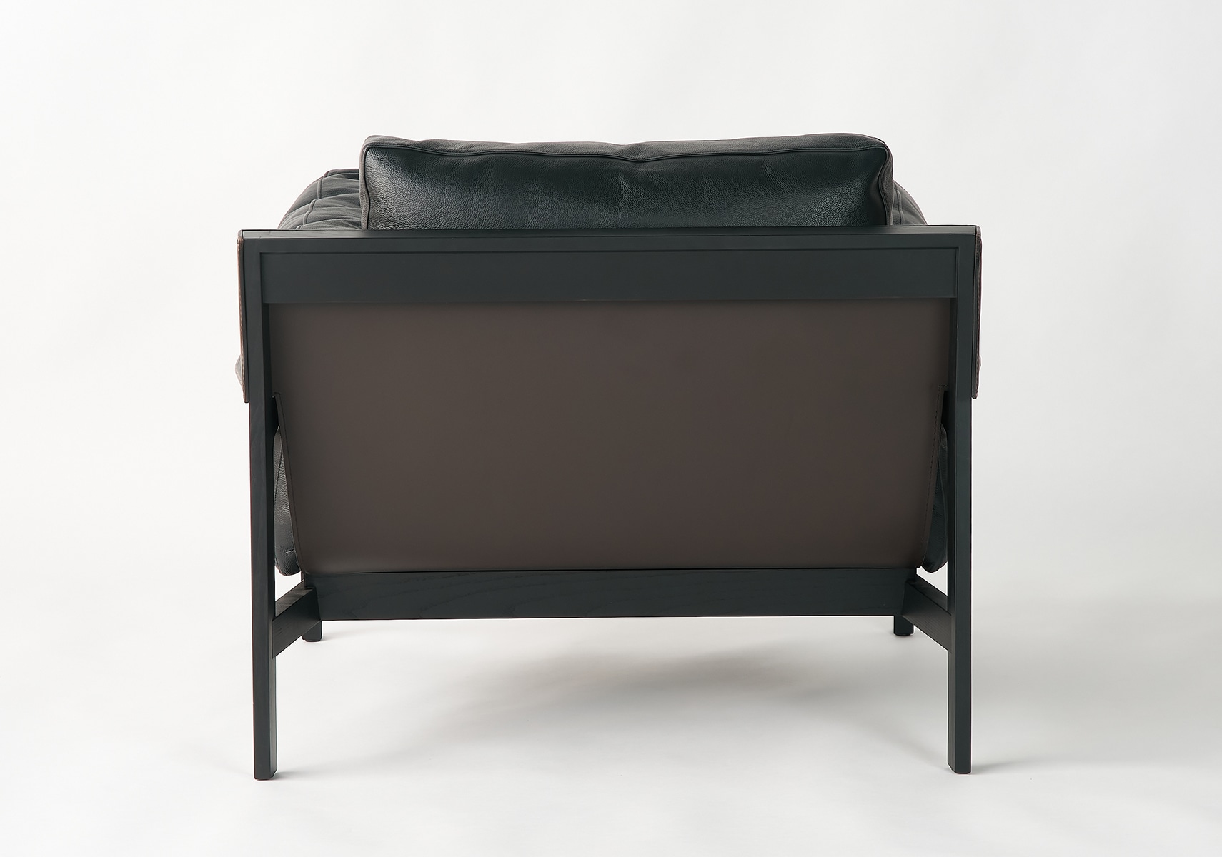 - フレーム=アッシュ材・ブラック染色塗装仕上 背=ダークブラウン革 背・座・アームクッション=玉綿入りフェザーパッディング 座クッション=ポリウレタンフォーム・フェザーパッディング 張地=13X606(Xランク)レザー