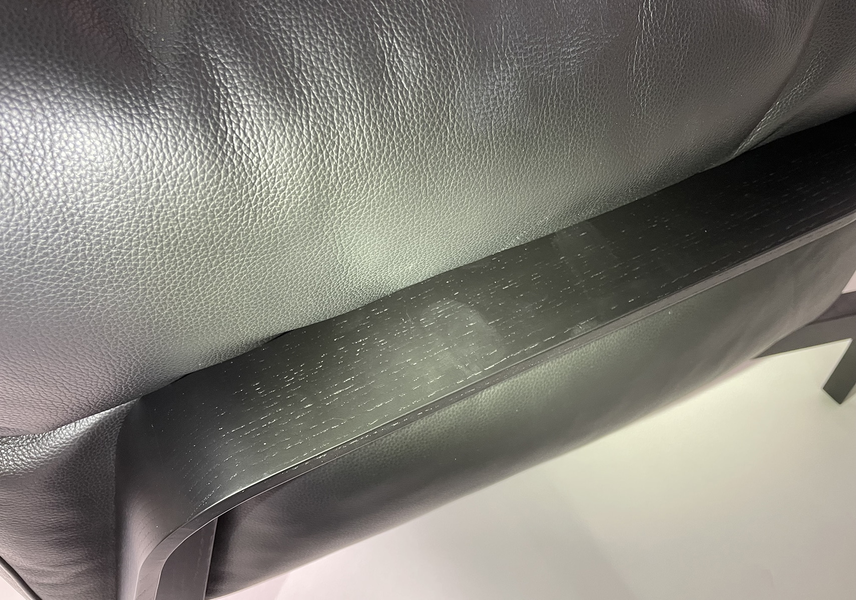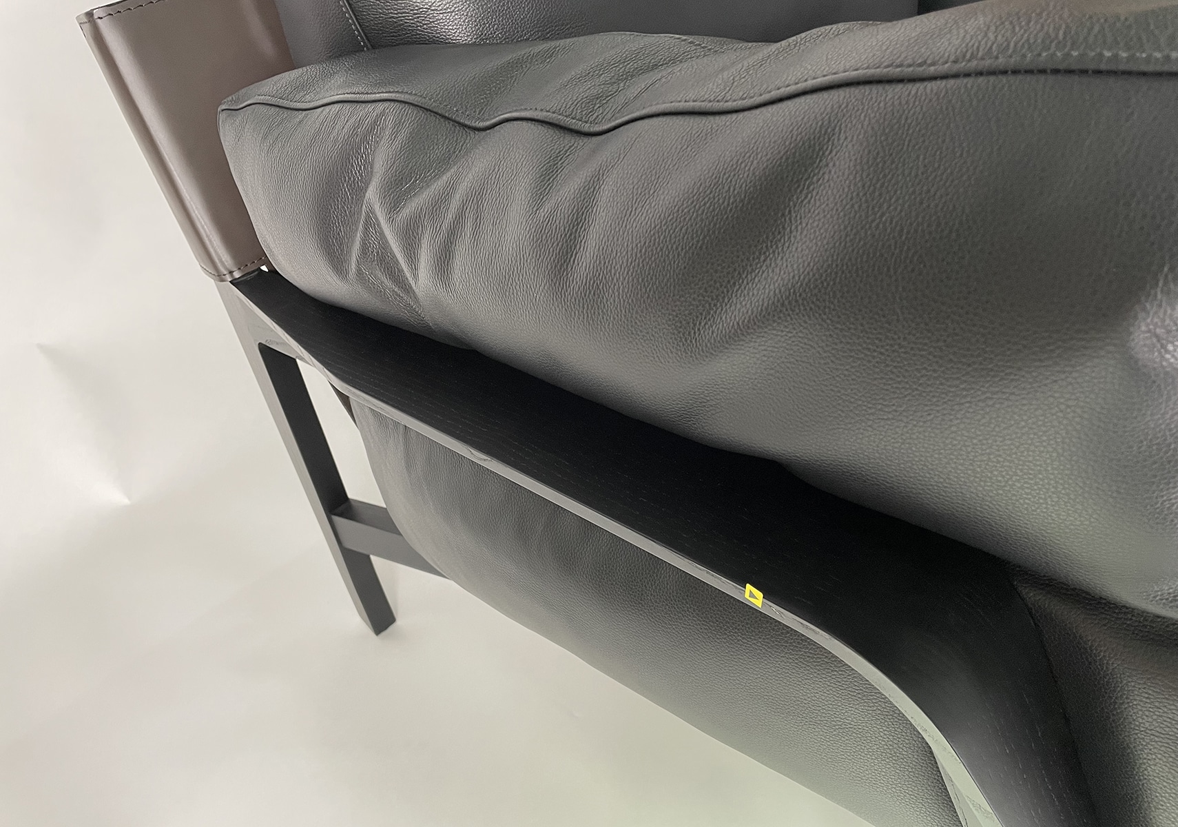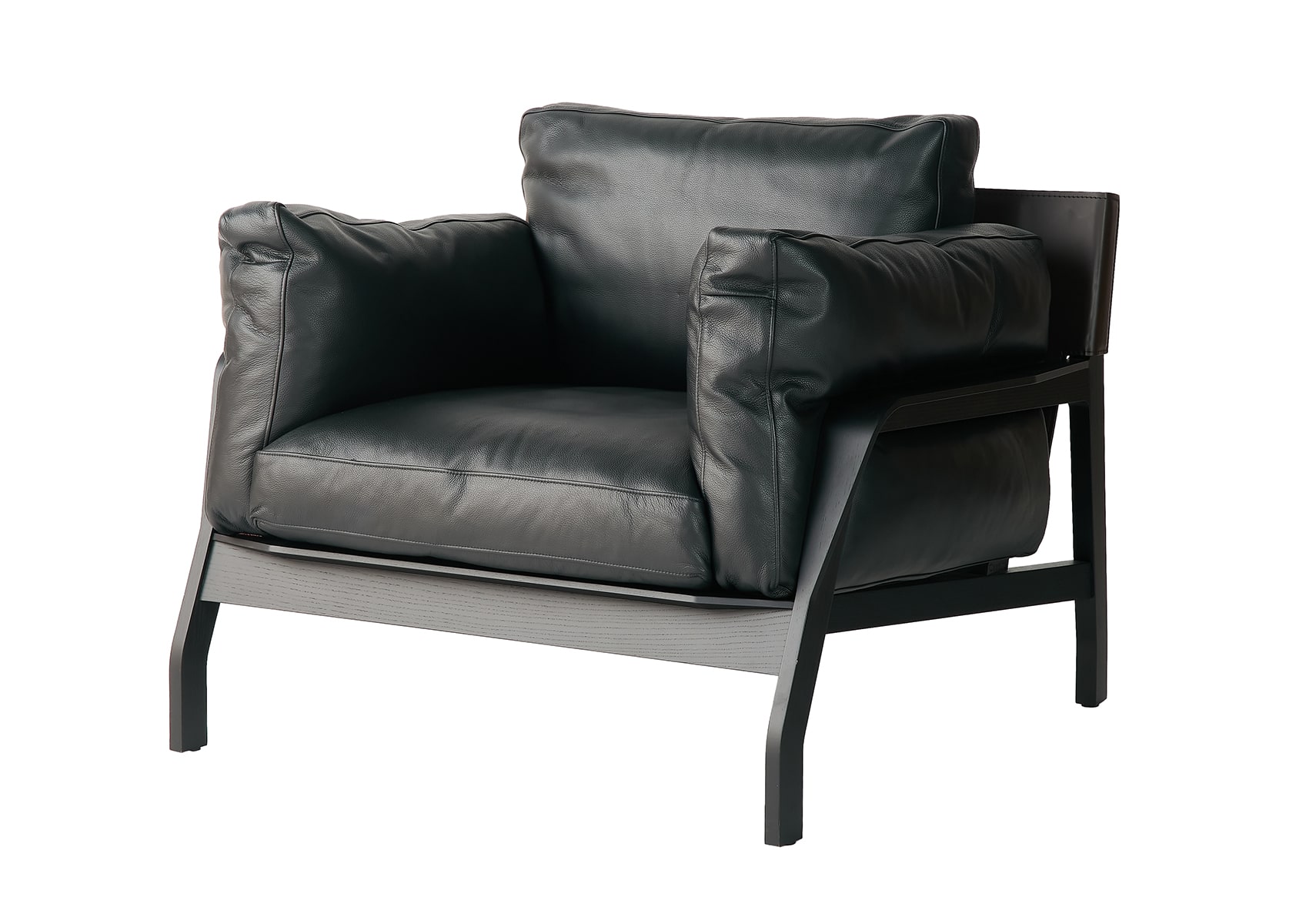 - フレーム=アッシュ材・ブラック染色塗装仕上 背=ダークブラウン革 背・座・アームクッション=玉綿入りフェザーパッディング 座クッション=ポリウレタンフォーム・フェザーパッディング 張地=13X606(Xランク)レザー