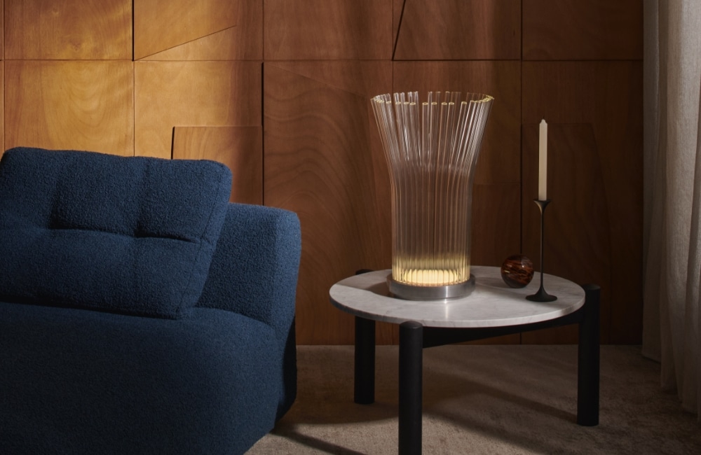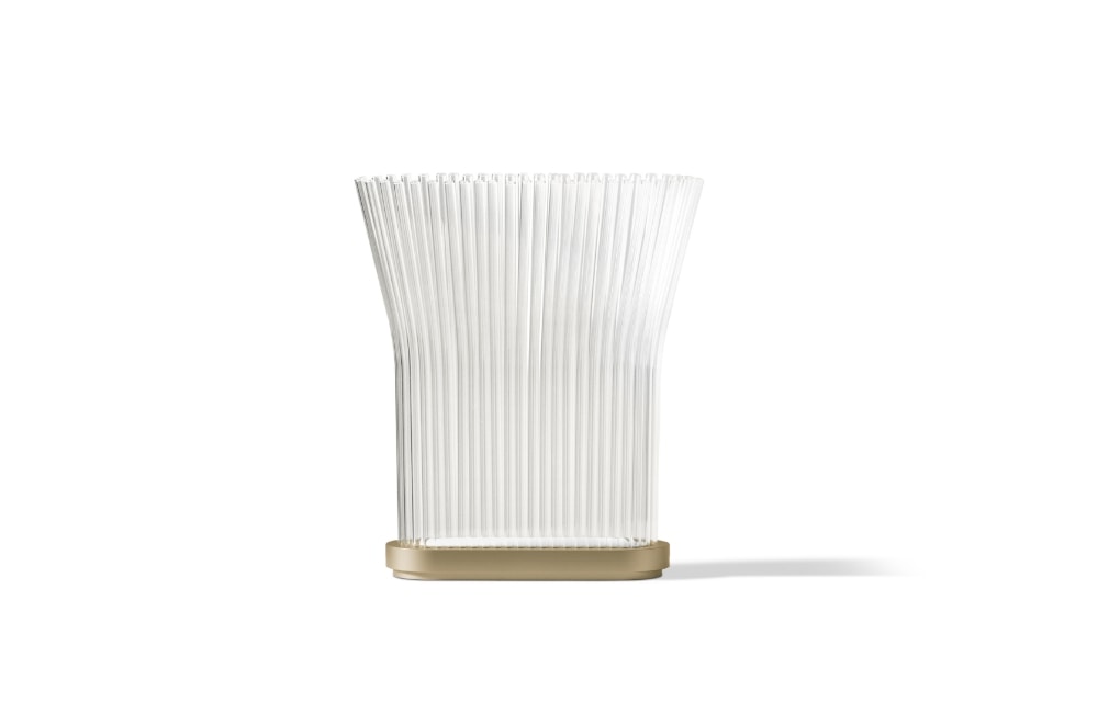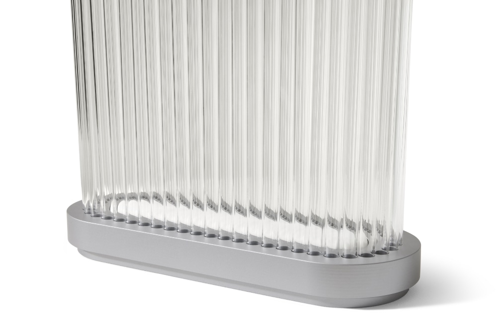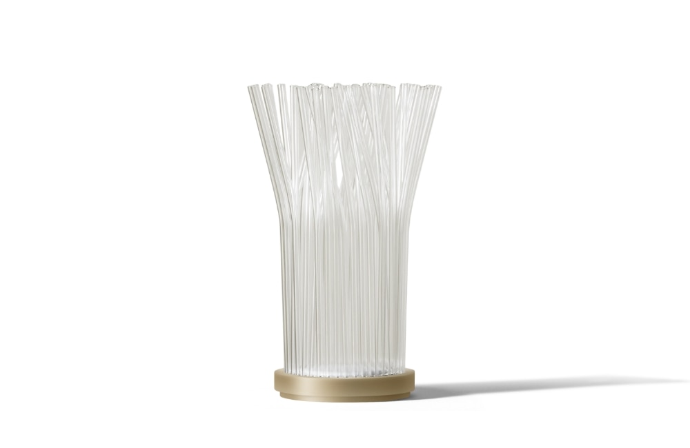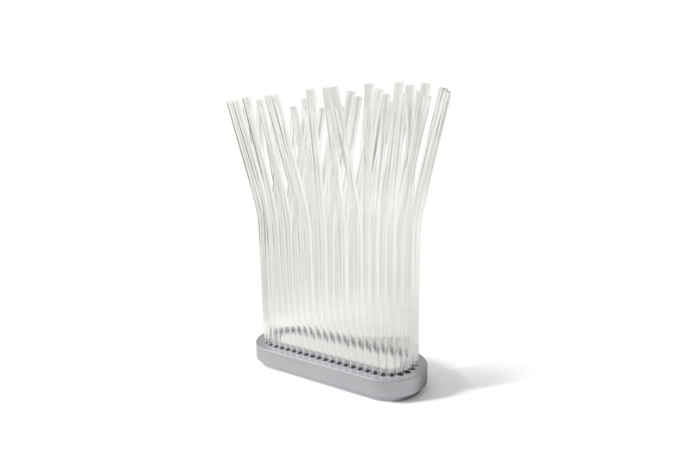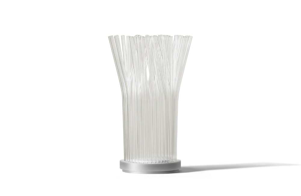FLUXUS-E(フルクサスE)テーブルランプのコンセプトは、イタリアのデザイナー、パオロ・ウリアンによって、ウーゴ・ラ・ピエトラのキュレーションによるビック男爵の発明に関する展覧会のために考案されました。このランプのアーチ状のアームは、当時、ペンの透明なプラスチックチューブで作られていました。2001年、ウリアンはこのデザインを商業用にさらに発展させ、透明なホウケイ酸ガラスのチューブを回転させてさまざまな形を作り、その彫刻的なフォルムを維持しました。 現在、FLUXUS-Eはカッシーナによって完全に最適化され、1つのLEDモジュールがテーブルランプの中央部と周辺部を照らし、各単管の下に配置された小型のスポットLEDライトがガラスを通して光を放ち暖かい光を拡散させています。 蓮のように外向きに、花のつぼみのように内向きに、イソギンチャクのようにランダムに、光を拡散する単管を容易に回転させることができるユニークなデザインです。