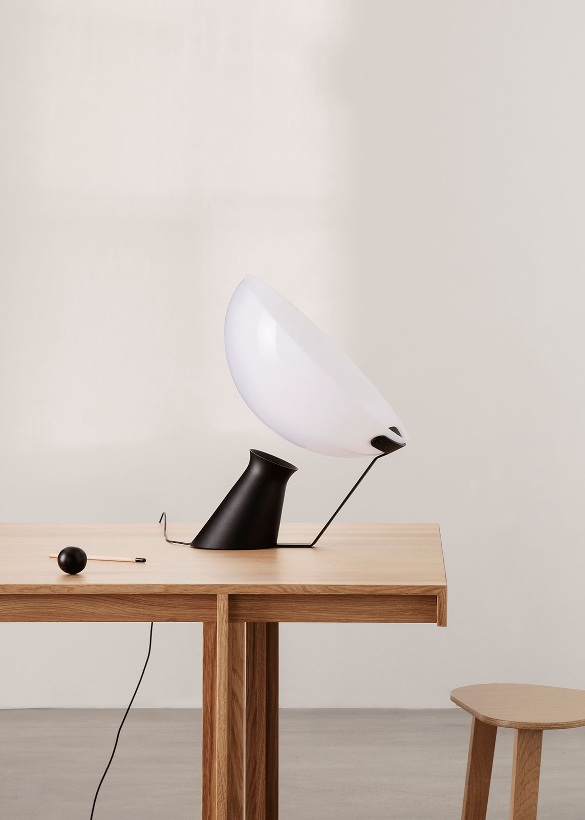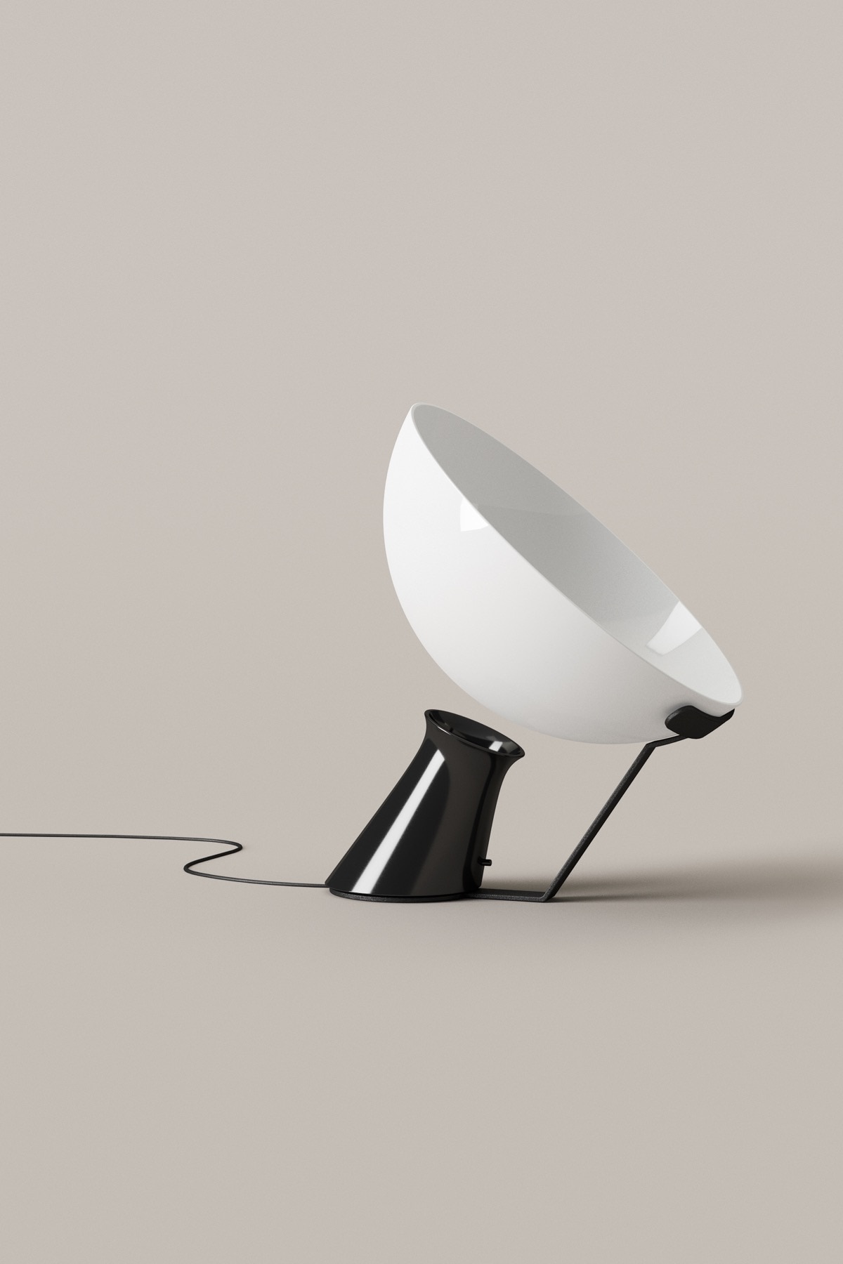 素材へのアプローチで高く評価されたイタリアの建築家、彫刻家、デザイナーのアンジェロ・マンジャロッティは、ベースとシェードの間の視覚的な分断と心地よいアンビエント照明を備えた、重力に逆らうようなデザインのテーブルランプを生み出しました。スリムな柱が大きくて重い天井を支えるという彼の建築の原則を参照し、マンジャロッティは美しく落ち着いたシルエットを考案しました。