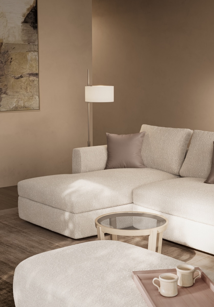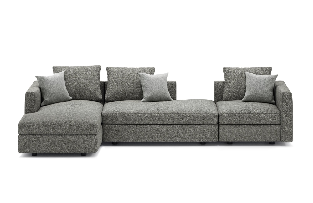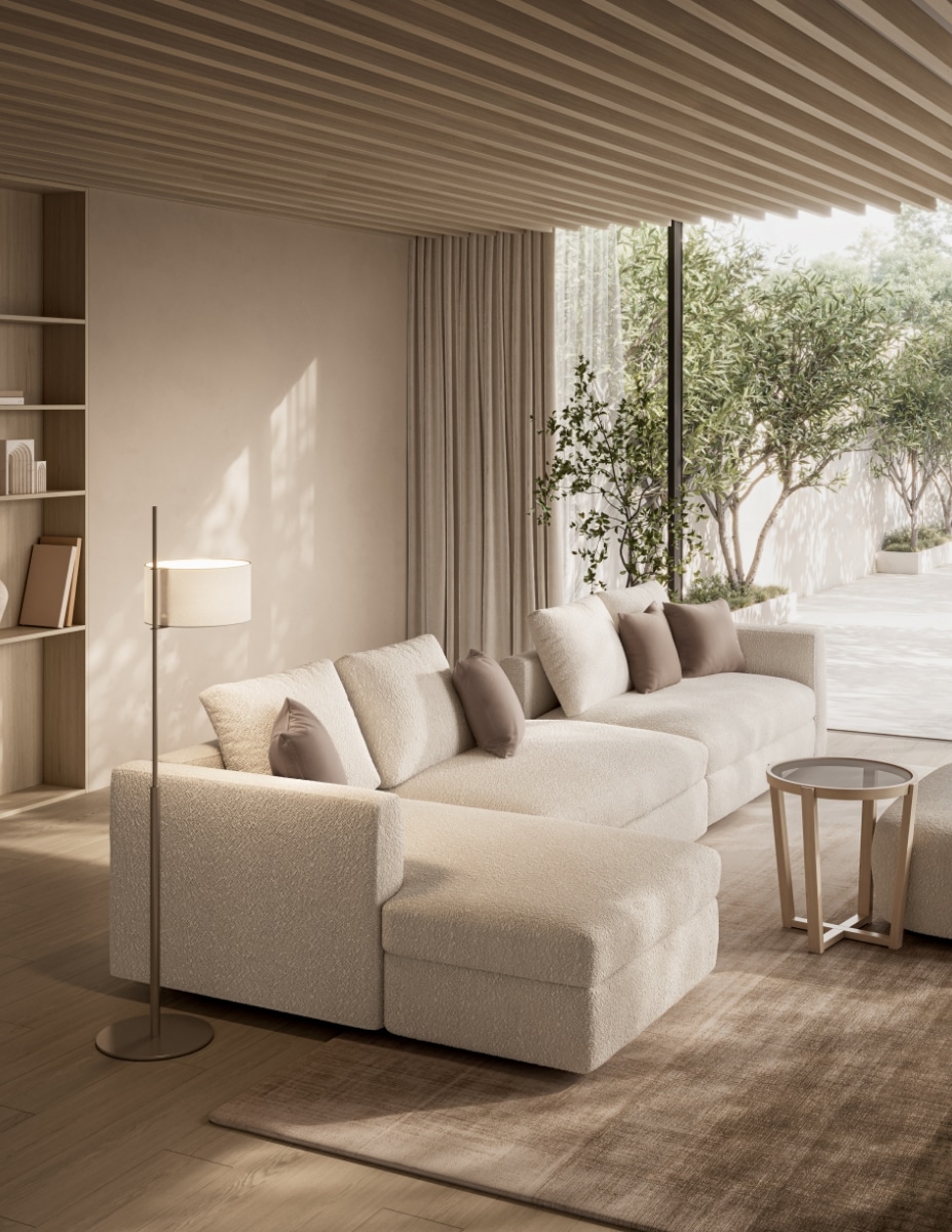鳥が大空に翼を広げたような、美しい広がりを感じさせるシステムソファです。ストレートやカウチ型のみならず、ゆるやかな角度でレイアウト展開できるモジュールになっています。座る角度や方向も自由で思い思いにくつろぐことができ、新たなつながりをもたらす場所が生まれます。