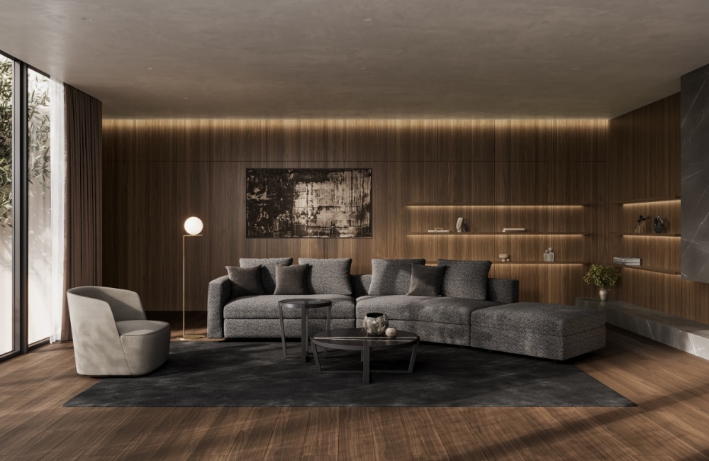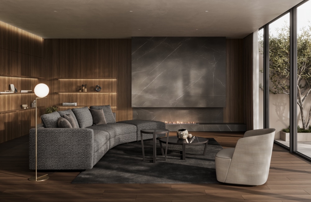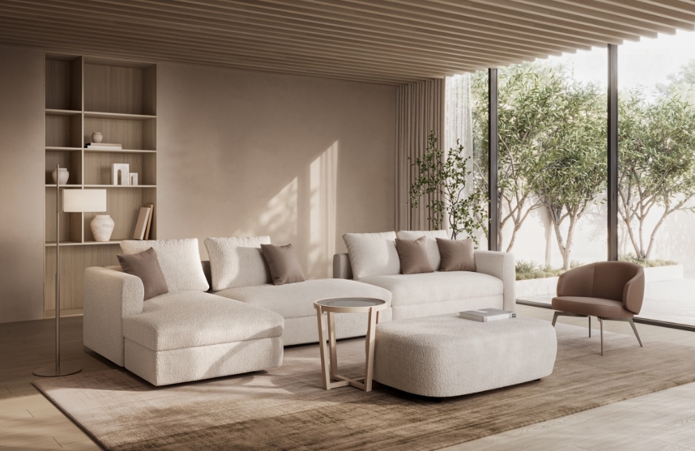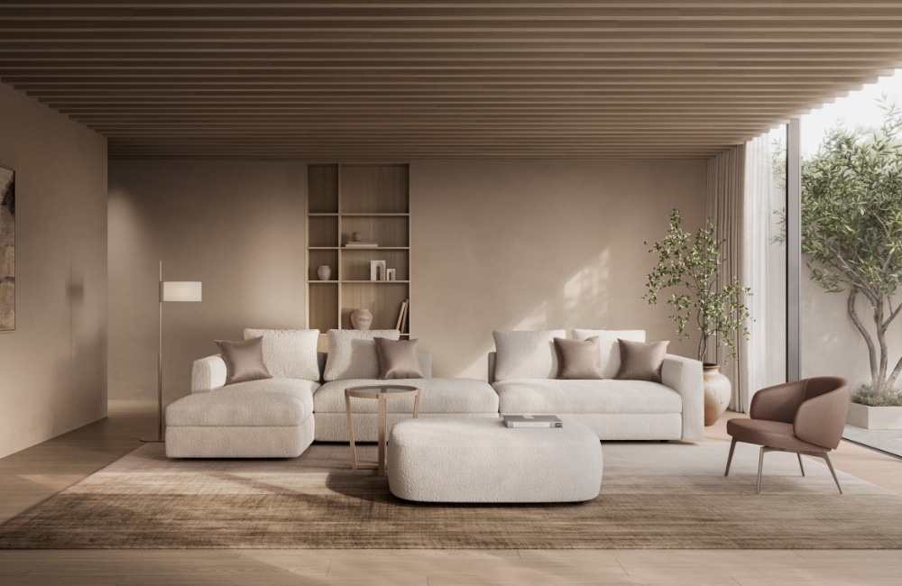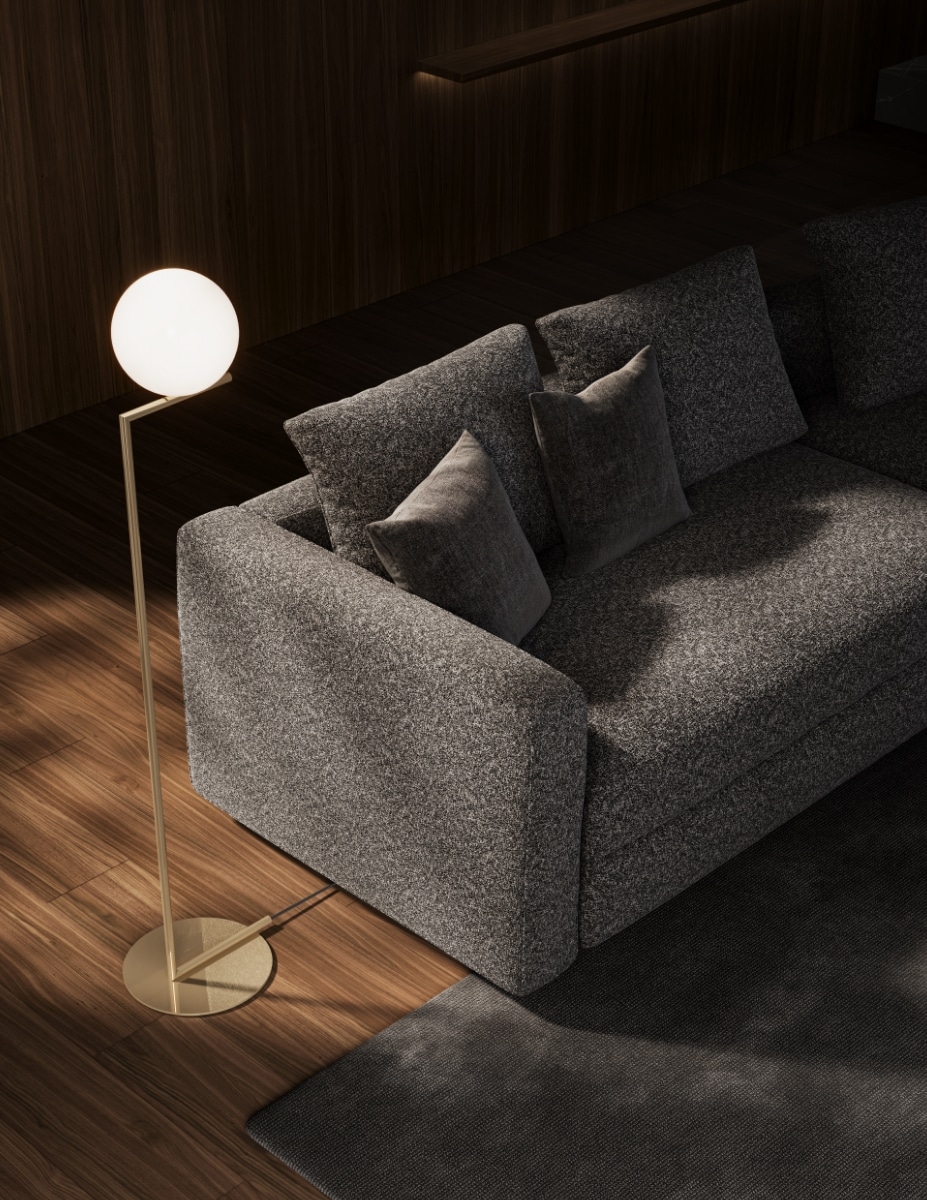 鳥が大空に翼を広げたような、美しい広がりを感じさせるシステムソファです。ストレートやカウチ型のみならず、ゆるやかな角度でレイアウト展開できるモジュールになっています。座る角度や方向も自由で思い思いにくつろぐことができ、新たなつながりをもたらす場所が生まれます。