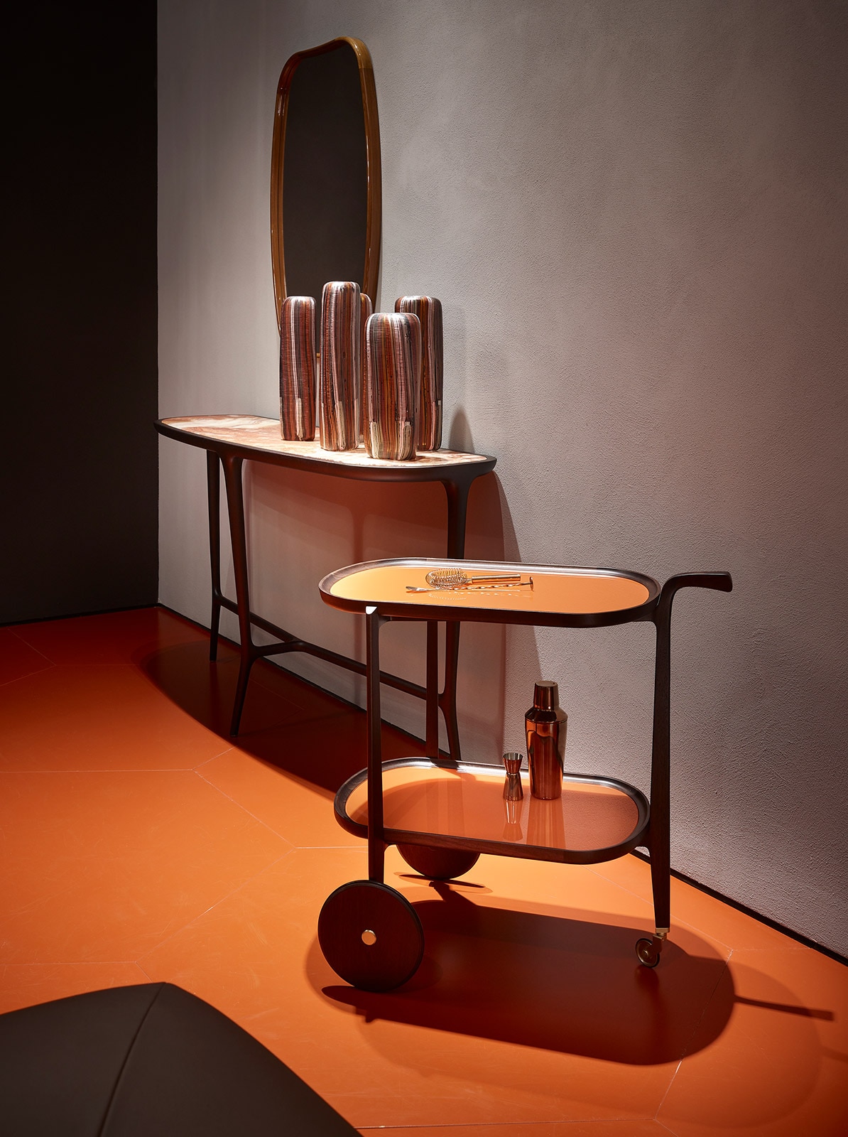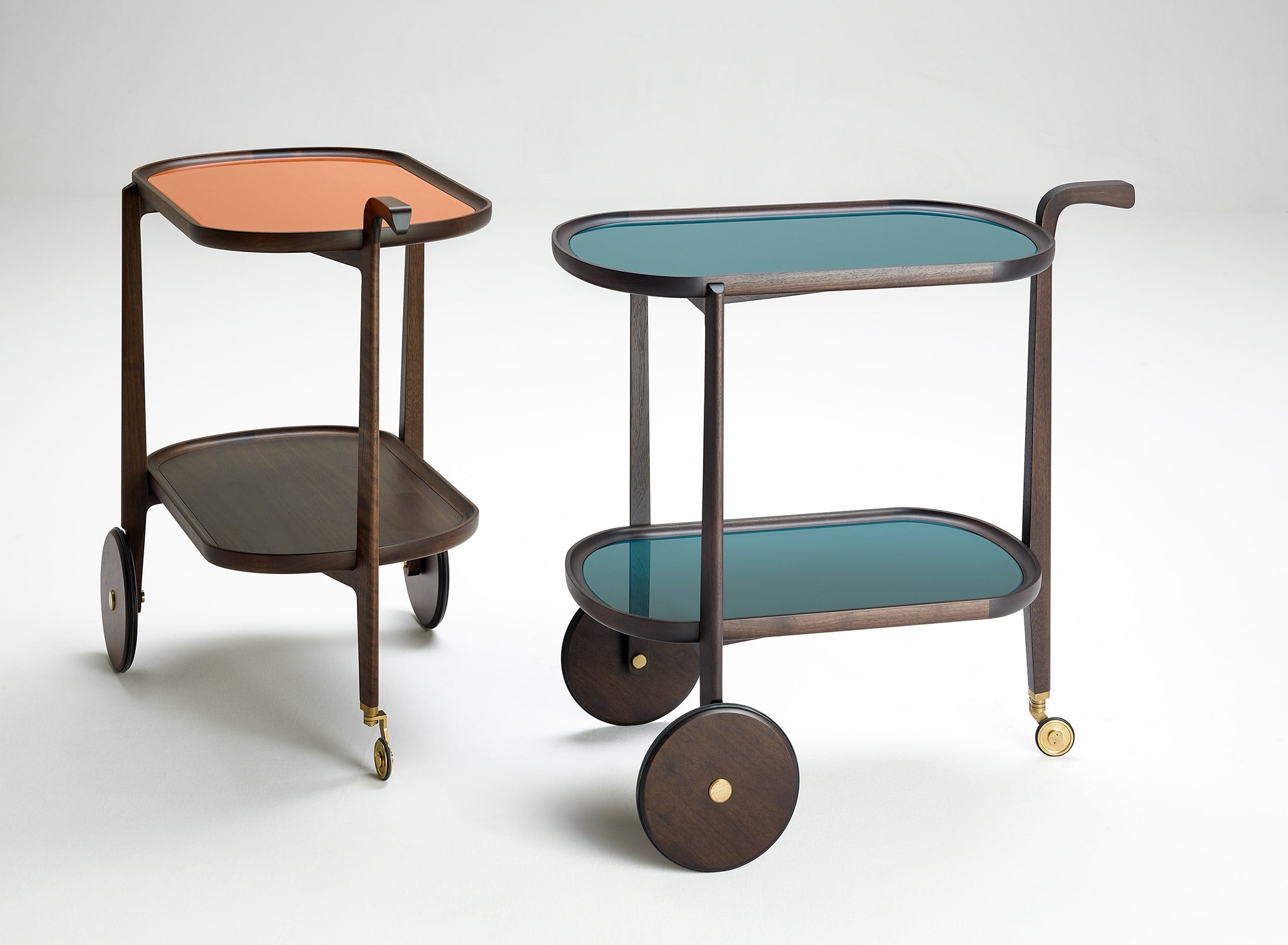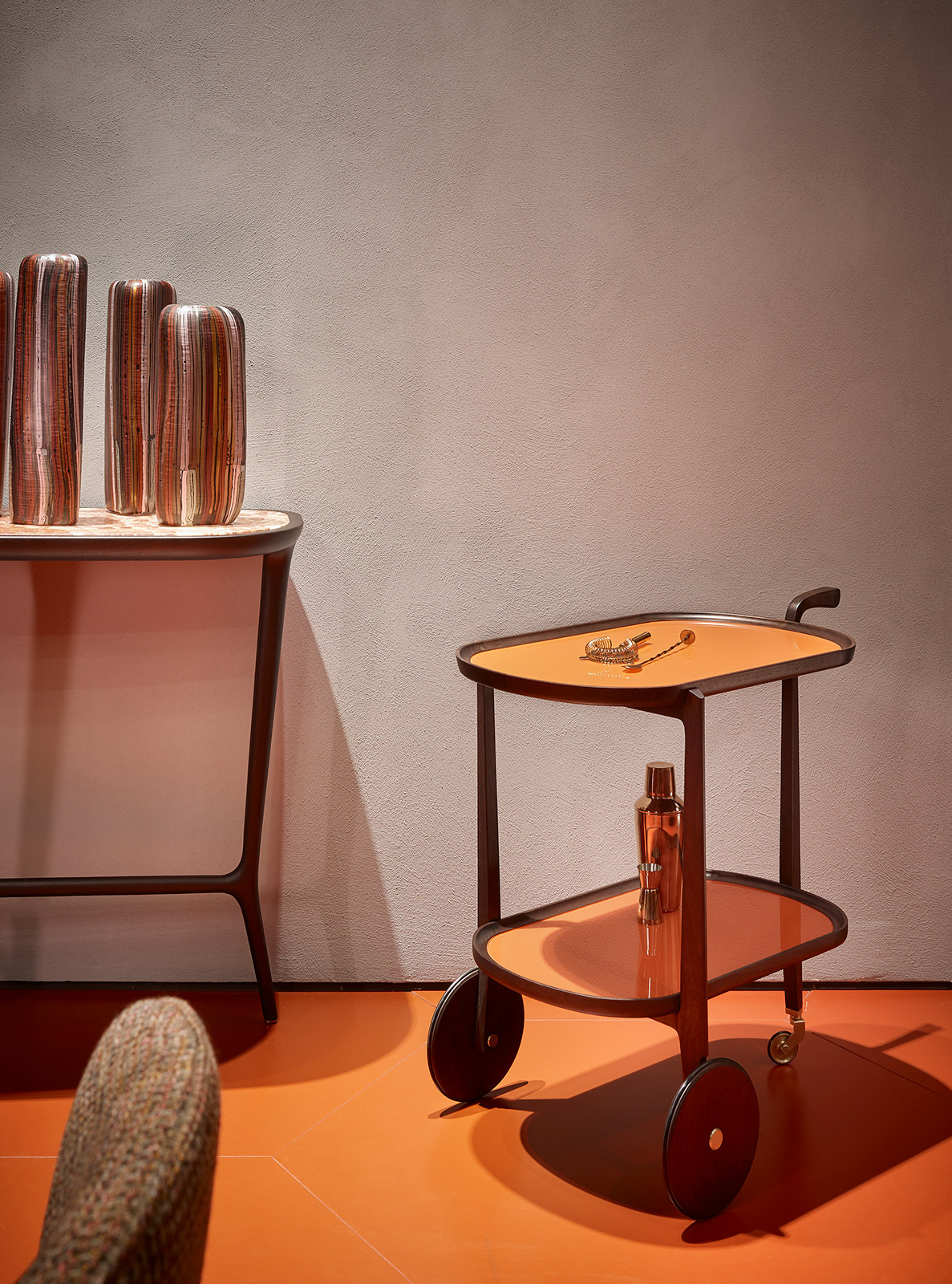 カクテルの名前から名付けられたこのワゴンは、材料を運び、カクテルを作ってゲストにふるまうという生活のワンシーンを想起させます。1950〜1960年代には様々なデザインのワゴンが存在しましたが、昨今のモダンデザインの中では少なくなっていました。そこでカーサローザのデザインとチェコッティ・コレツィオーニの木工技術とを融合させ、現代の生活の中に溶け込むワゴンを実現しました。上部のトレーは可動式で、取り外してそのままテーブルなどに移動可能です。