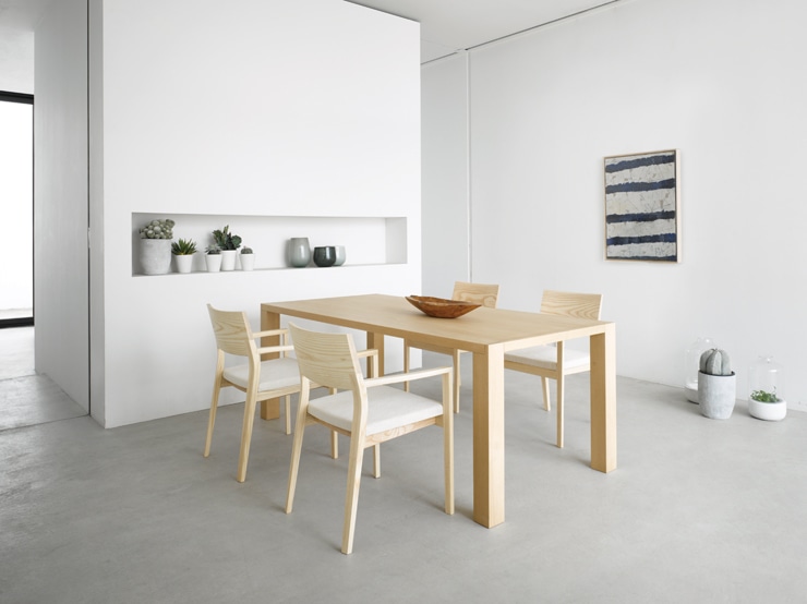 木が持つ素材感を大切にデザインされた「BREATH」。無垢材と突板のハイブリッドな組合せと、90mm角の脚に40mm厚の天板が組みあげられているようなデザイン。重厚でありながらも、軽快感のあるテーブルになっています。呼吸という意味を込めたネーミングには、木も人と同じく呼吸が欠かせないものであることから名付けられました。