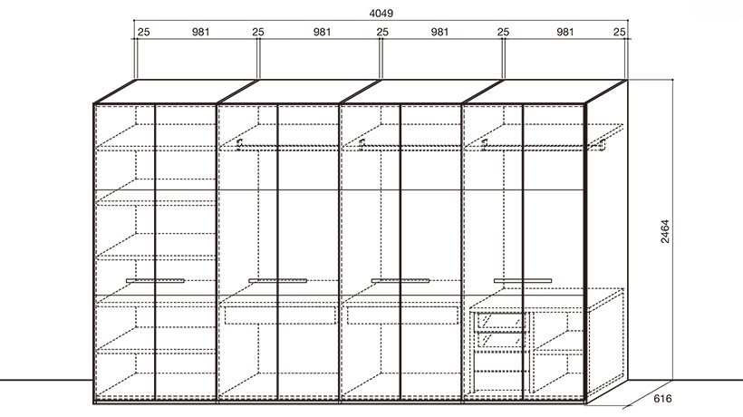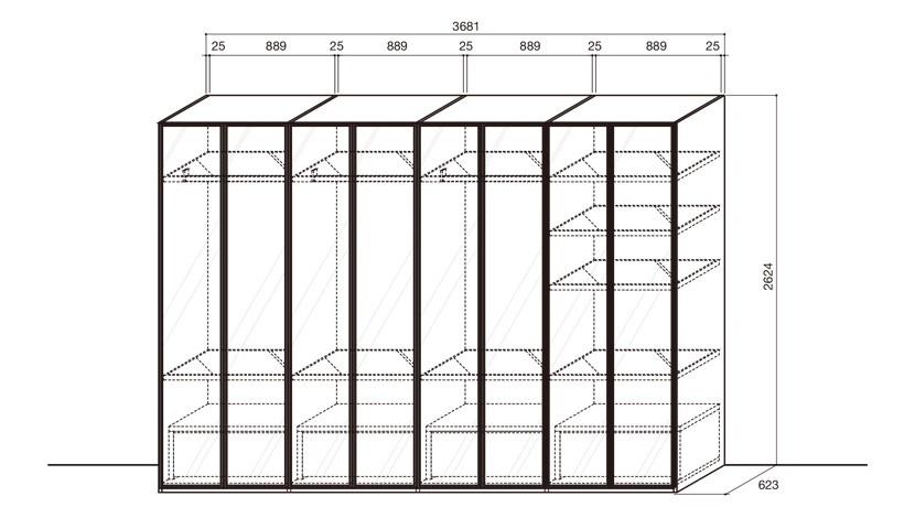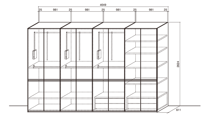 スペースに合わせてデザイン・モジュールを選択し、組み合わせるクローゼット。扉の素材、開き方も選択でき、自由な構成をもたらします。ベッドルームのクローゼットとして以外にも、シェルフの組み合わせ次第でリビングやダイニングの収納としてもご使用いただけます。