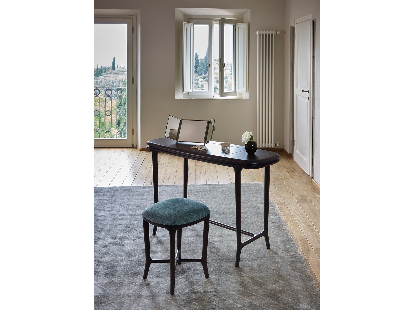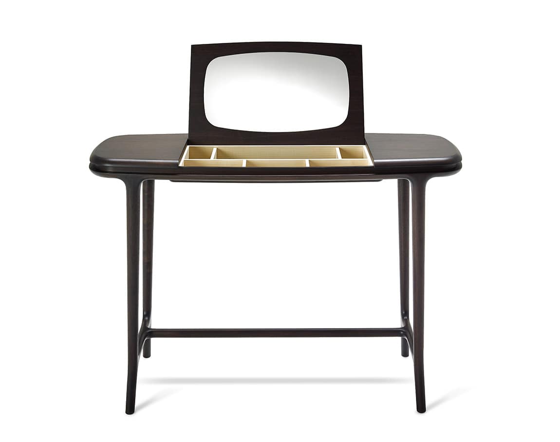 モダンなデザインのドレッサーはフラップアップ式の天板内側にミラーを備え、小物を収納する十分なスペースも確保しています。ドレッサーとしてだけではなく、スモールデスク、コンソールとして多目的に活躍するアイテムです。