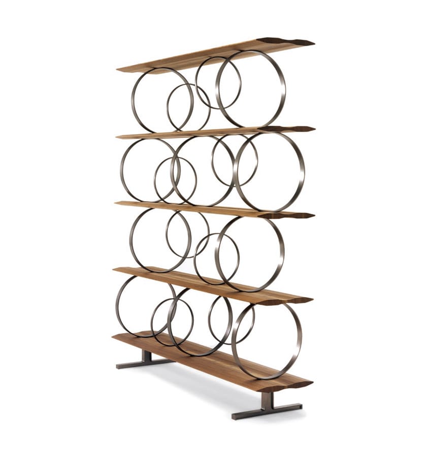 無垢材の棚板の間にランダムに配された大・小のスティールリングが、小気味よいリズムを刻むブックシェルフです。小さい方のリングはブックスタンドの役割も果たします。標準は4段仕様ですが、ご希望に応じて段数を変更して製作することも可能です。