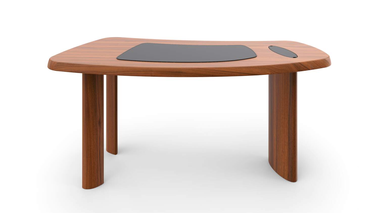 丸みを帯びたエッジで非対称なフォルムのこのデスクは、エグゼクティブオフィスやホームオフィスのような空間にもフィットします。3本の支柱で構成され、1本は大きく、他の2本は細長い円筒形になっています。脚部には金属製の補強材を使用し、電源ケーブルを収納することができます。