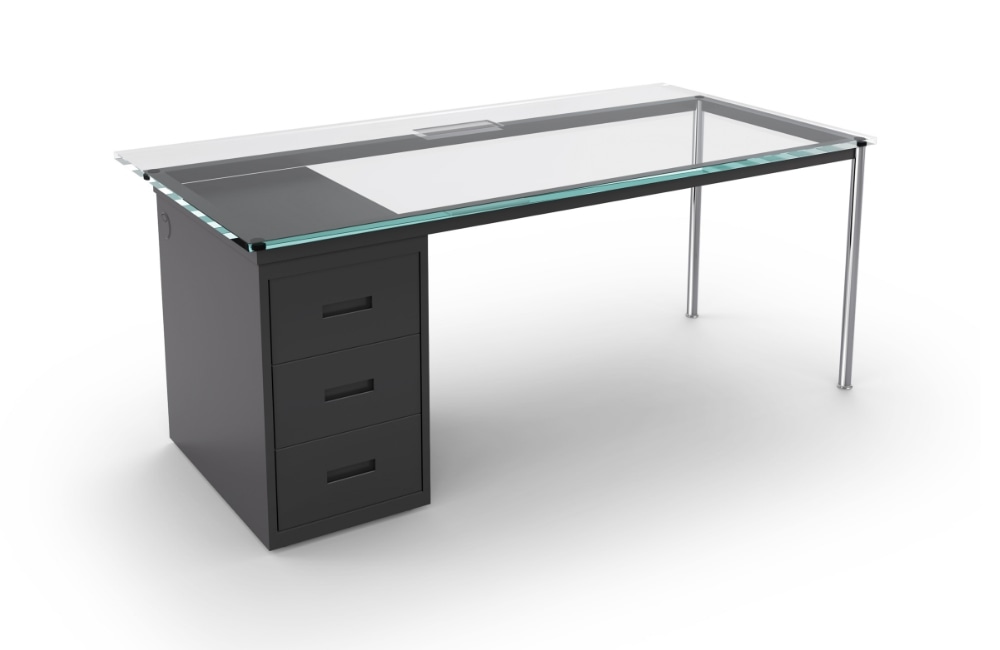 1929年のサロン・ドートンヌに出展されたル・コルビュジエ、ピエール・ジャンヌレ、シャルロット・ペリアンによるテーブル「Table dalle polie」を、フランスの週刊誌「 La Semaine à Paris.」 のディレクター室のために改めてデザインされたデスクです。ファイルを収納するためにメタルのサイドコンテナを追加し、片持ちのガラス天板を大きくしてペンと鉛筆を置くためにその一部をわずかにくり抜きました。