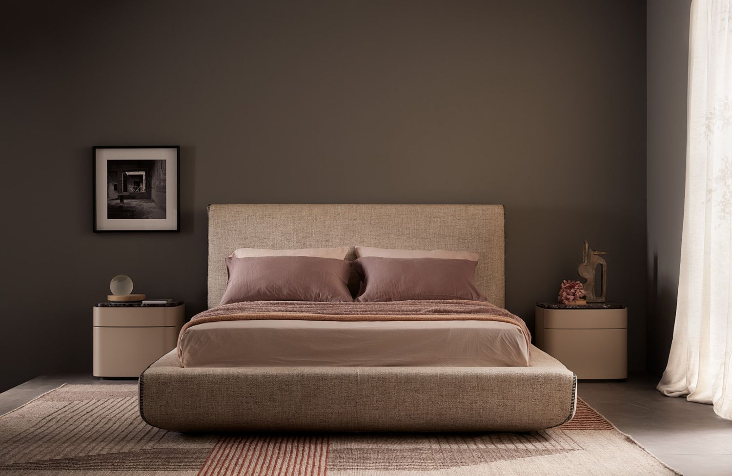 高さのある印象的なヘッドボードが特徴のLULLABY(ララバイ)ベッドは、シンプルでありながらエレガントなデザインで、控えめながらも視覚的なインパクトを与えます。 ファブリックをお選びの場合は、ヘッドボードと調和したブランケットステッチが入りベッド全体の完成度を一層引き立てます。