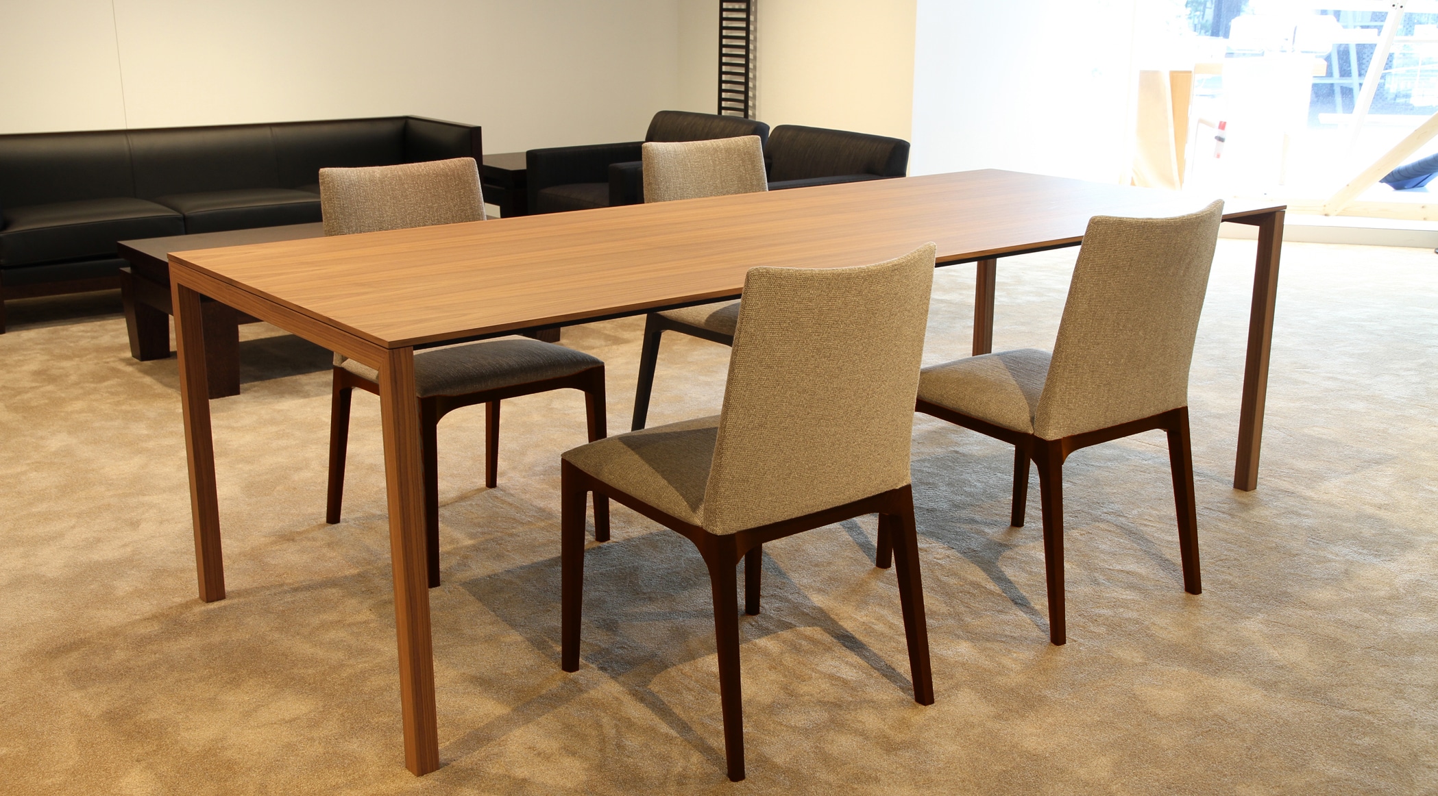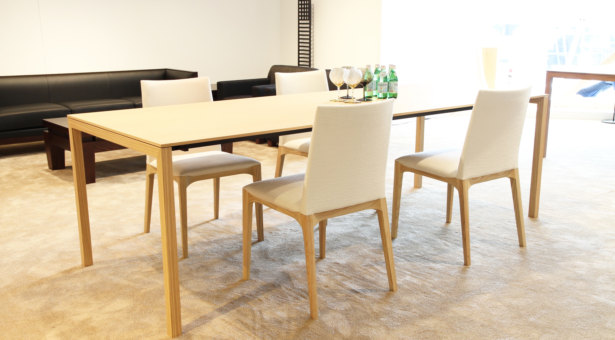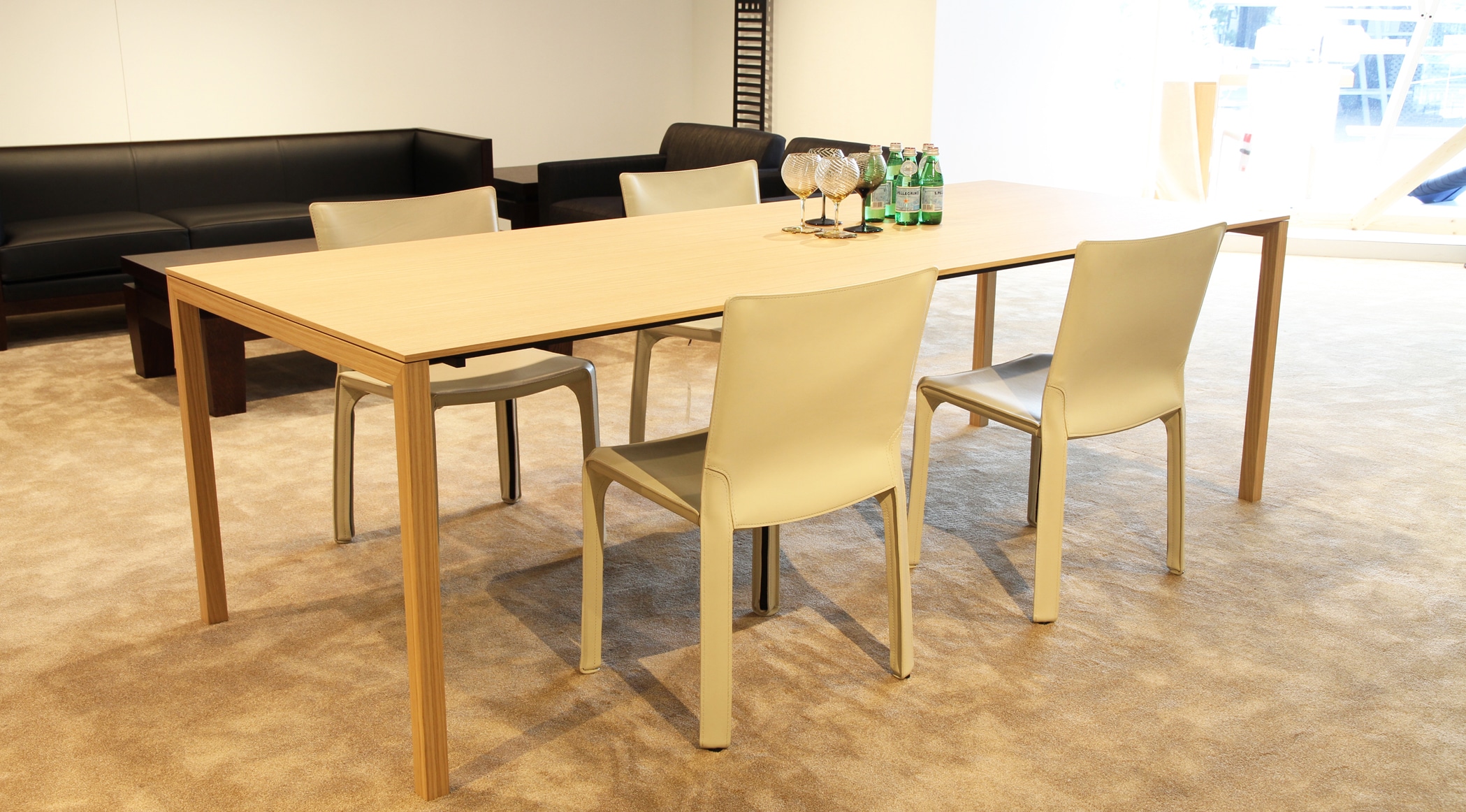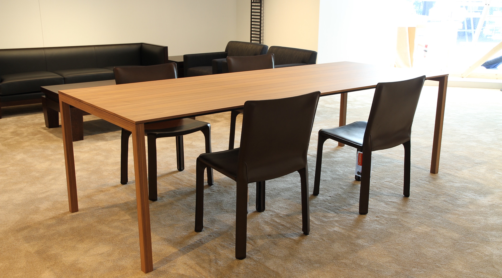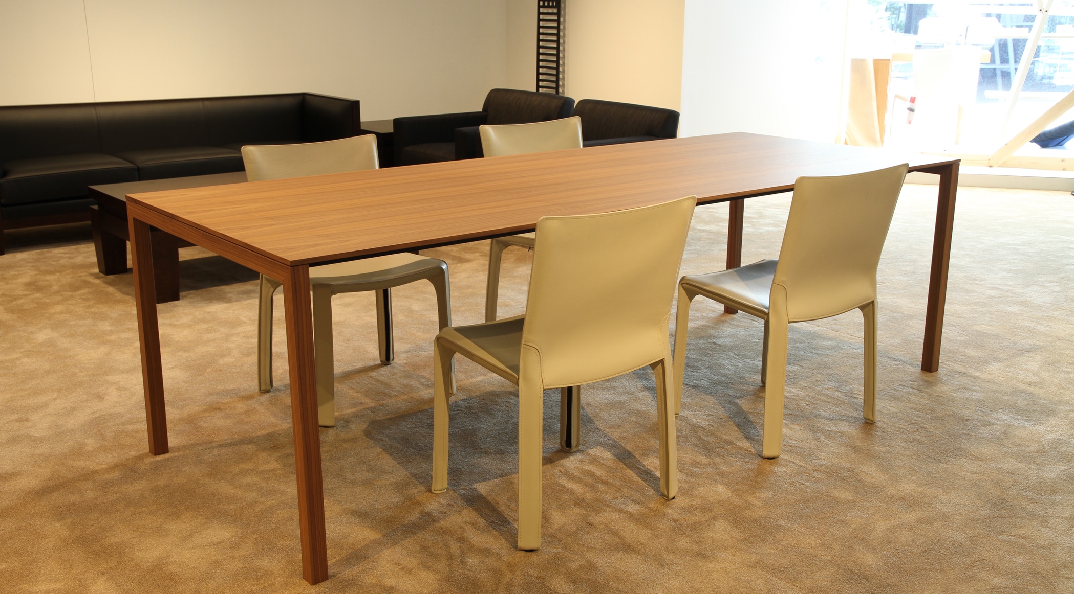 繊細な表情と堅固なフレームをあわせもつナーンは、2つのエッセンスを持ったエクステンション型テーブル。極限まで薄く仕上げた厚さはわずか10mmの天板は、カッシーナ社がこれまでに培った豊富な木工技術と、モダンインダストリアルのデザインを融合して実現しました。天板はオーク材とアメリカンウォールナット材を使用。化学変化により着色するという画期的な手法を取り入れることで、一般的なニス塗装に見られる人工的な見た目とは違い、自然な木目がそのまま活かされています。