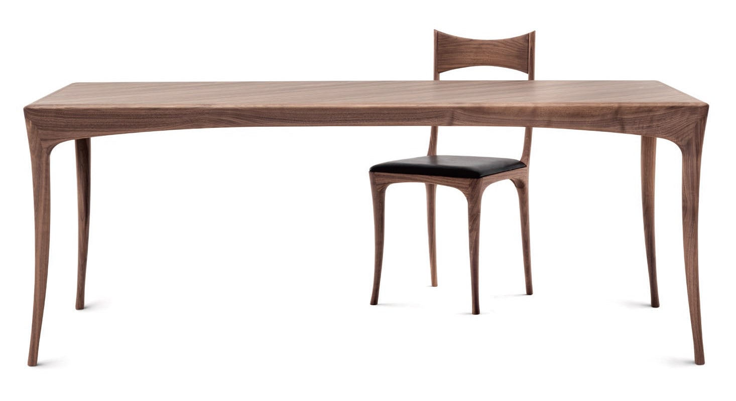 正方形と長方形のタイプがあるダイニングテーブル。4本脚のシンプルな木テーブルに見えますが、天板下のフレームのゆるやかな曲線が特徴的で、天板の木目はまっすぐに貼ったストレートトップと対角線上に斜め貼りを施したダイアゴナルトップをお選びいただけます。