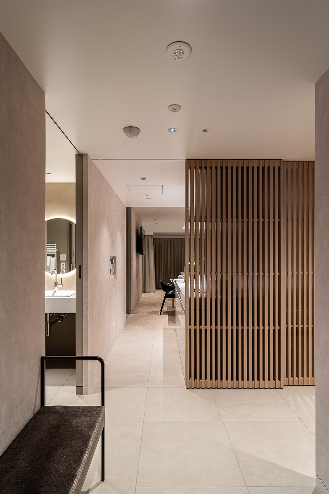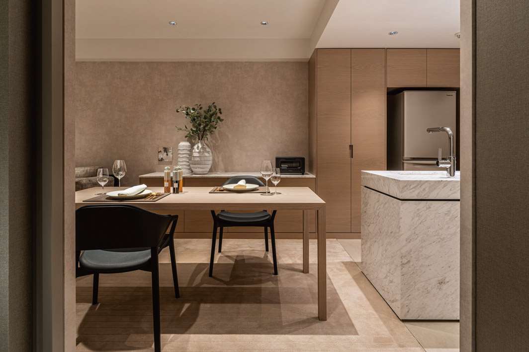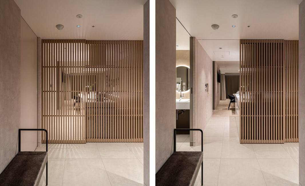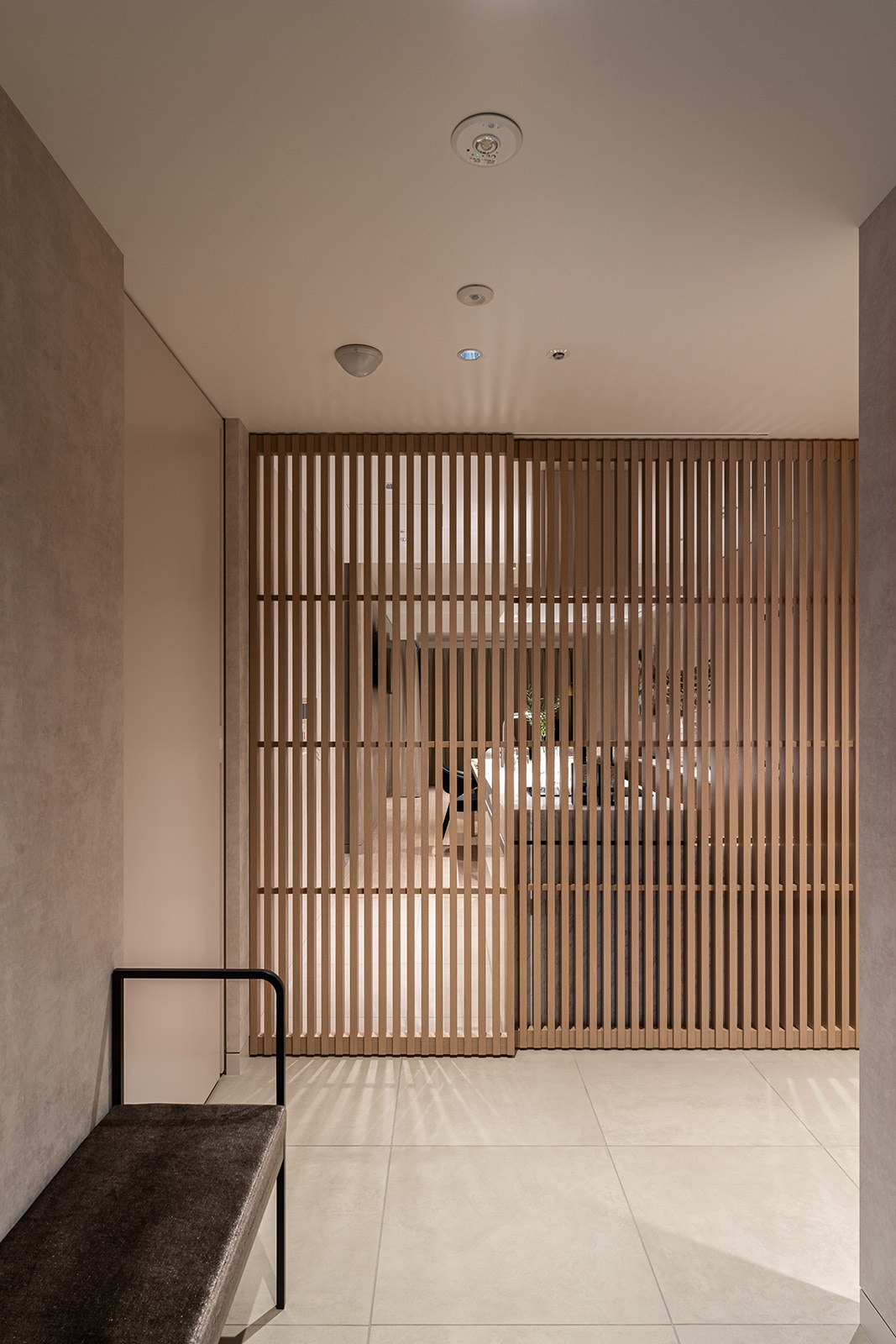 一般的にシニア向けの高級住宅というとダークで重厚感のあるインテリアを思い浮かべますが、エントランスから格子で繋がるLDK空間をピンクベージュの壁紙とナチュラルなオーク材をベースとし、明るく温かみのある空間に仕上げました。赤味のあるやさしい色使いは顔色を健康的に見せ、気持ちも明るくします。