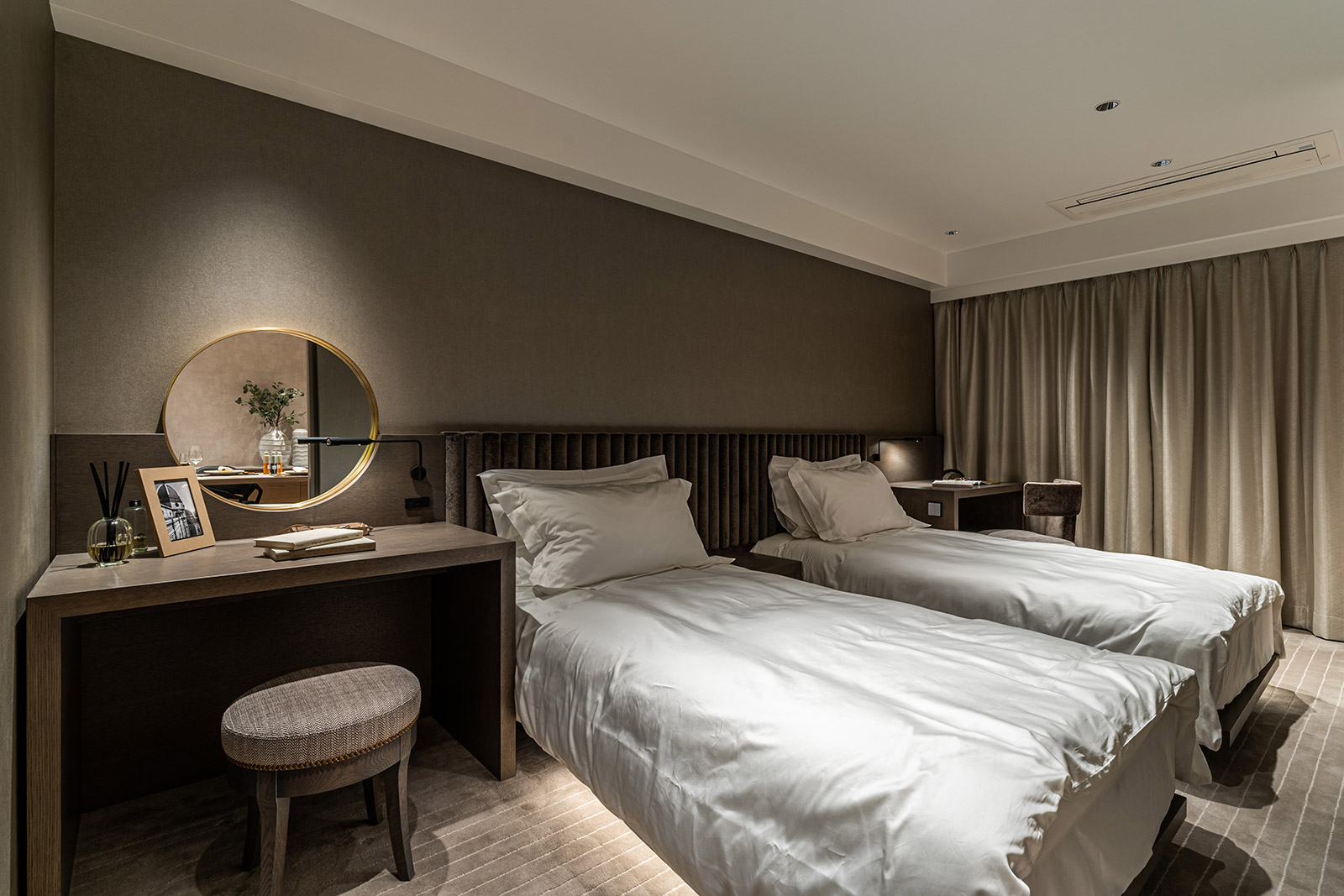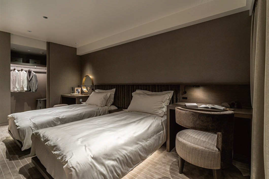 寝室はグレーのグラデーションで落ち着いた雰囲気に。暗闇の中では全ての色がグレイッシュに見えることから、日中横になるときにも夜と同じような環境で寛げる色使いにしました。また手で触れる部分にはガラスやメタルなど硬い素材は使わず、なめらかなベルベット生地のヘッドボードやざっくりとした触感のツイード生地のチェア、エッジを丸めたオーク材の家具など、やさしい手触りのもので構成しています。