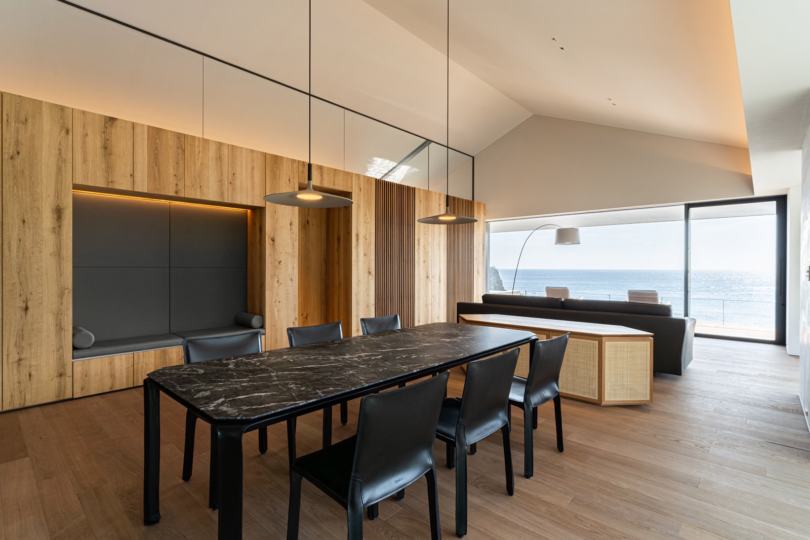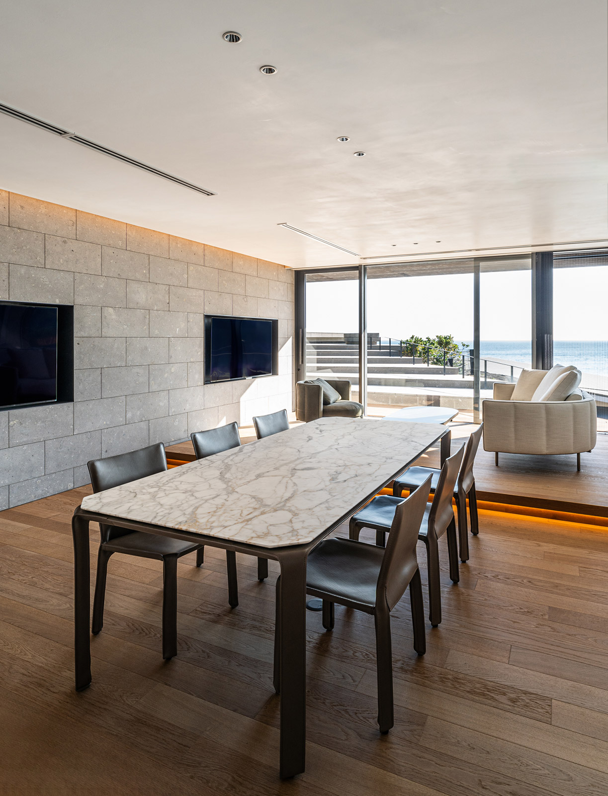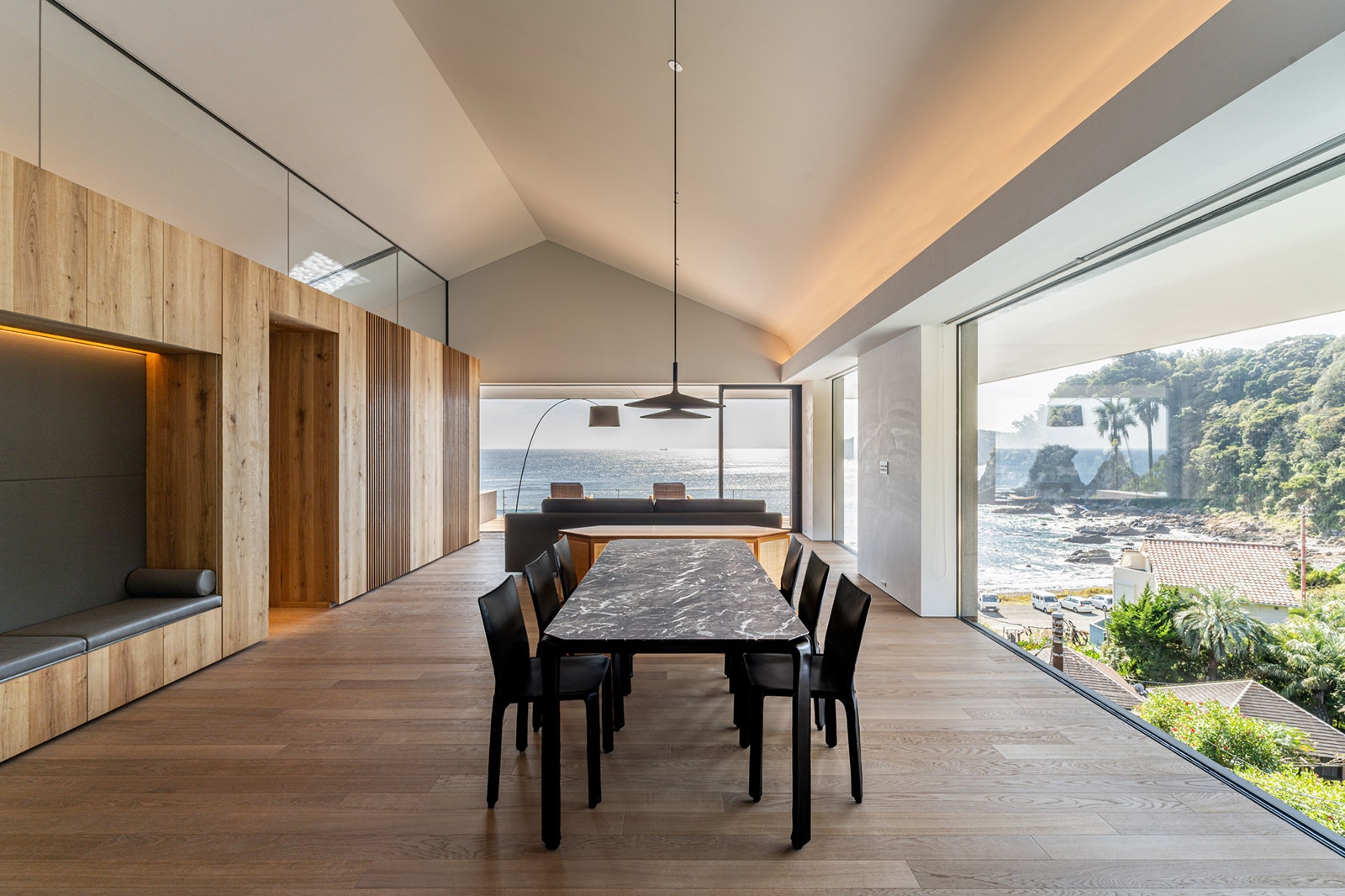 海に向けて配置した住居では、遮るもののない一面の太平洋が広がるリビングダイニングで、波音と共にゆったりとくつろぐことができます。テラスからも出入り可能な浴室に設置したのは、心を開放する半屋外のインフィニティバス。随所に用いた石や木の表情が、心地よい安らぎをもたらします。