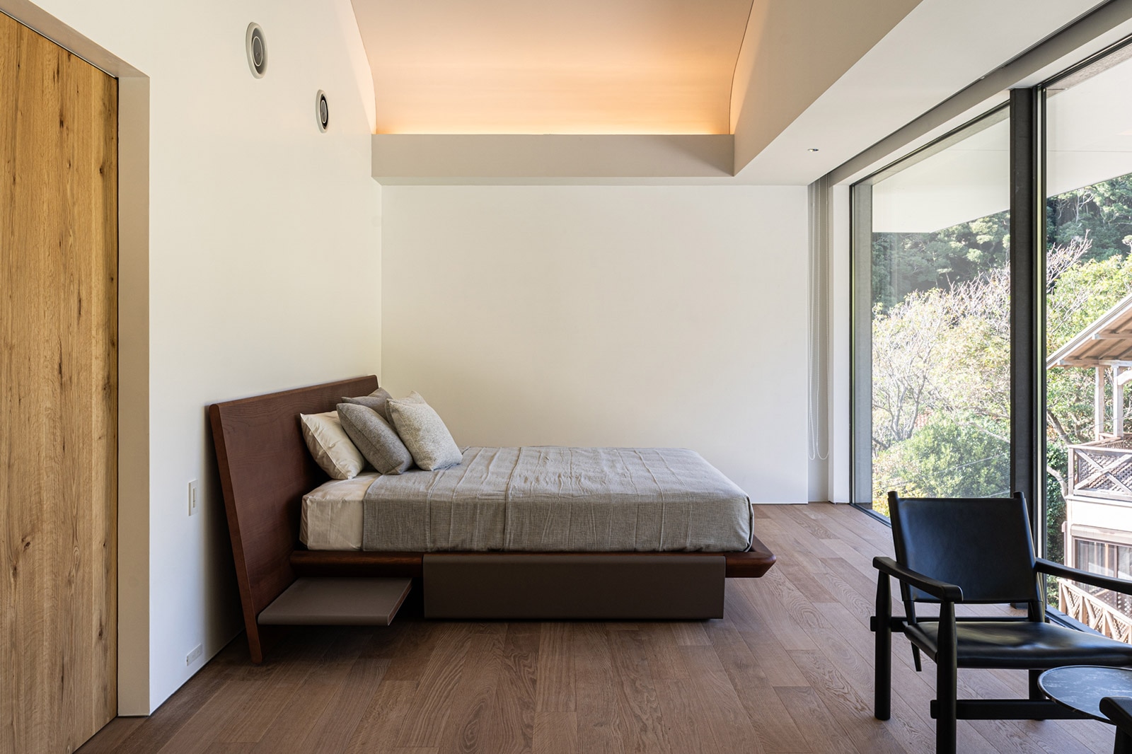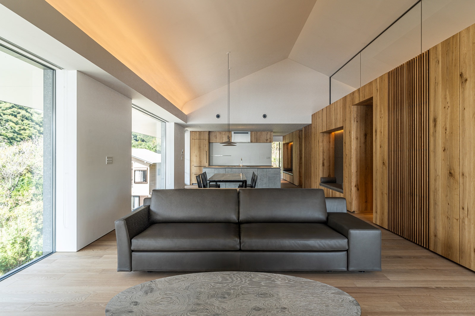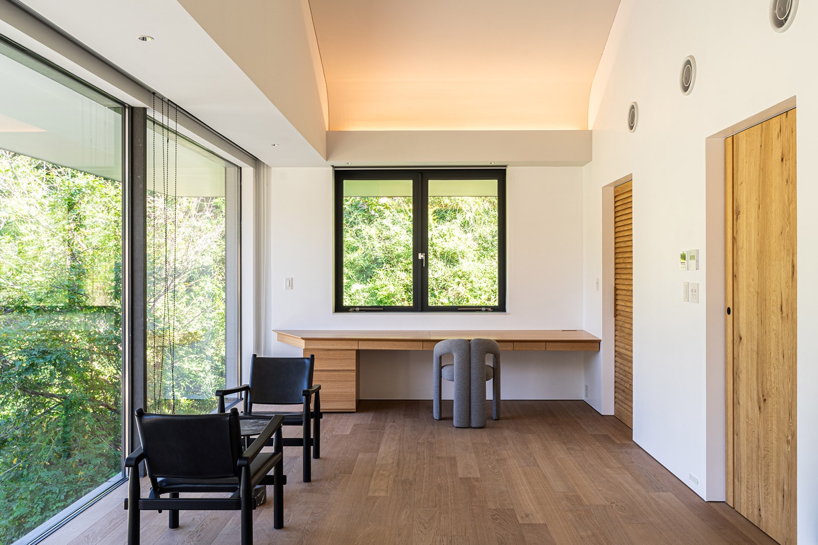 アトリエは、クリエイターの集中力を高めるため、より静的な山に向けて配置。大開口で森へと開かれた空間では、四季や時間、天候によって移り変わる自然から、多くのインスピレーションを得ることができます。