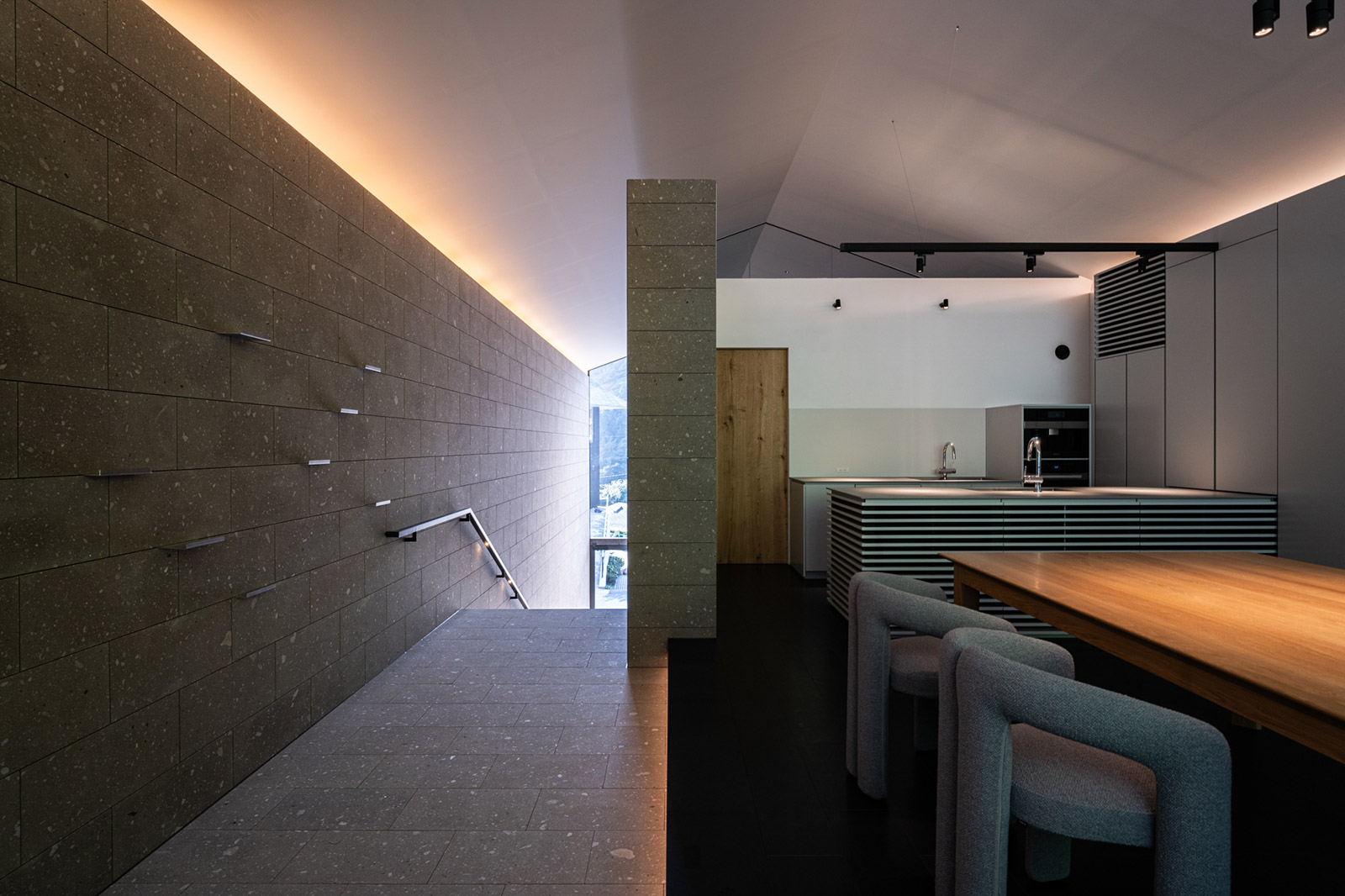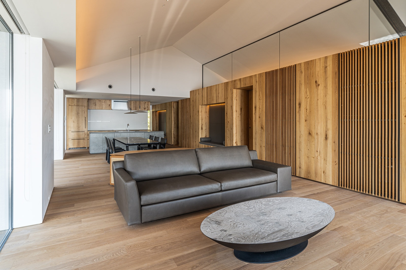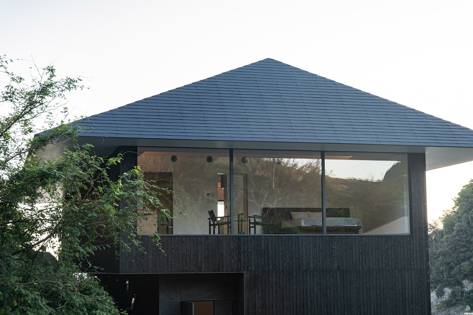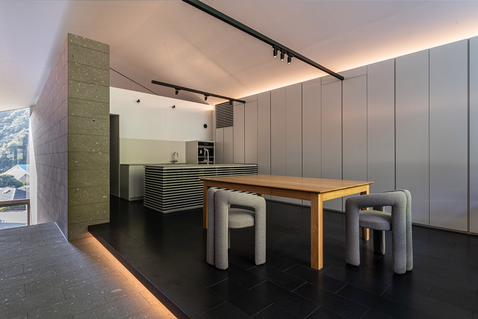 アトリエは、クリエイターの集中力を高めるため、より静的な山に向けて配置。大開口で森へと開かれた空間では、四季や時間、天候によって移り変わる自然から、多くのインスピレーションを得ることができます。