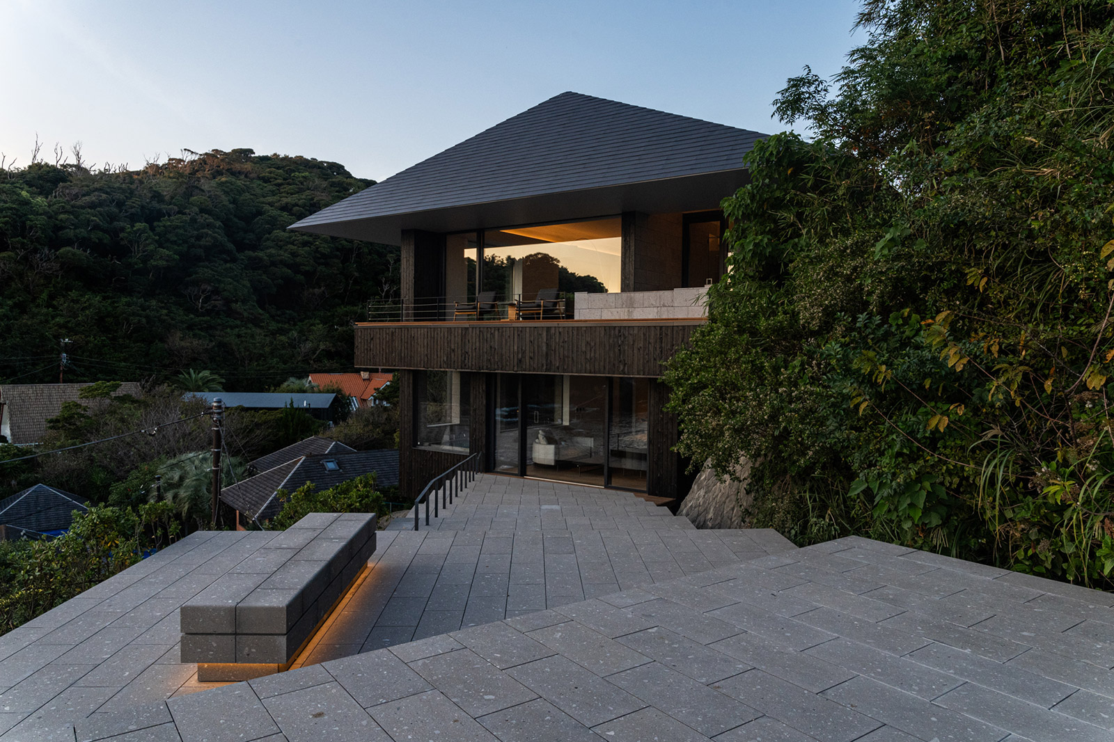 あるクリエイターのためのアトリエとその家族、ゲストのためのヴィラを、広大な国立公園の山と森林、そして太平洋に向かう一体現境をデザインしました。国立公園ゆえ、建築形態制限が強いうえに土砂災害のレッドゾーンにも掛かる中で、“作家が自然の中で自由なインスピレーションを育み、作品づくりに活かせる環境として、「INSPIRATION TRAIL」という建物内外を通る一本の道を設計しました。