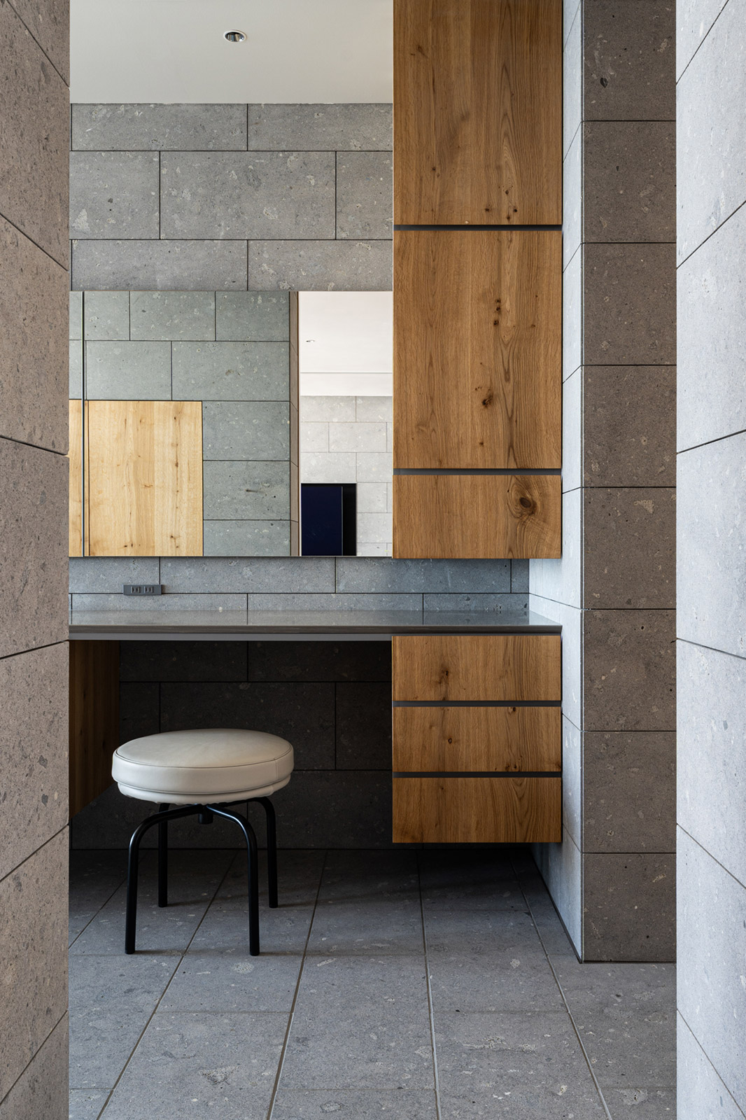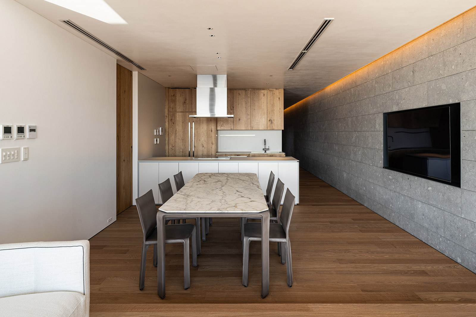 空間には札幌軟石や芦野石、無垢のナラ材など本物の素材を使用しているため、家具には最高品質のクオリティが必要であるし、クライアントの希望もあり、メインの置き家具は世界で最も耐久性と美しさを兼ね備えたイタリア製としました。ダイニングテーブル・チェア・リビングソファ・ローテーブル・寝室ラウンジチェア・ベッドがそのものです。