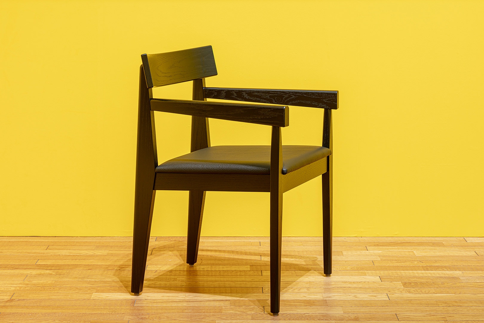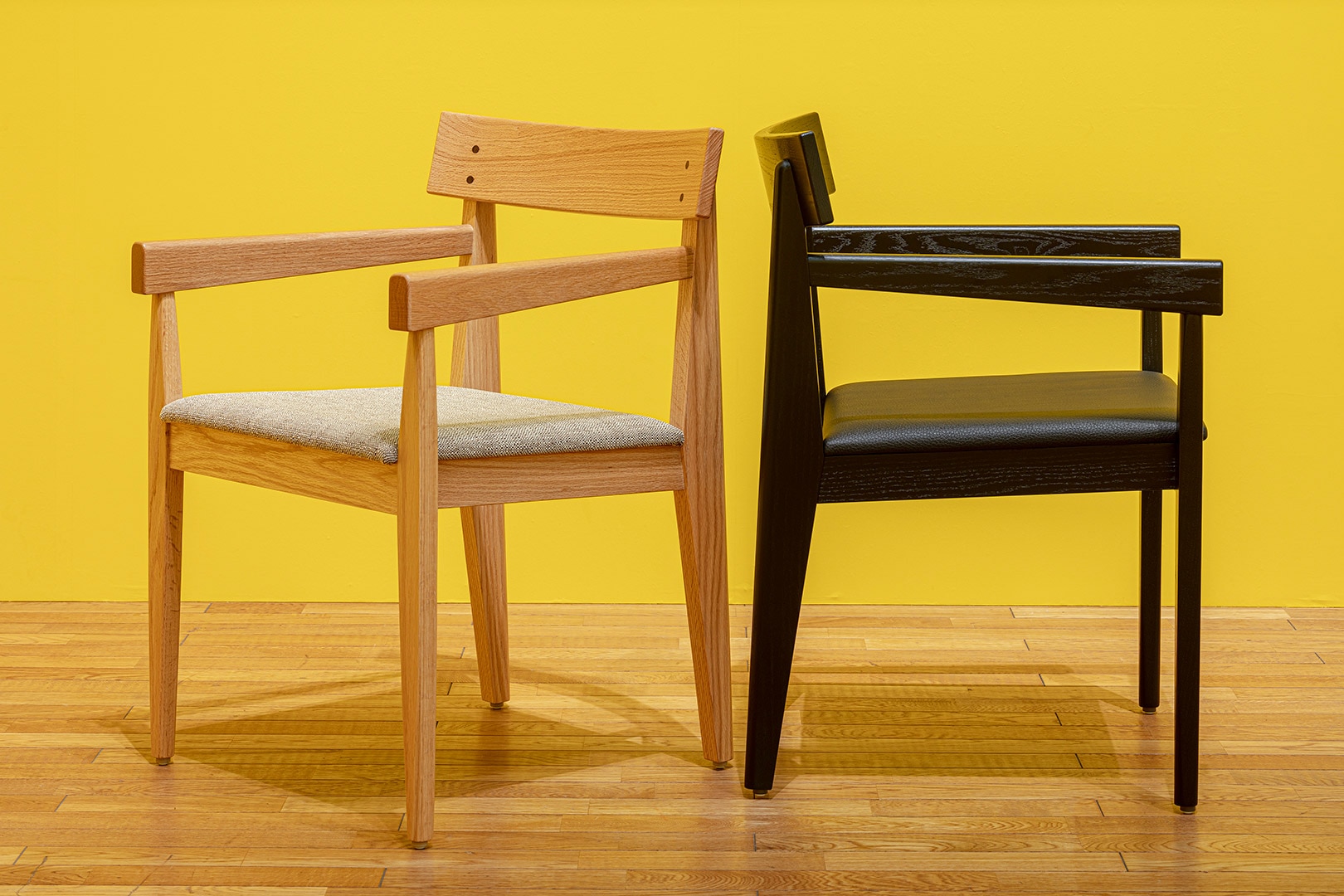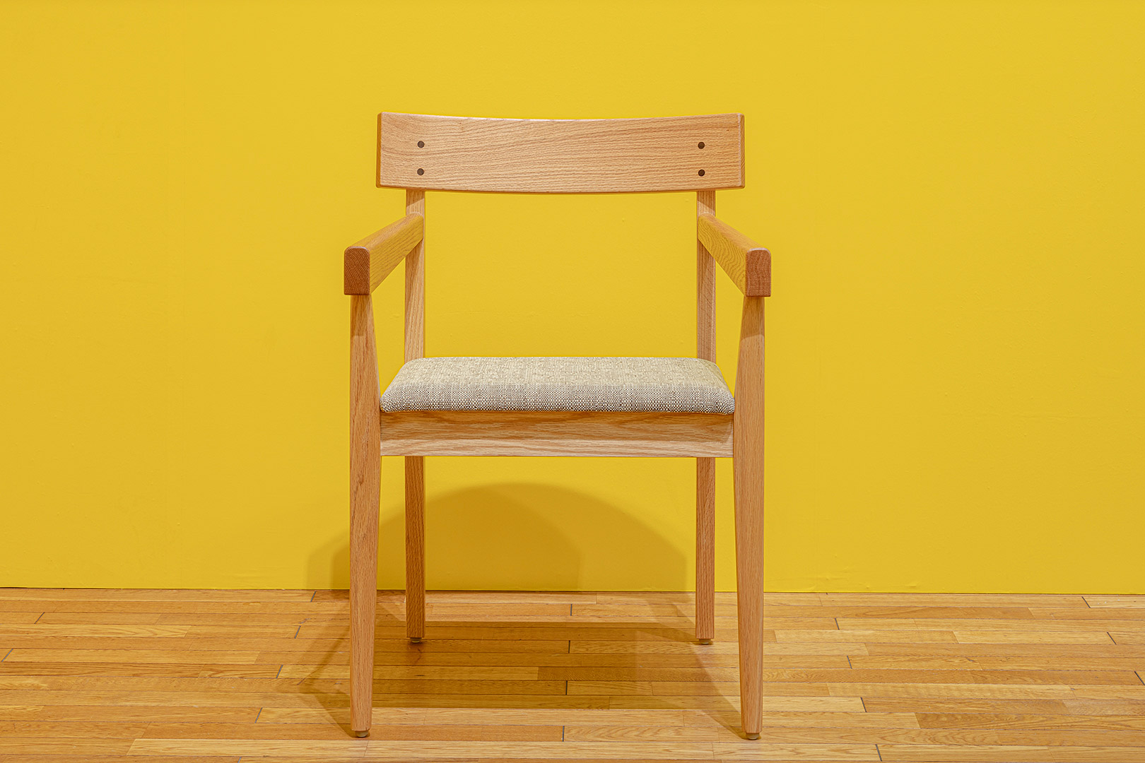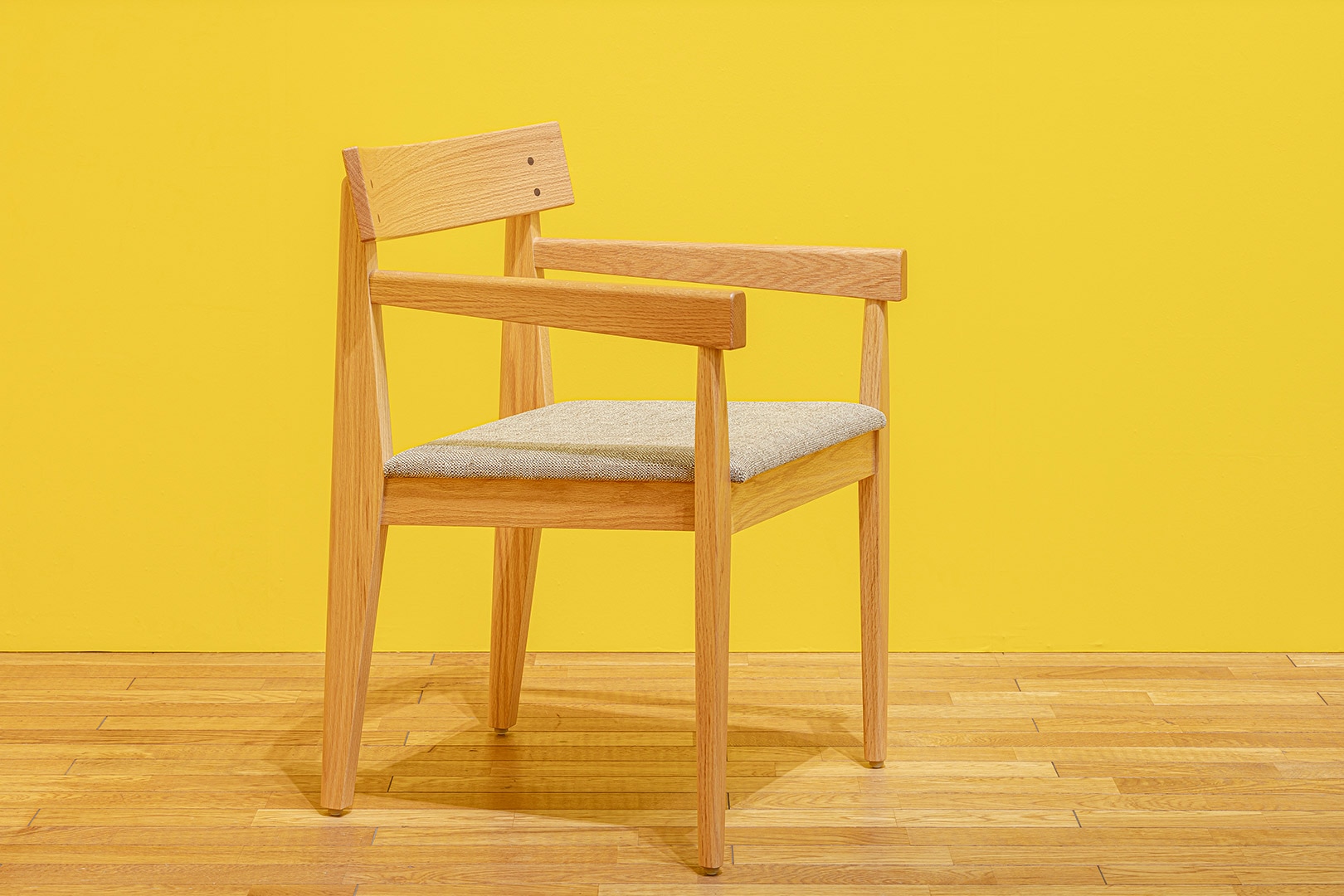 展示に使用した椅子は、木製オリジナルチェアの「arrow chair」である。矢印のような三角形の四本足とひじ掛けから名付けたこの椅子は、後脚を90 度振った前脚が特徴的な椅子である。座った時に体に触れる部分は全て丸みを付けることで座り心地を良くし、椅子が壊れないように新JIS規格の区分5相当(公共施設用に求められる強度・耐久性)を確保した。
