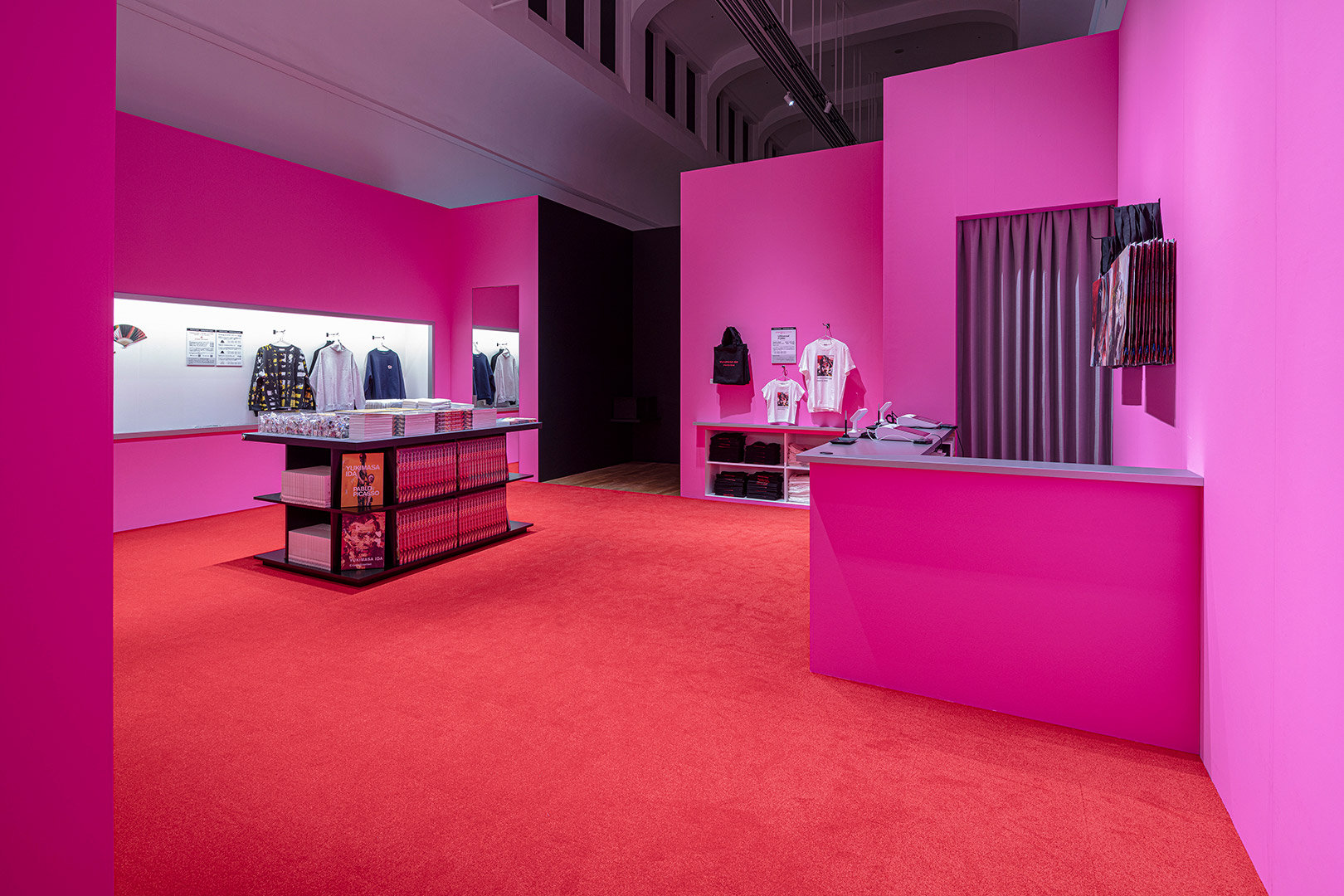 展示を鑑賞した後は、ショップへと移る。ここでは、丁寧に作られたグッズ一つ一つを額に入った作品のようにディスプレイした。ピンクで仕上げられた壁は来館者の気分を高揚させ、作品のようなグッズの鑑賞や買い物を楽しむ。